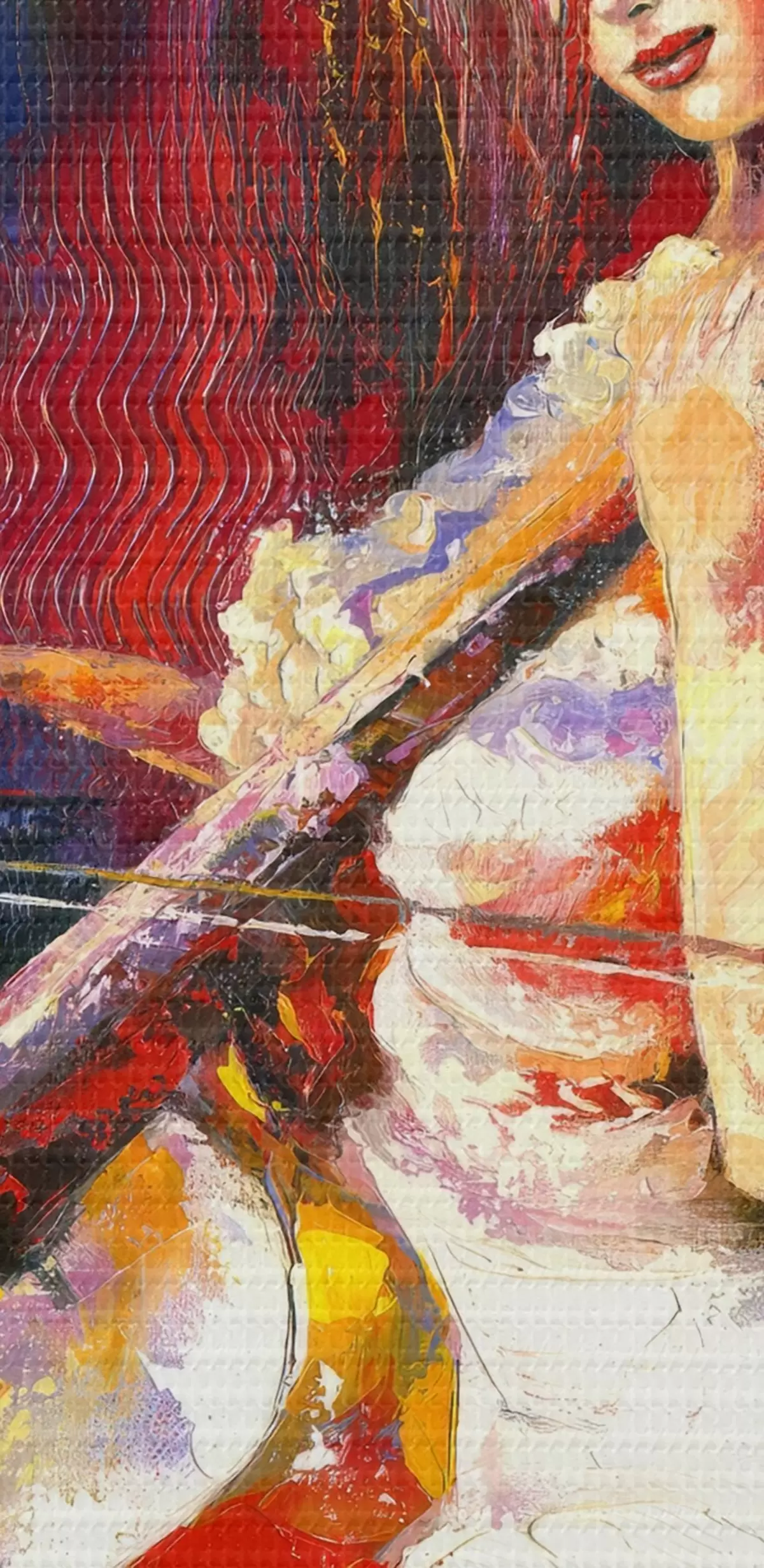 Smalkais diegu pinums uz šī audekla atgādina profesionālu mākslinieku audeklu virsmu.