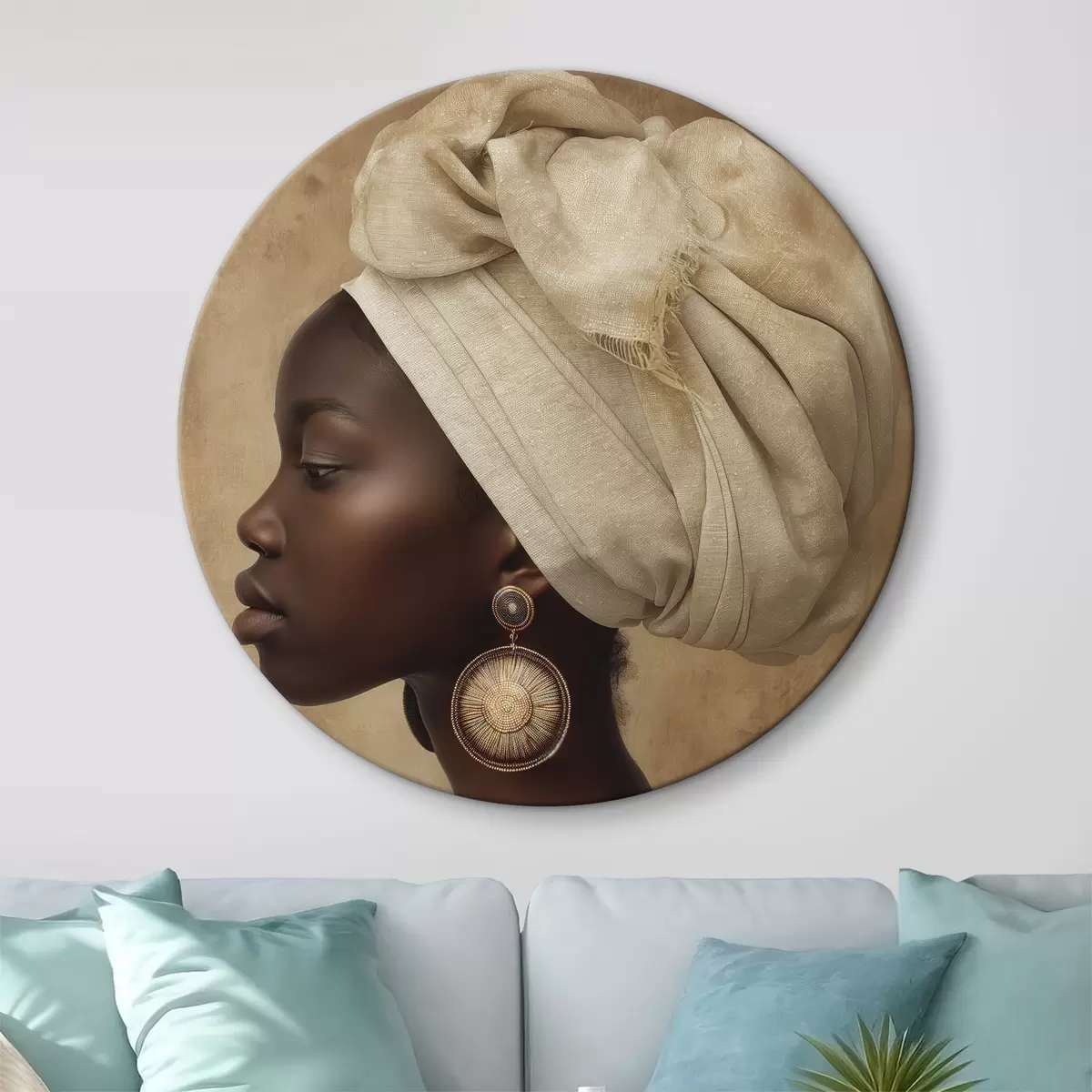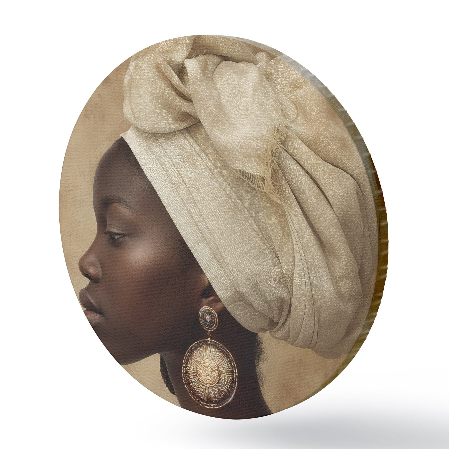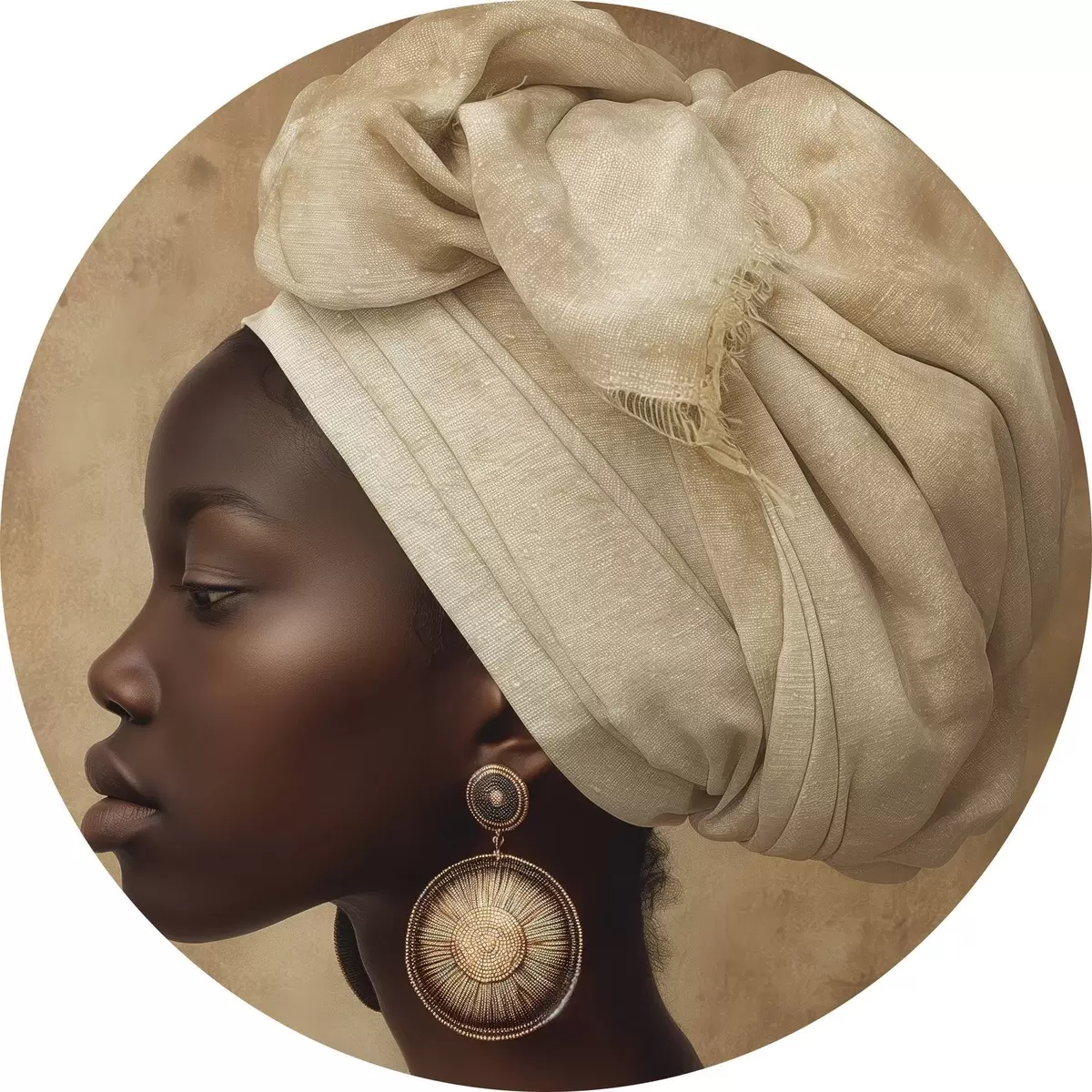 Apaļas gleznas bēšs sievietes portrets afrikāņu stilā profilā ar lieliem auskariem r26120