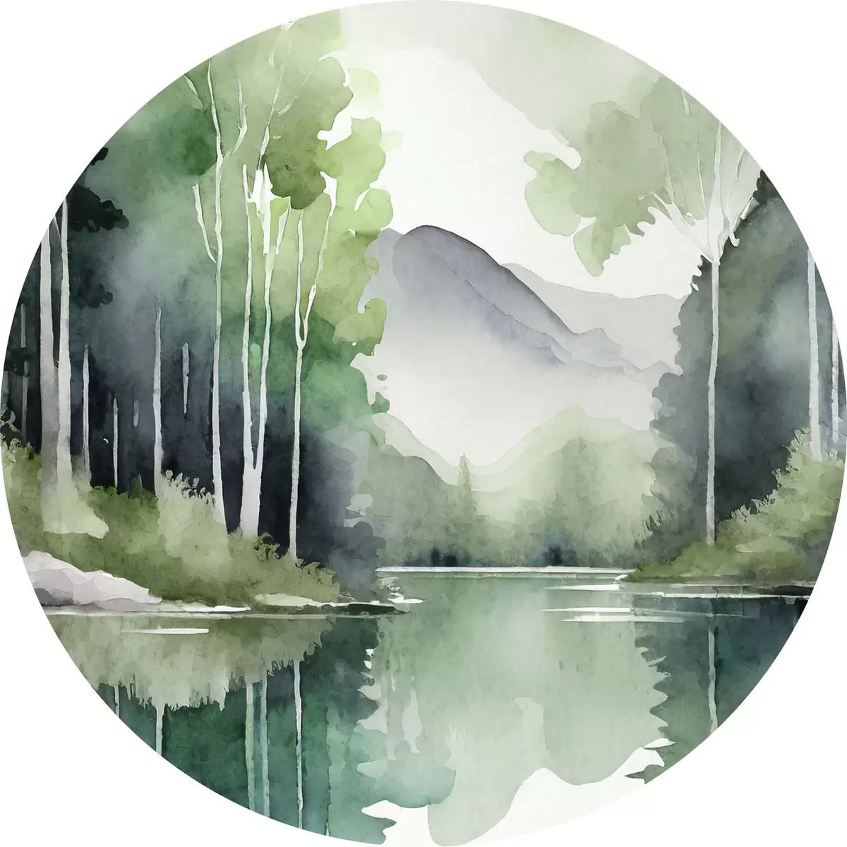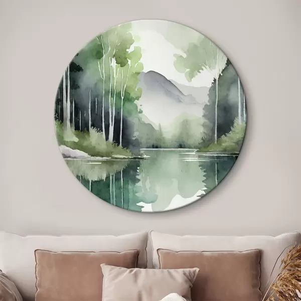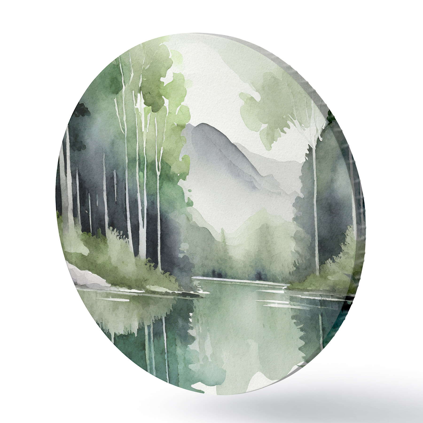 Apaļas gleznas Akvareļu ainava ezera un meža, pavasaris, dabiski zaļas, maigas krāsas r36503