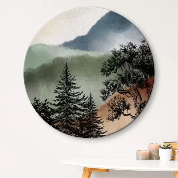 Apaļas gleznas Akvarelis ar kalniem un kokiem r36604
