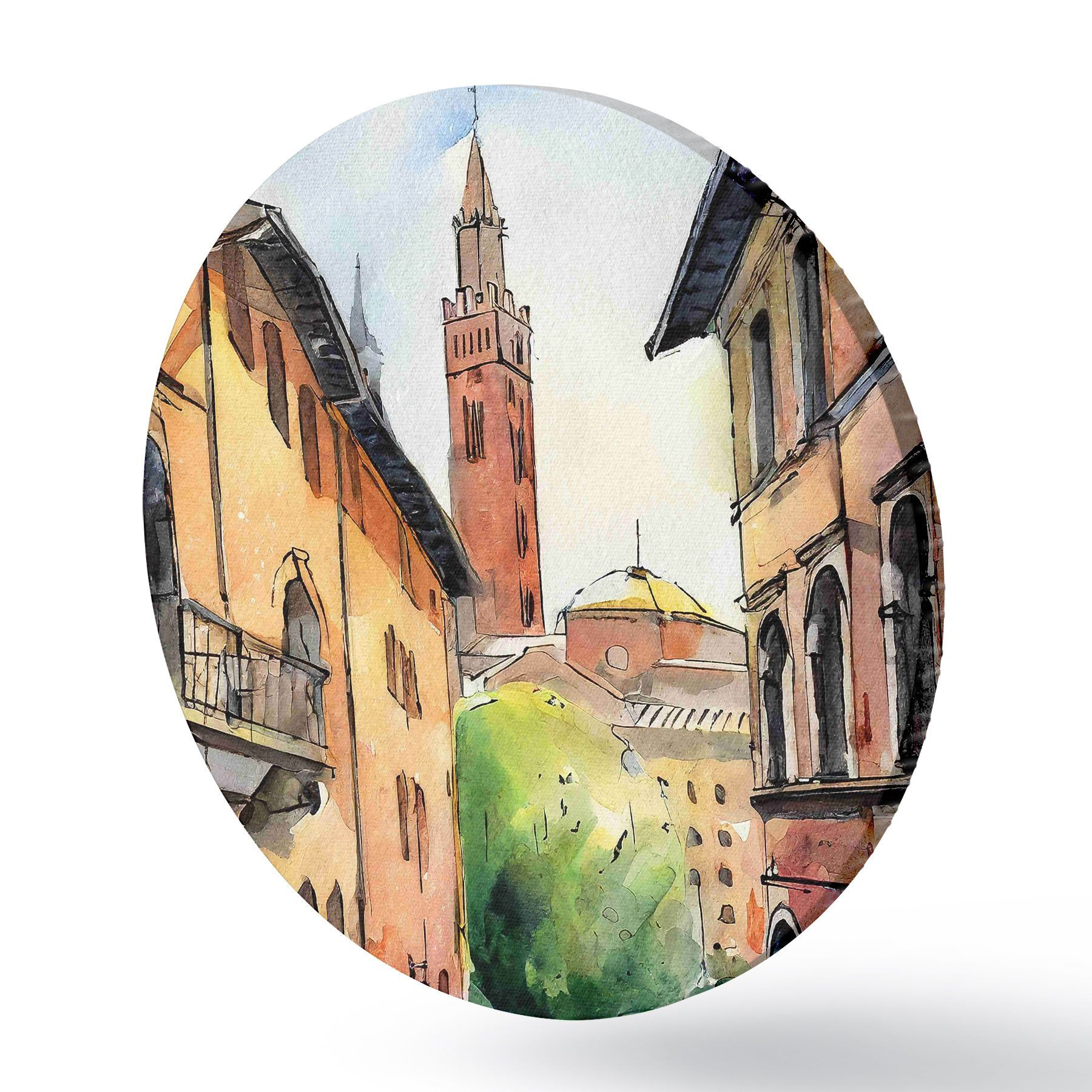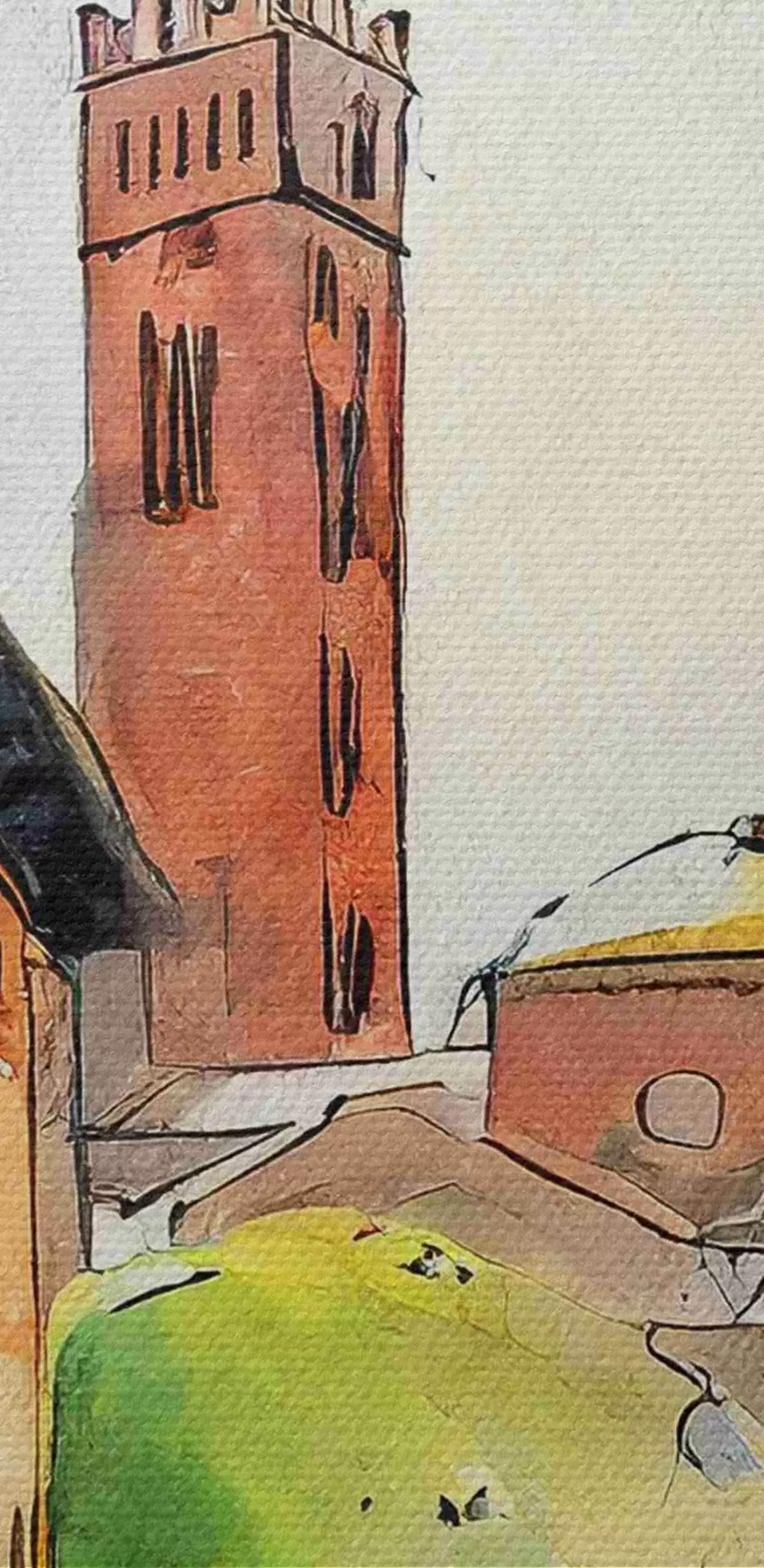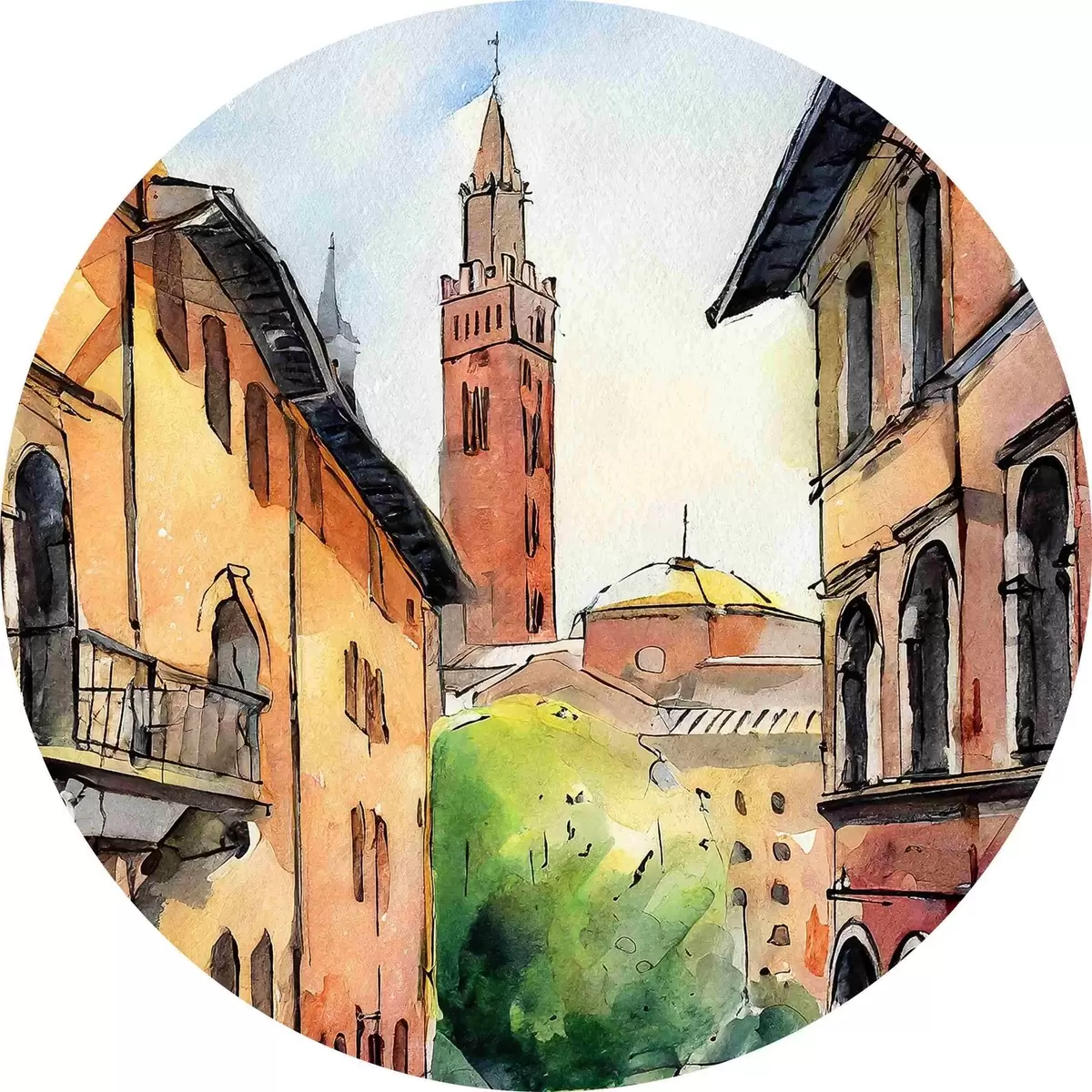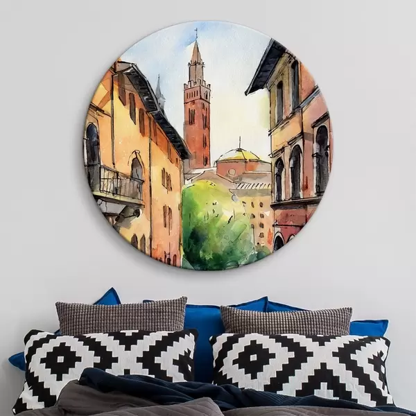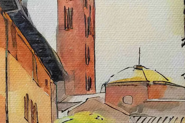Attēls Akvareļgleznojums, kurā attēlota iela ar ēkām un kokiem Nr r36684