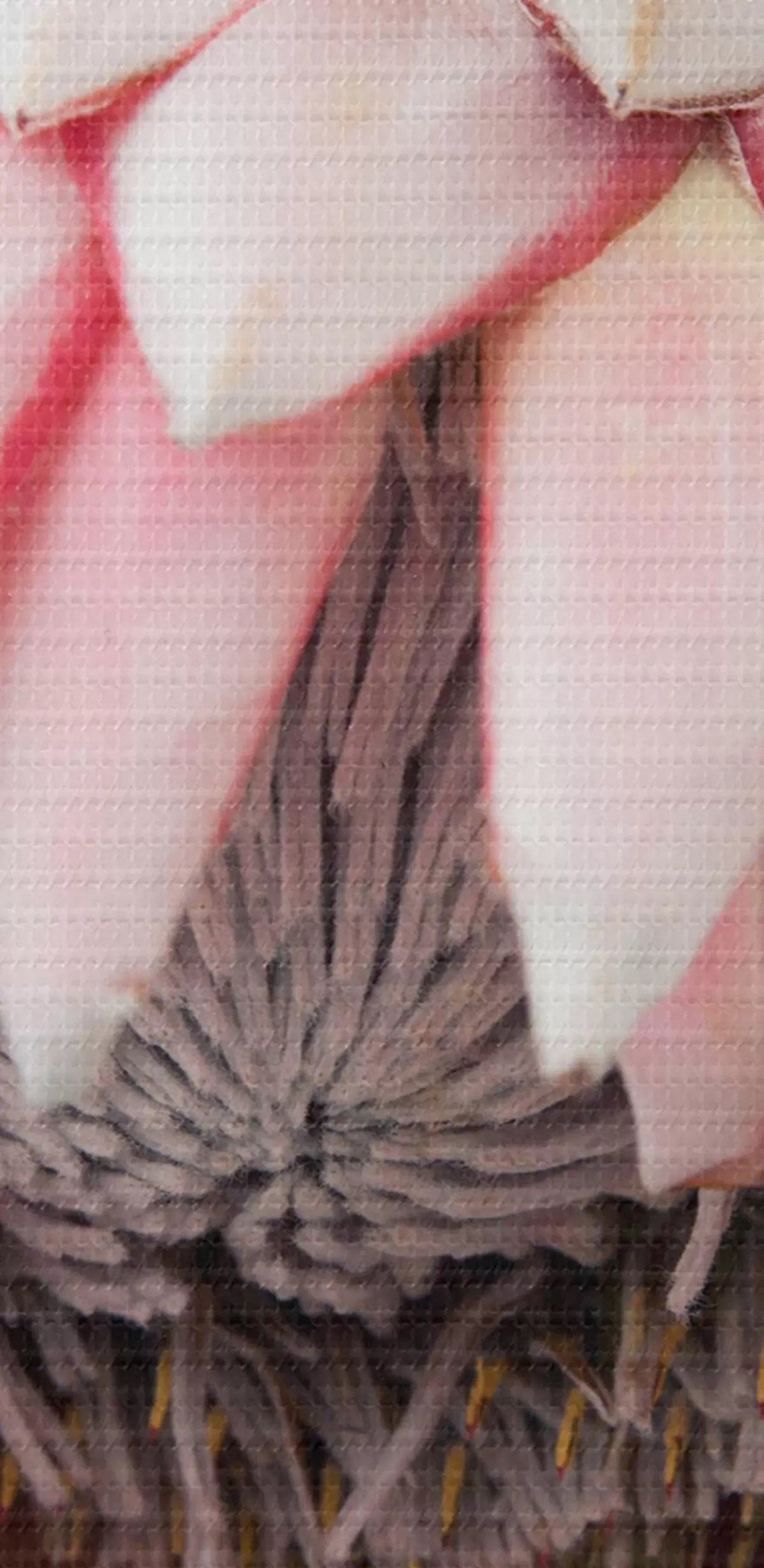 Smalkais diegu pinums uz šī audekla atgādina profesionālu mākslinieku audeklu virsmu.