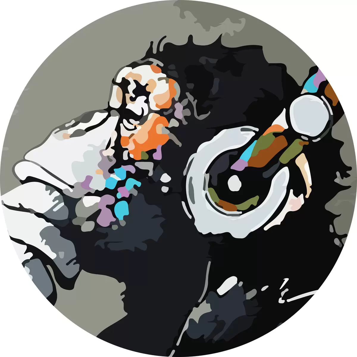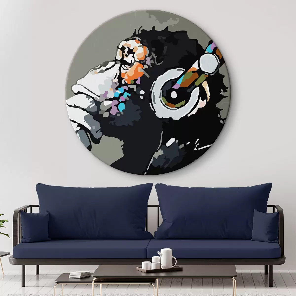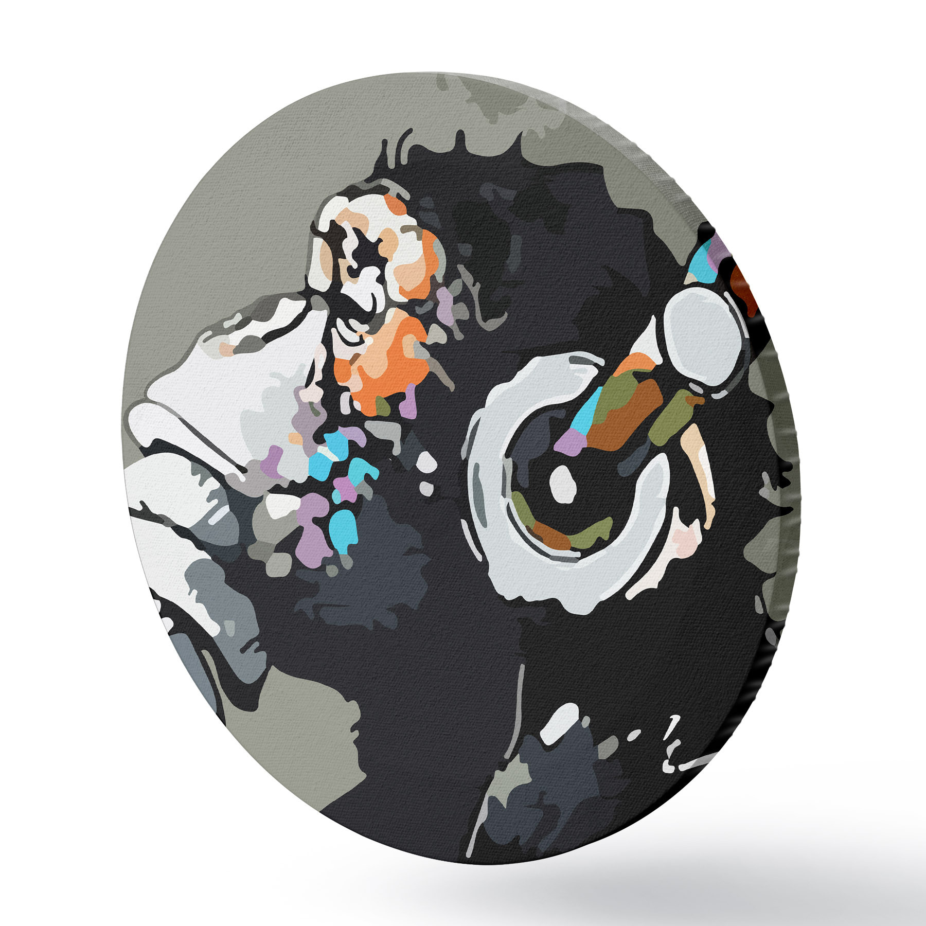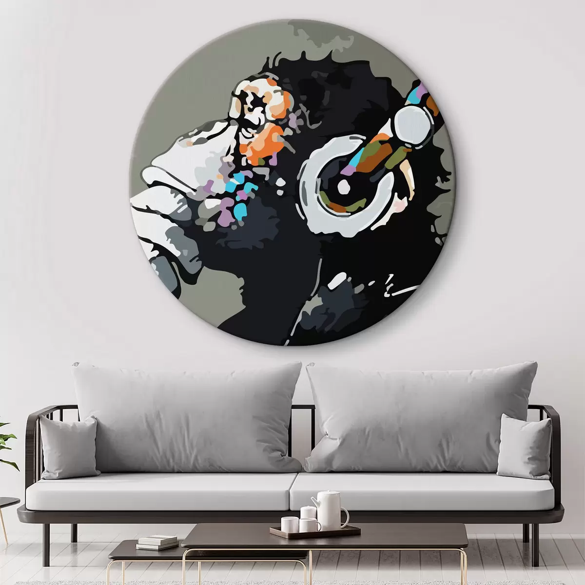 Apaļas gleznas Pērtiķis austiņās uz pelēka fona r37269