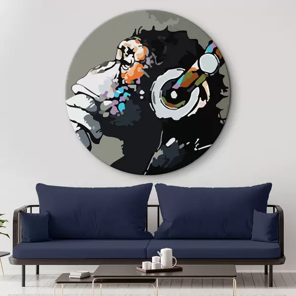 Apaļas gleznas Pērtiķis austiņās uz pelēka fona r37269