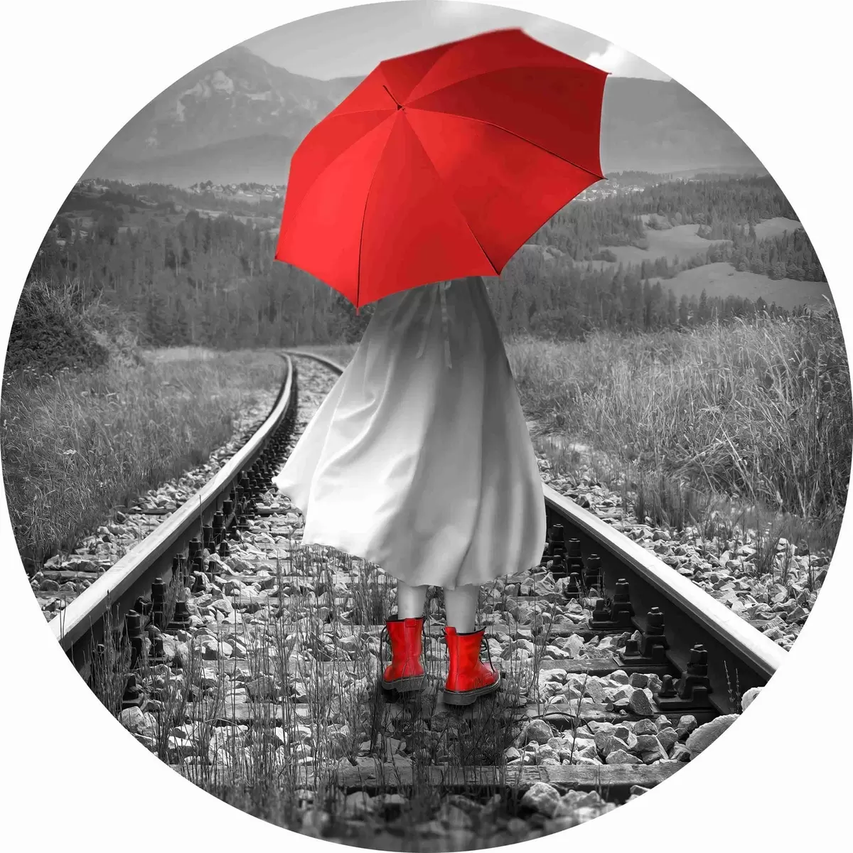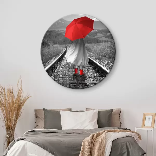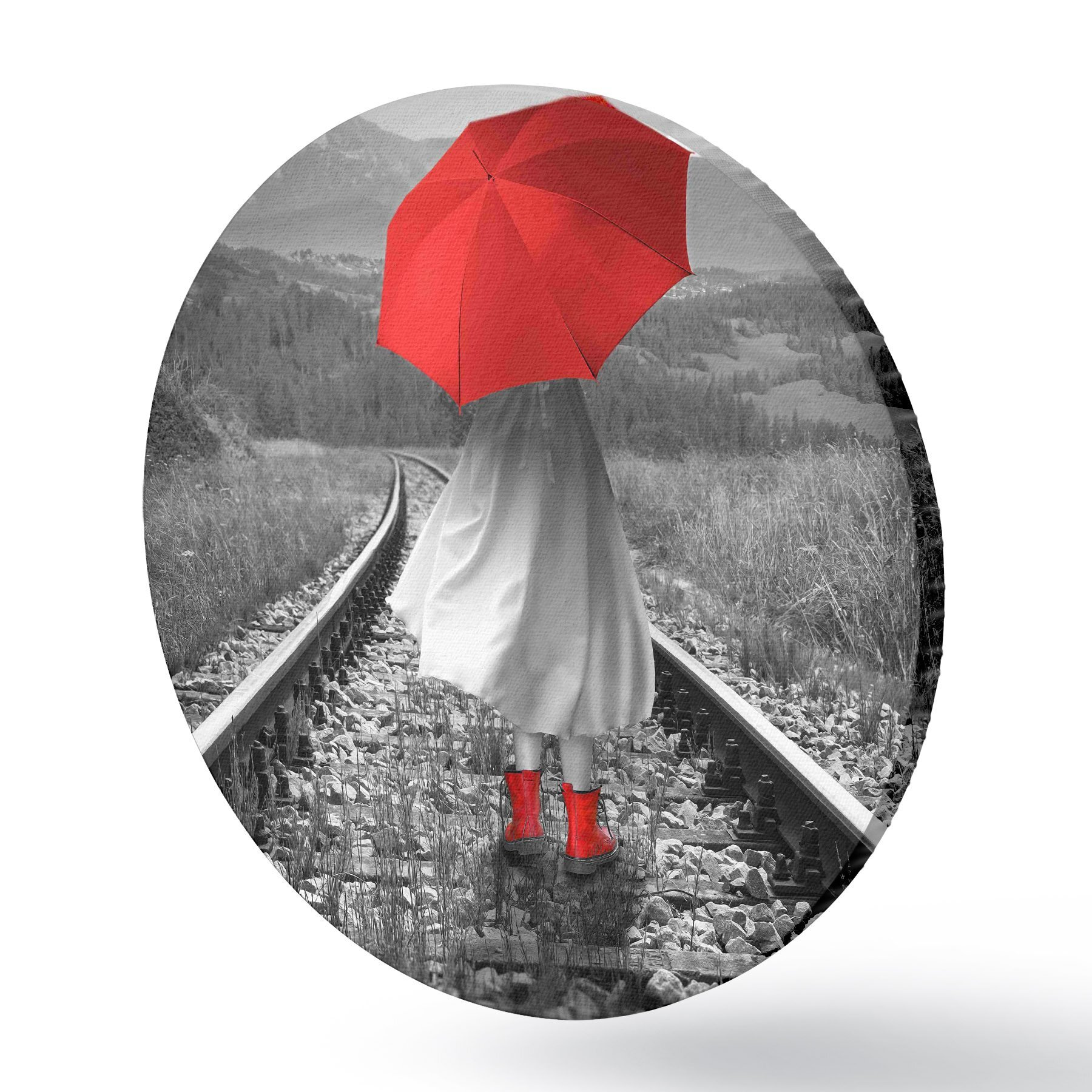 Apaļas gleznas Persona ar sarkanu lietussargu uz dzelzceļa sliedēm r37301