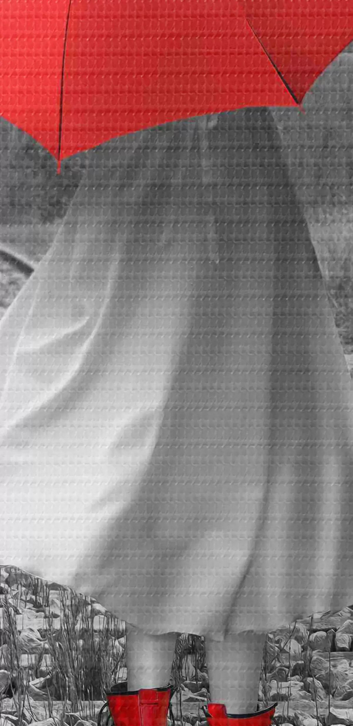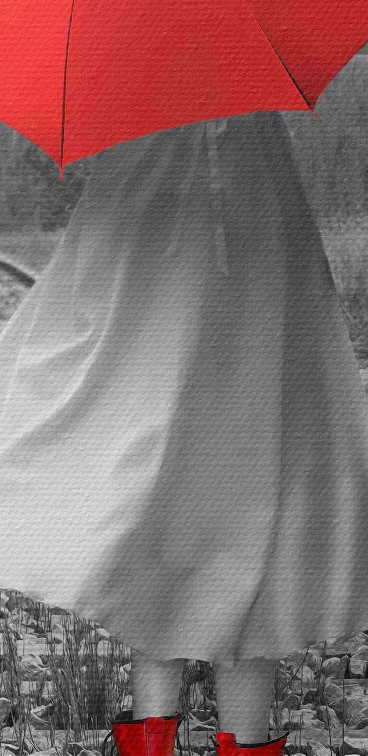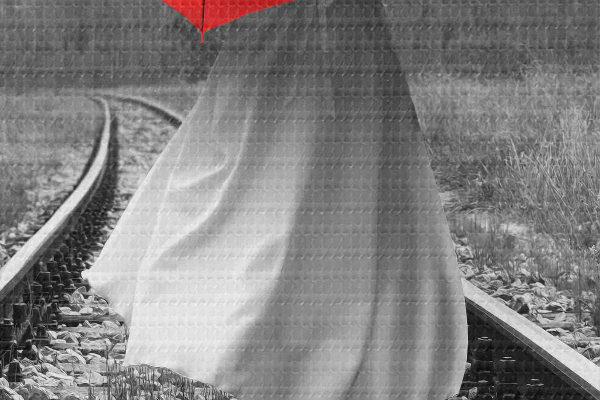 Attēls Persona ar sarkanu lietussargu uz dzelzceļa sliedēm Nr r37301