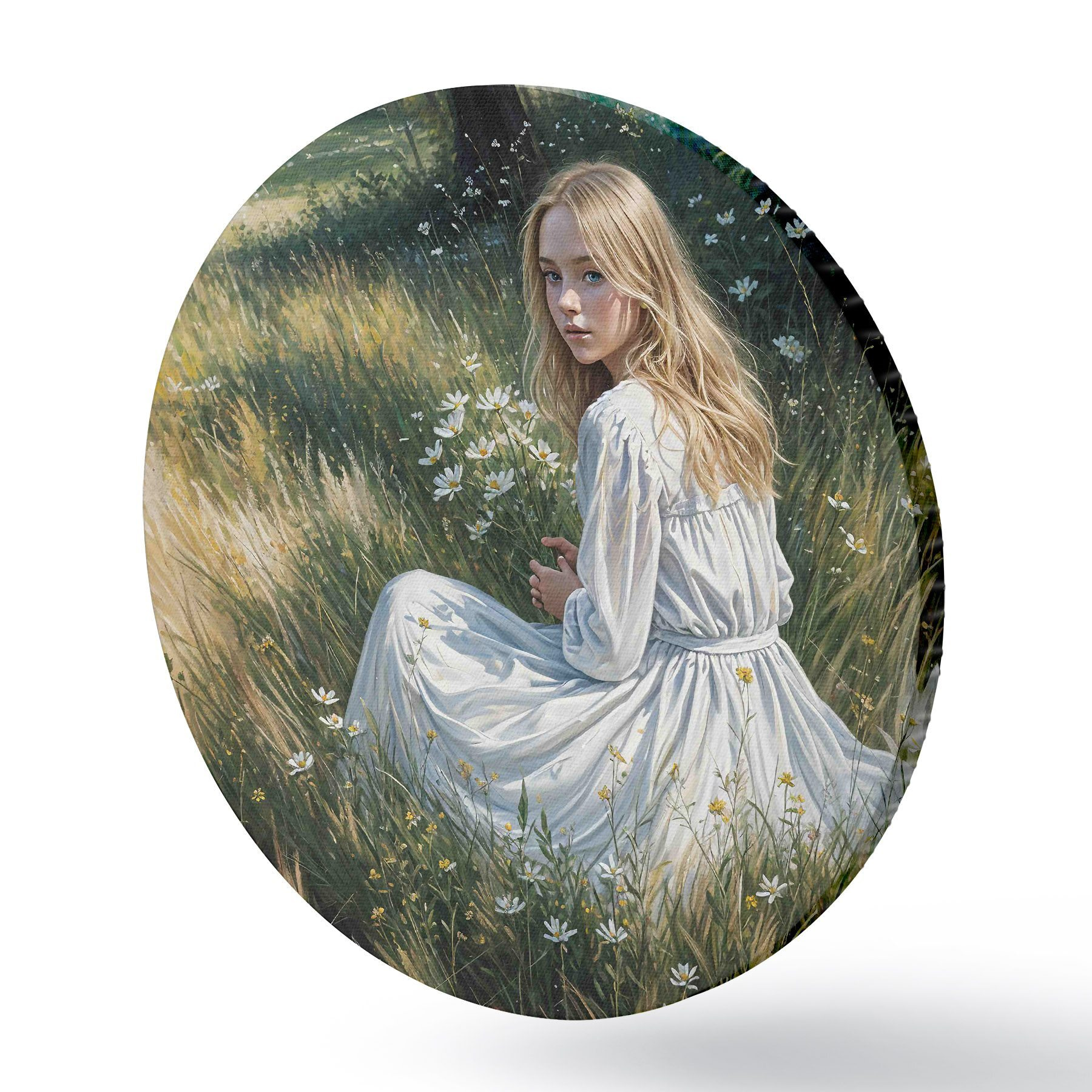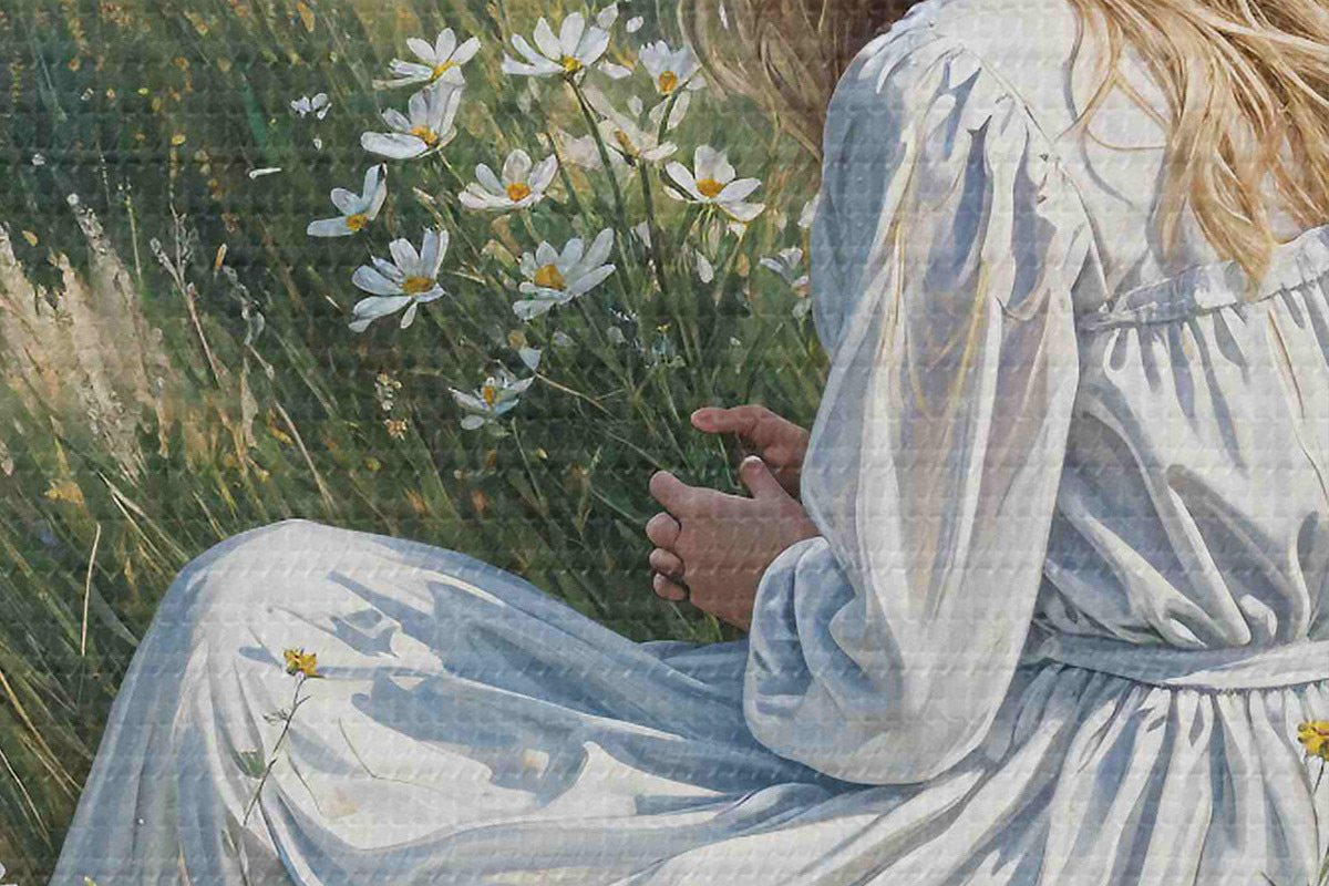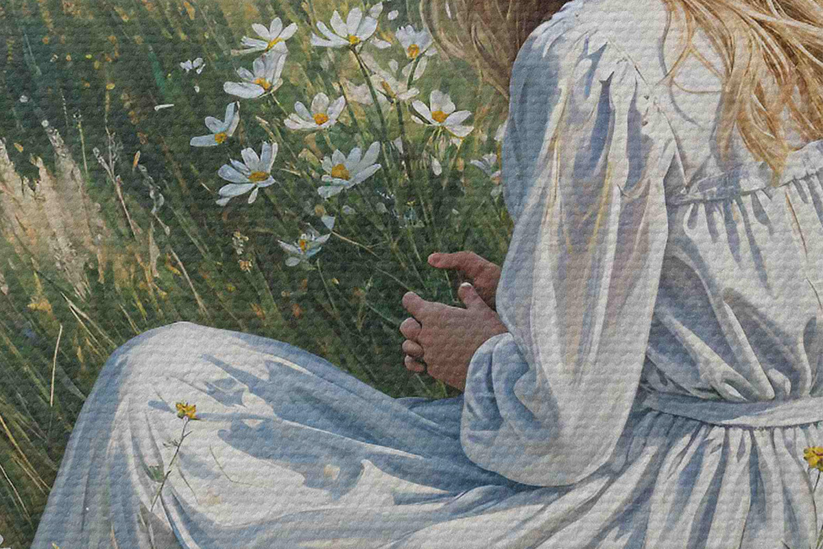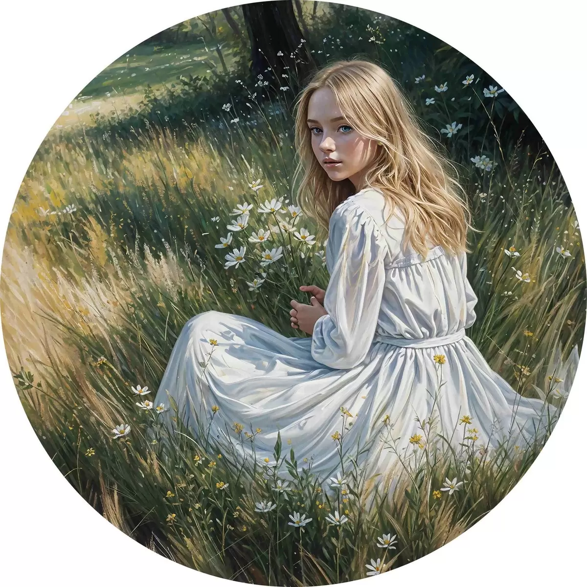 Attēls Meitene baltā kleitā sēž ziedu laukā Nr r38196