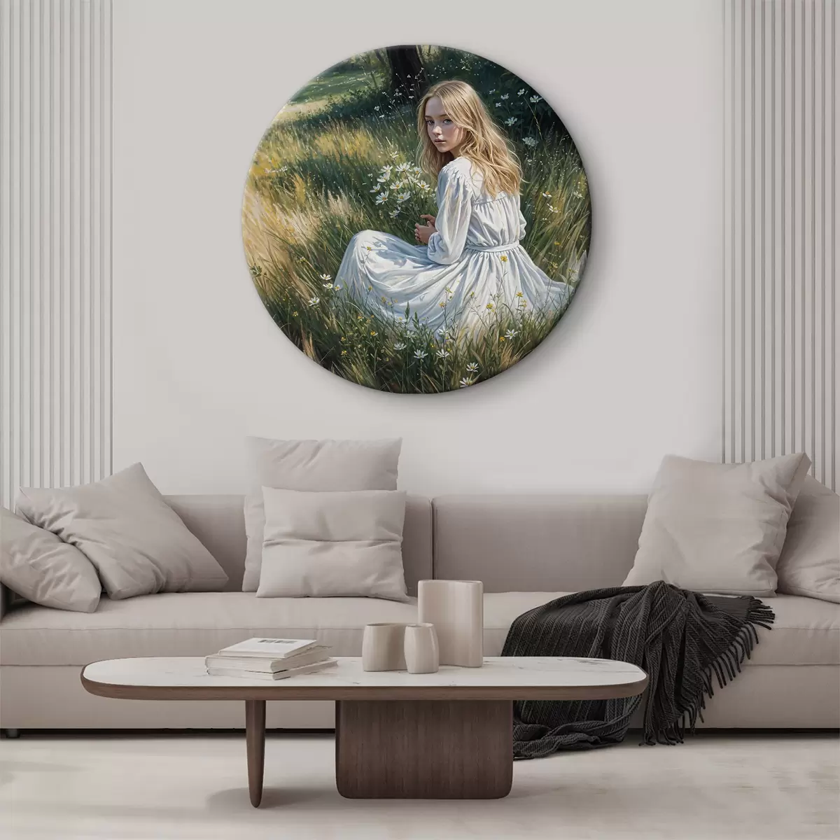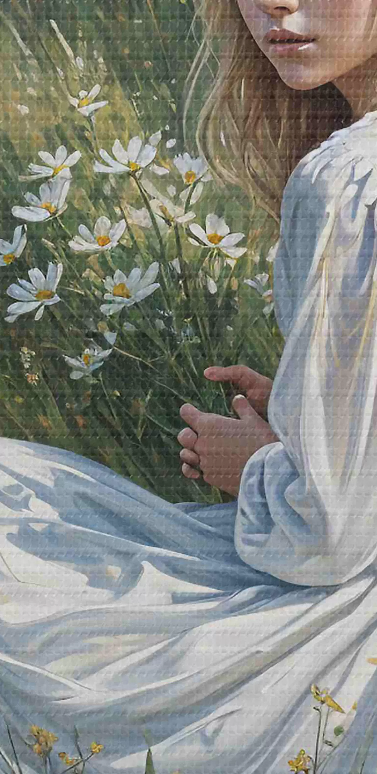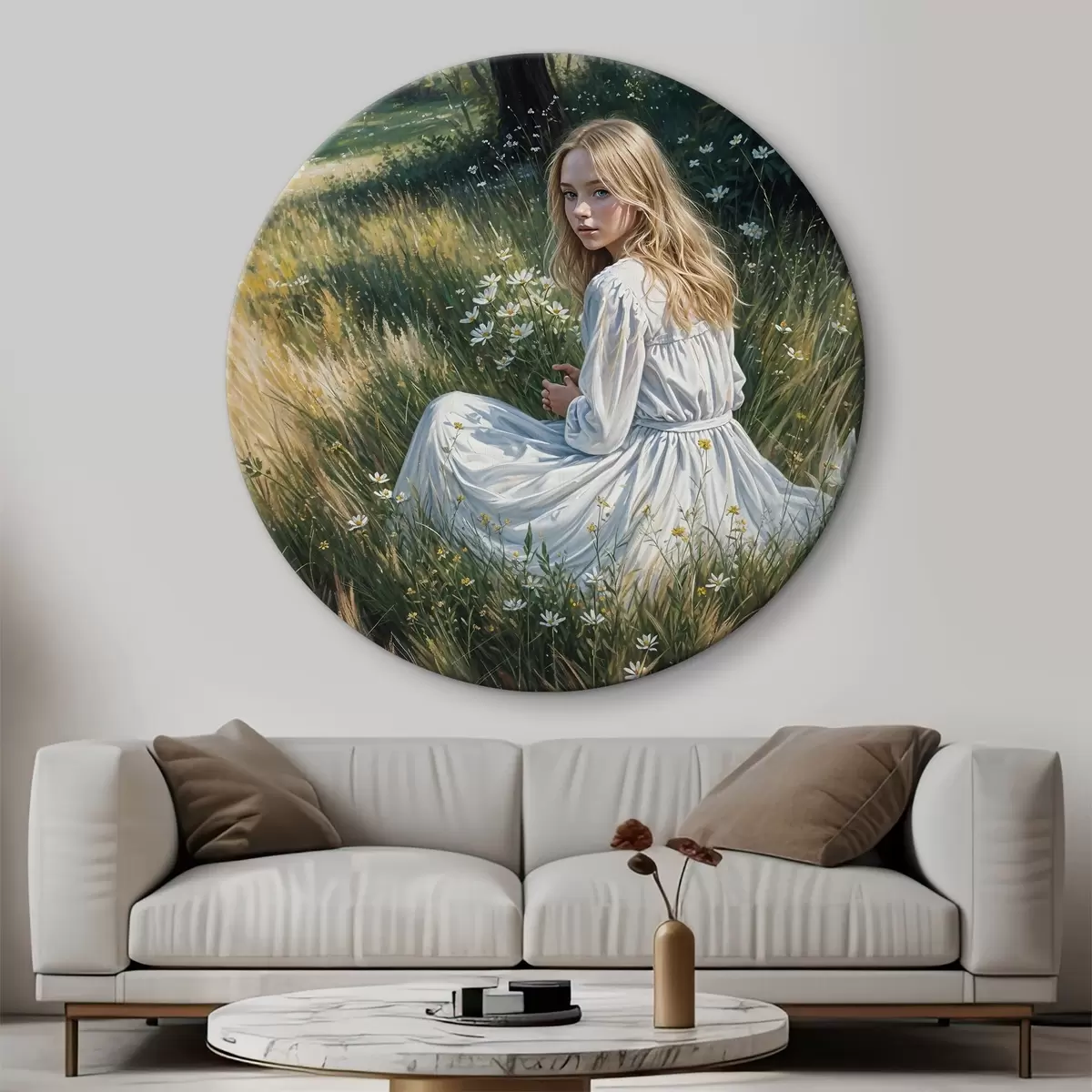 Attēls Meitene baltā kleitā sēž ziedu laukā Nr r38196