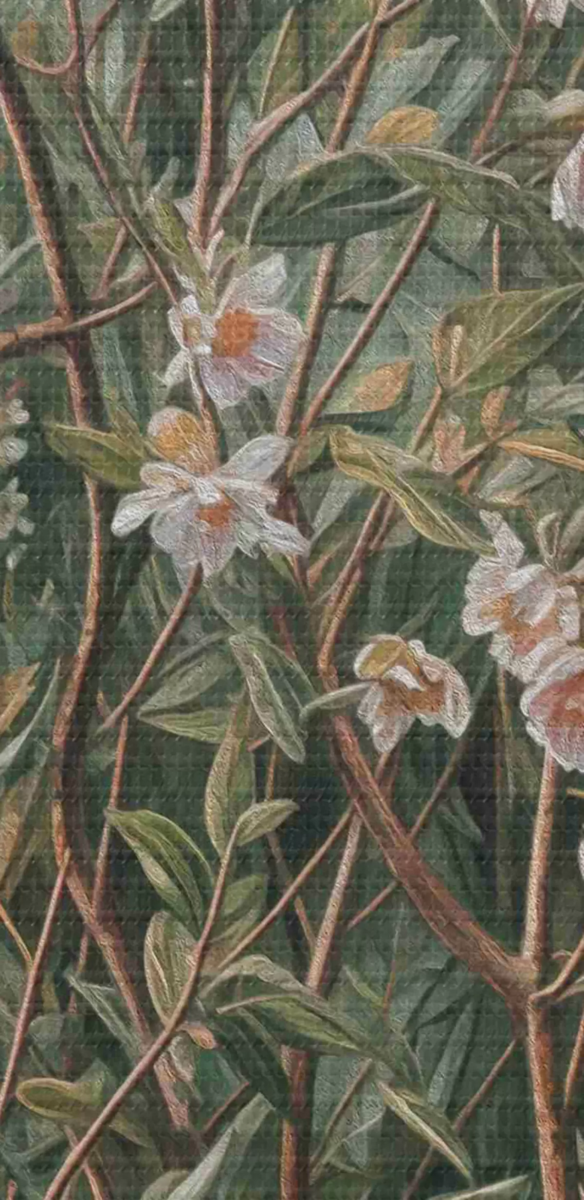 Smalkais diegu pinums uz šī audekla atgādina profesionālu mākslinieku audeklu virsmu.