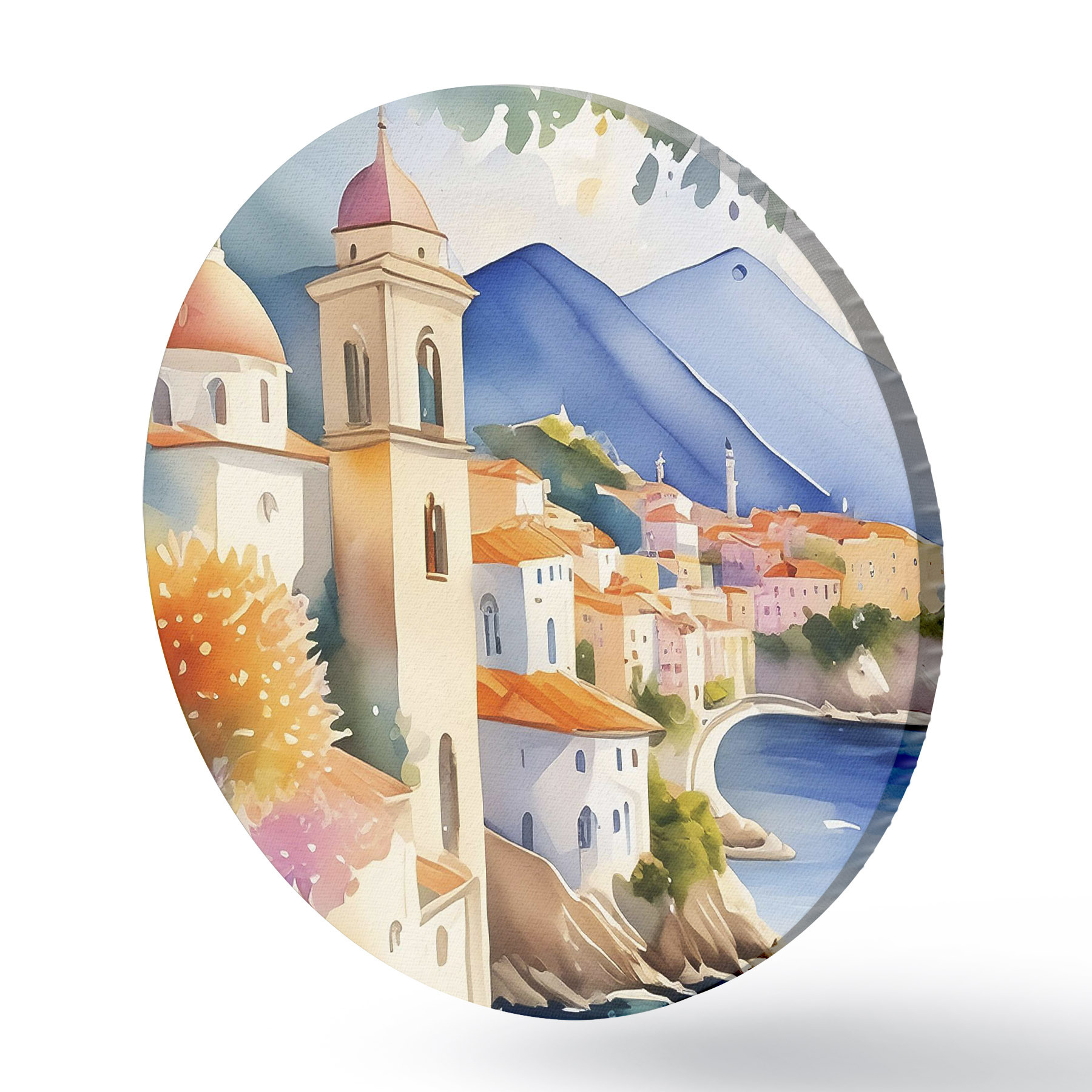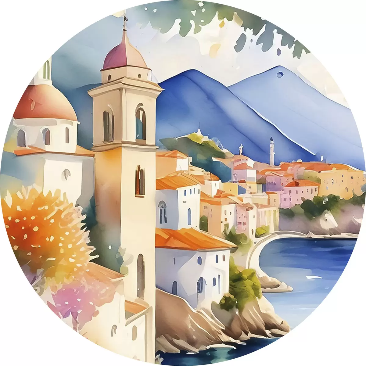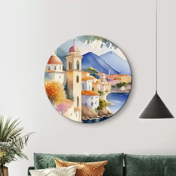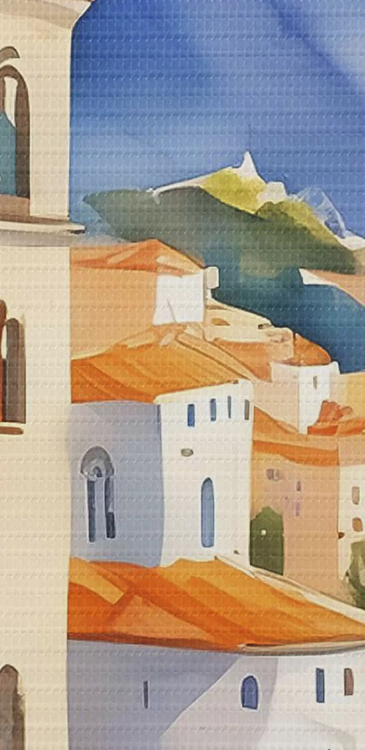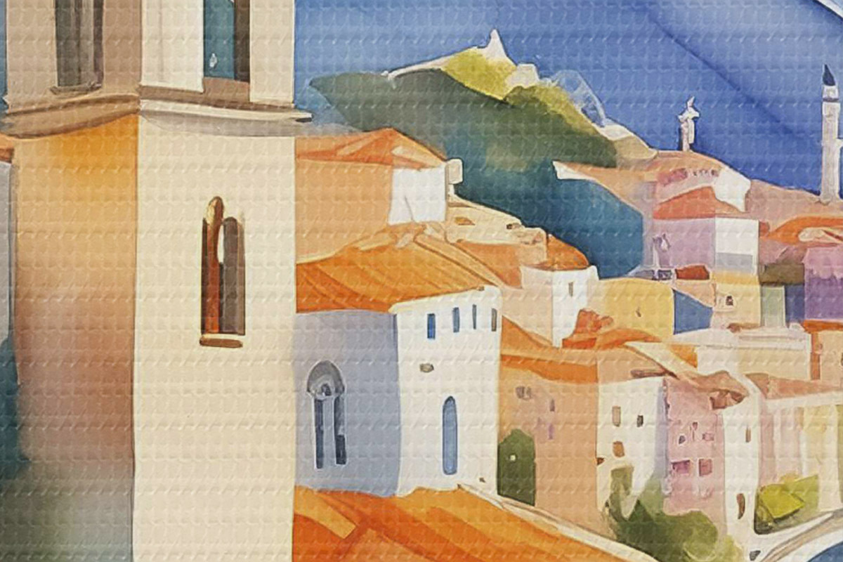 Attēls Akvarelis, kurā attēlota pilsēta uz ūdenskrātuves krasta Nr r38407