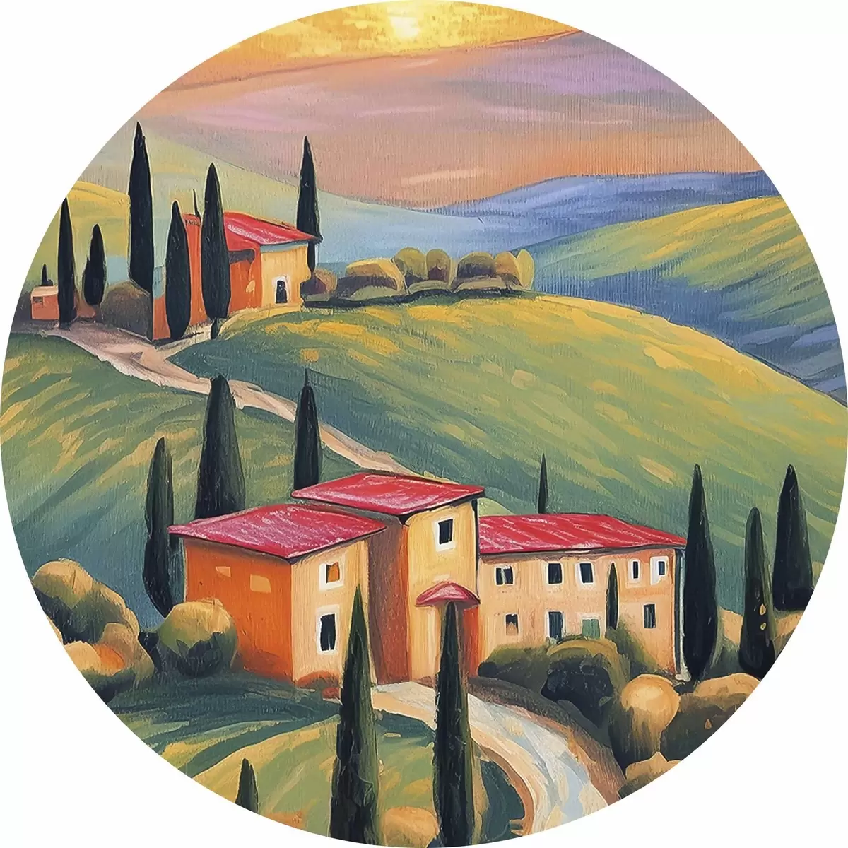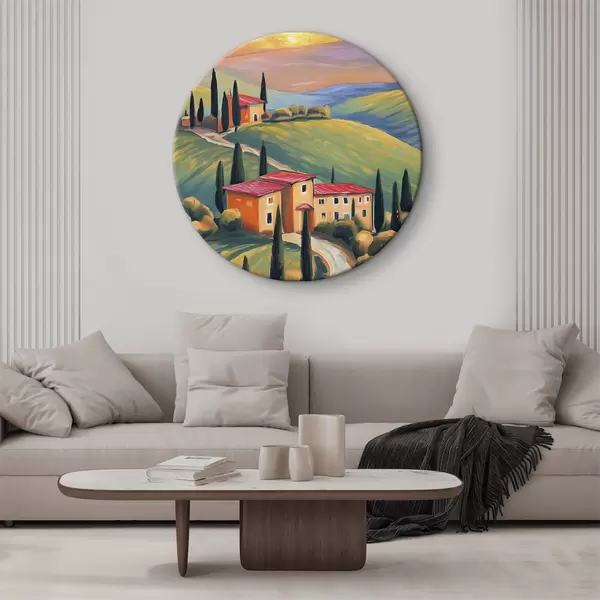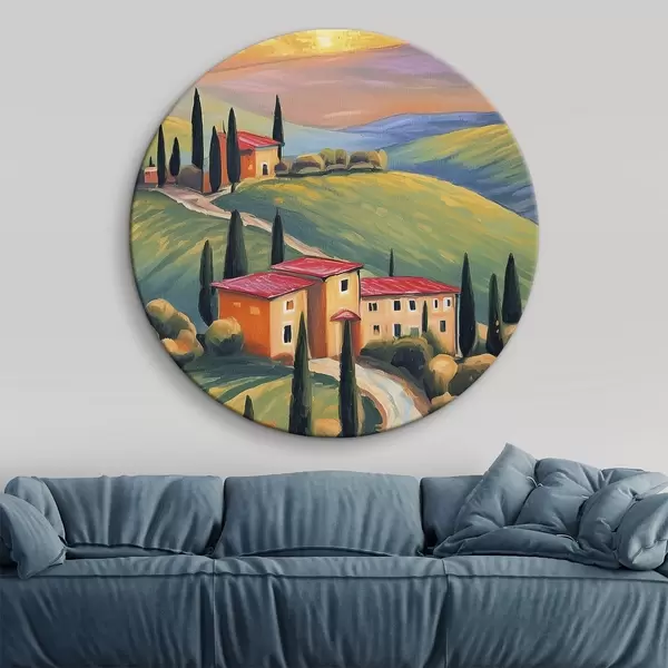 Apaļas gleznas Toskānas ainavas, Itālija, akrila māksla, vecās mājas, lauki, vasara r38488