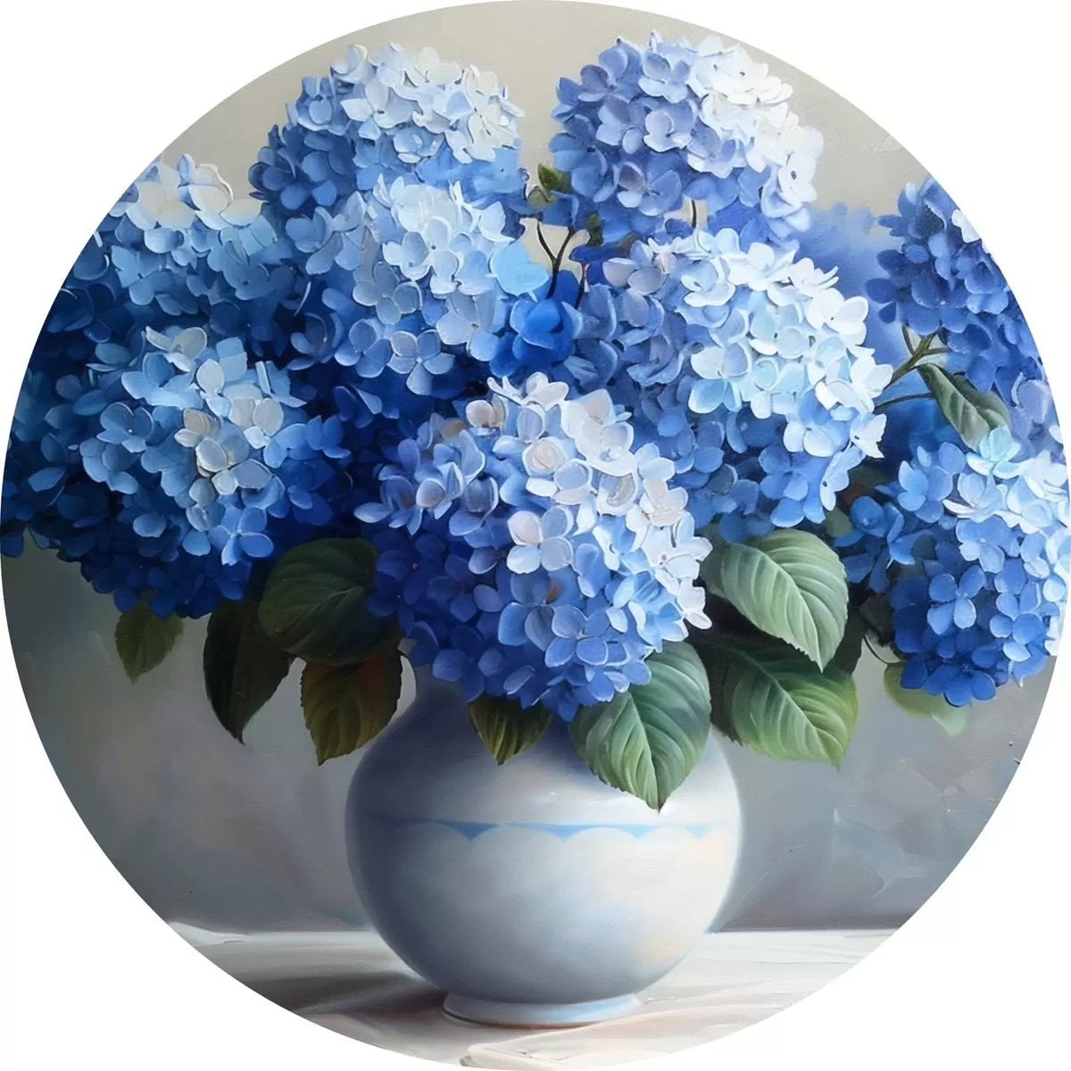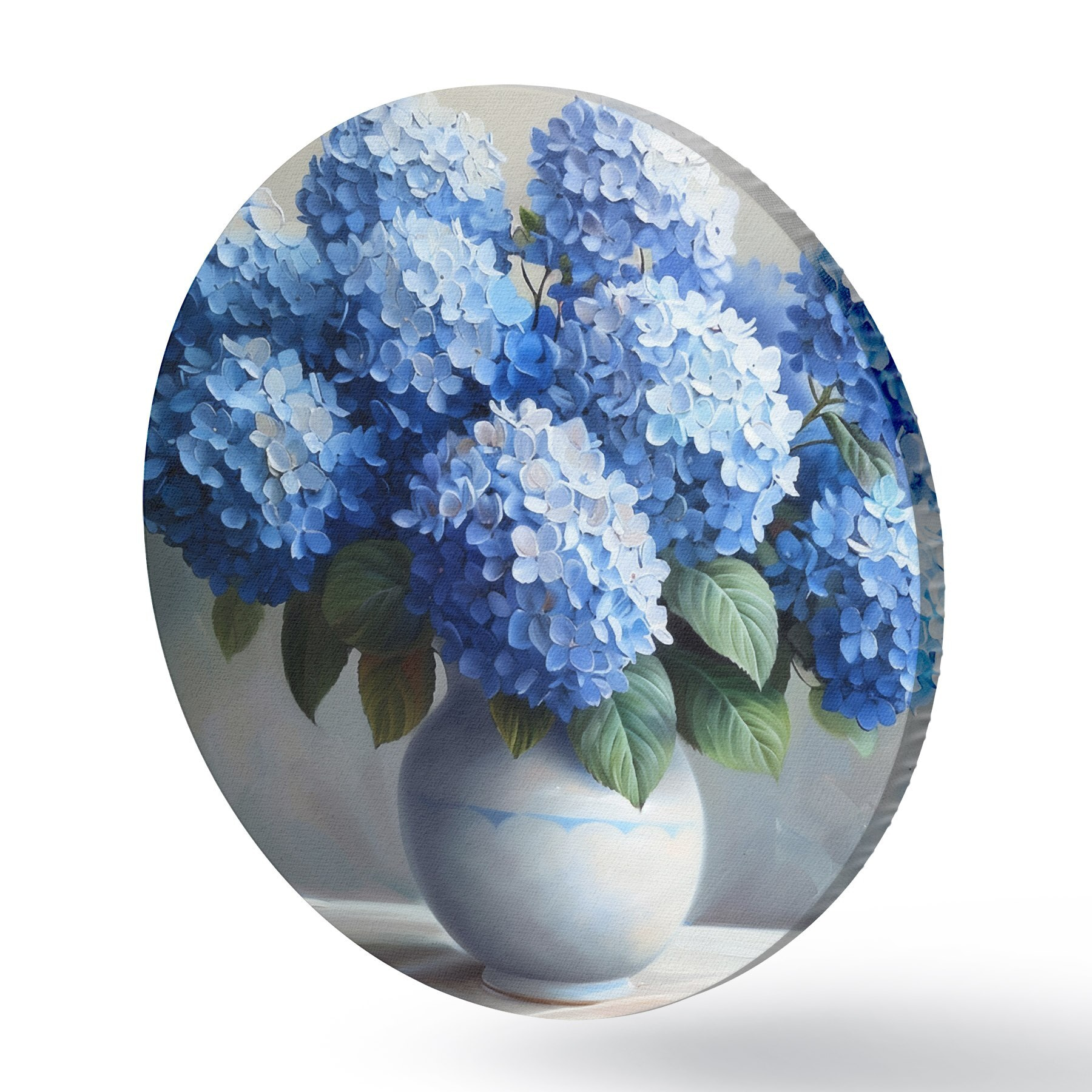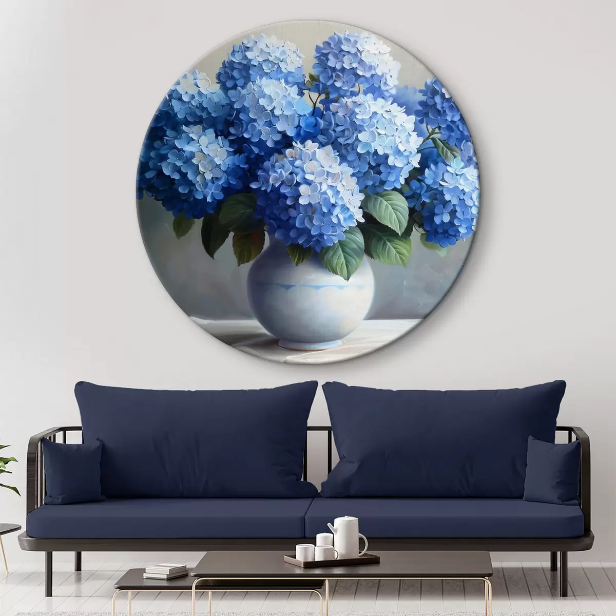 Apaļas gleznas Zilu hortenziju pušķis baltā vāzē r38696