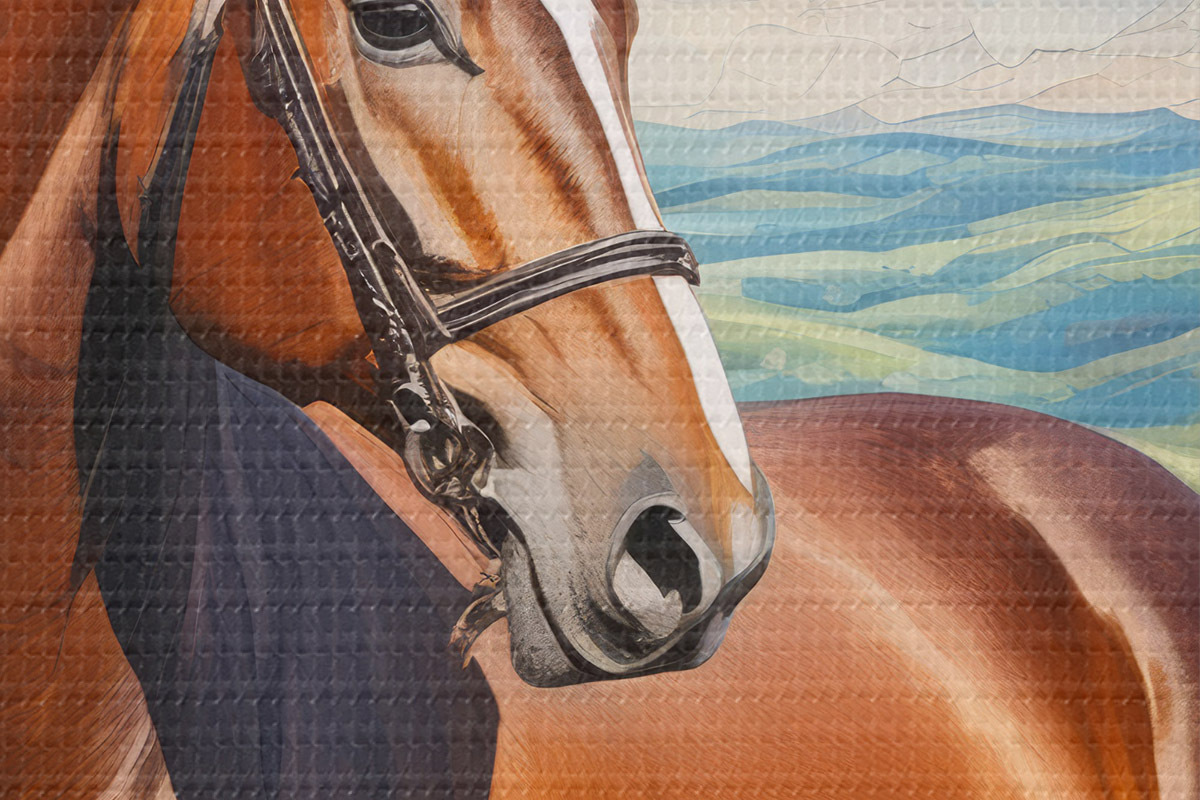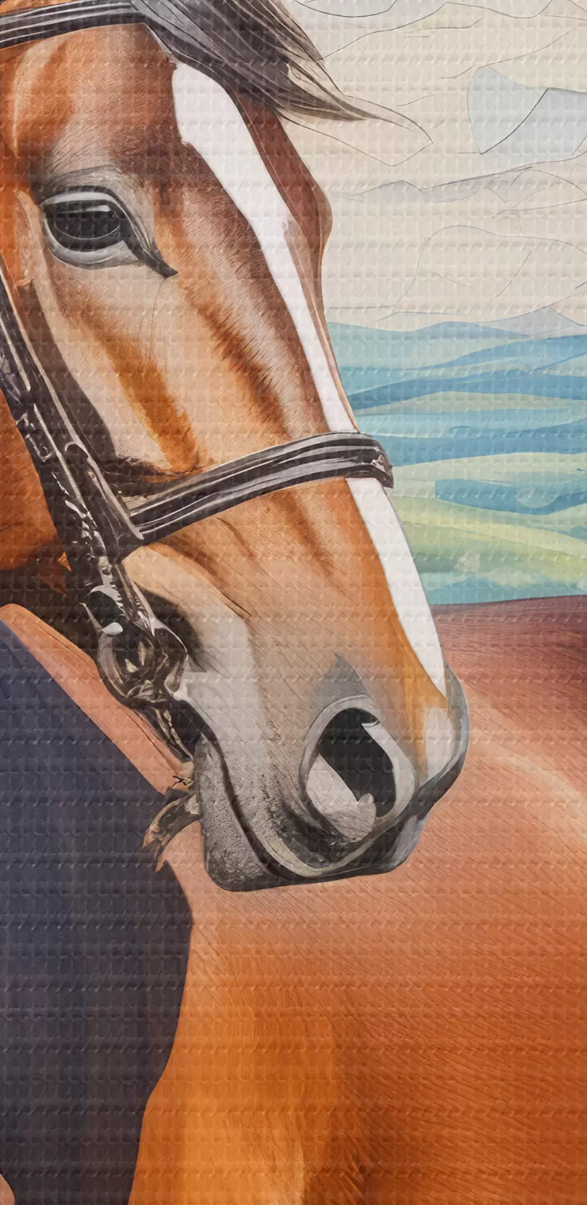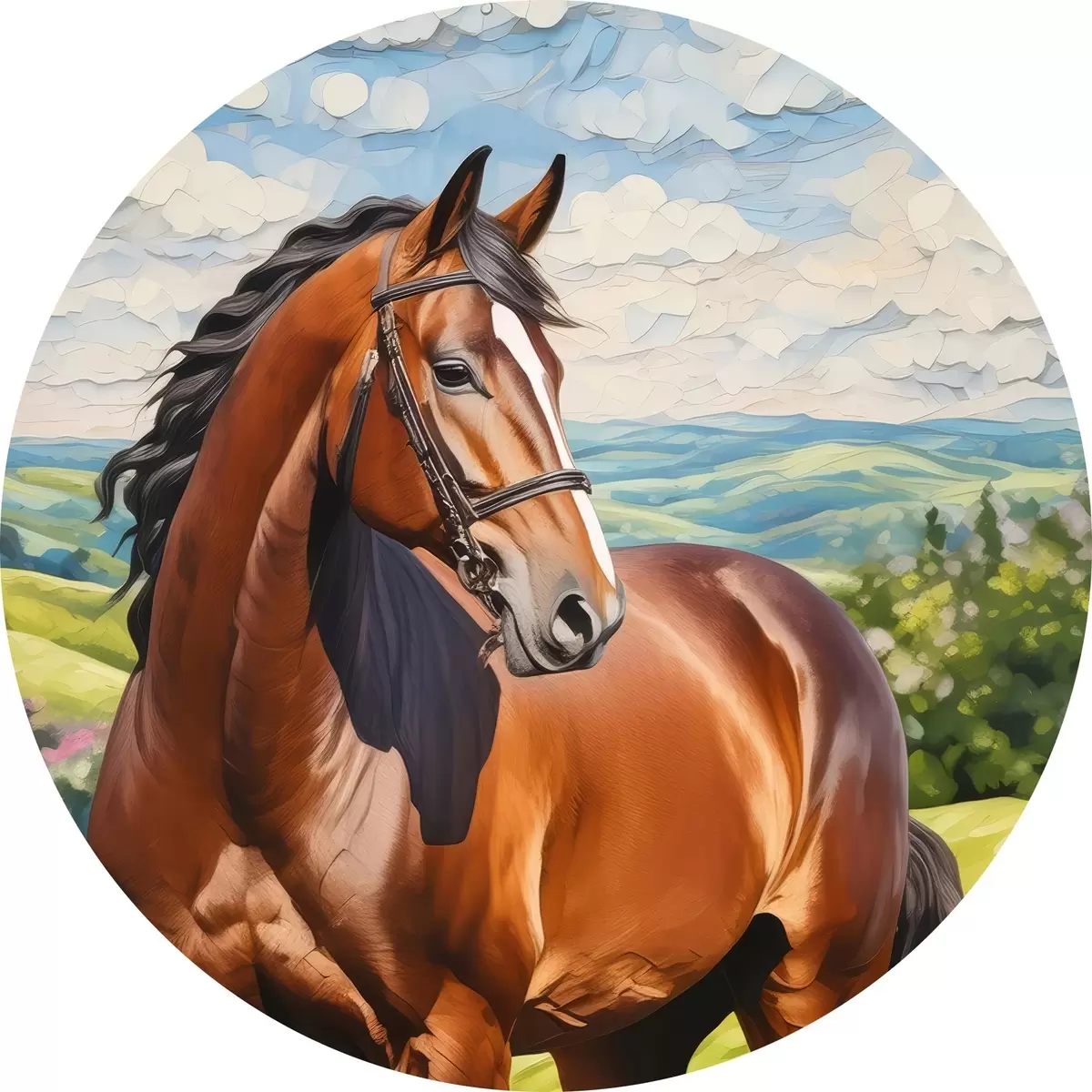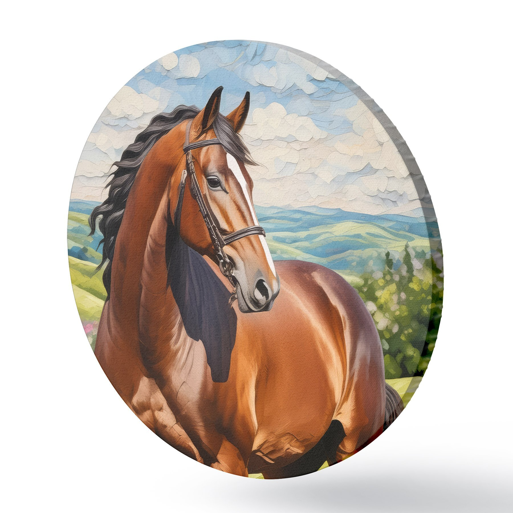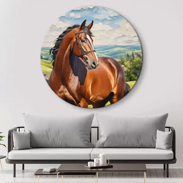 Apaļas gleznas Skaists zirgs zālienā, zilas debesis r38727