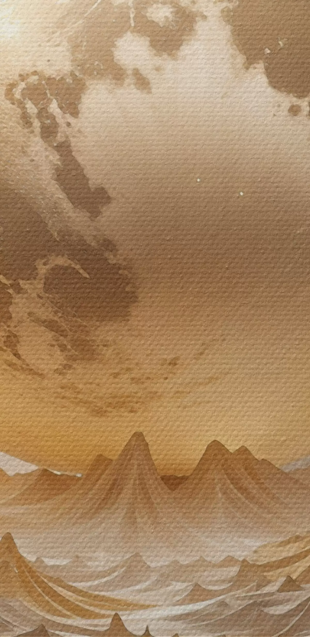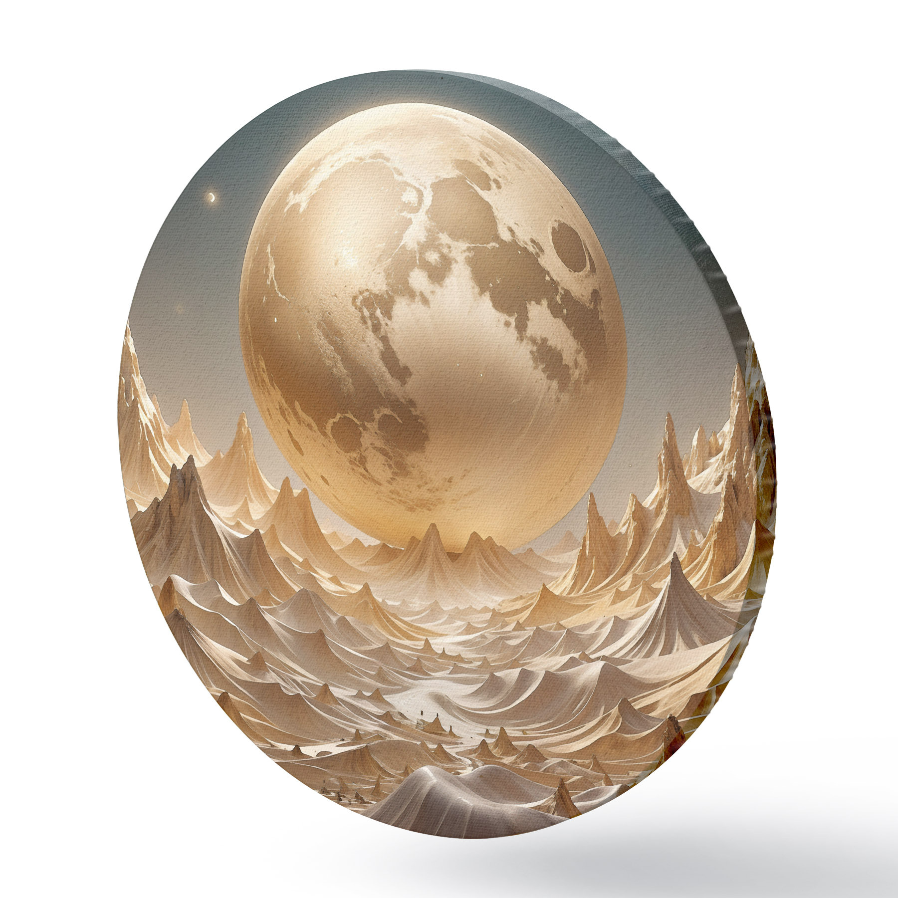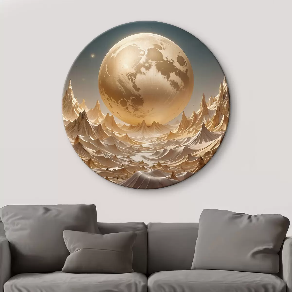 Apaļas gleznas Spīdošs pilnmēness virs sirreālas kalnainas ainavas ar virsotnēm r38775