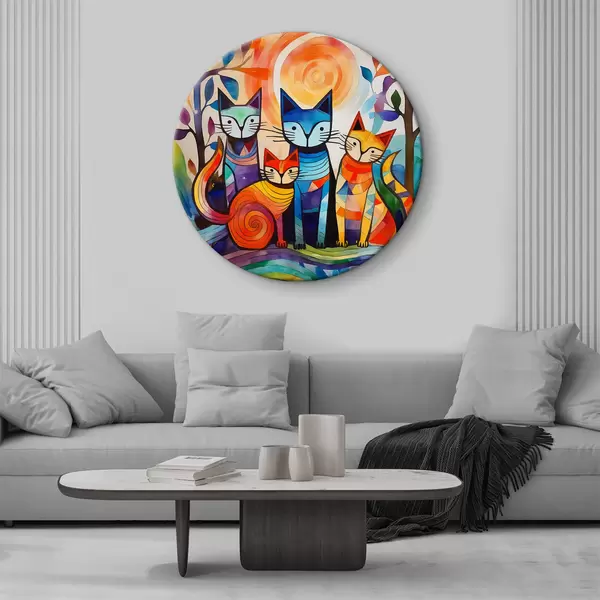 Apaļas gleznas Daudzkrāsaina abstrakcija ar interesantiem kaķiem r38815