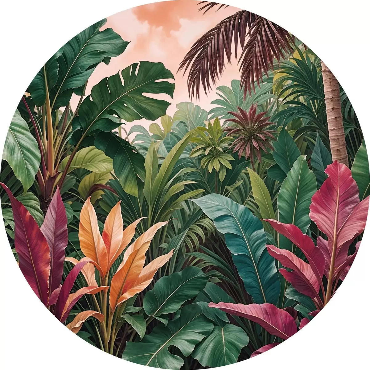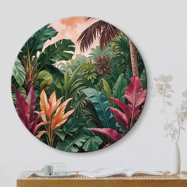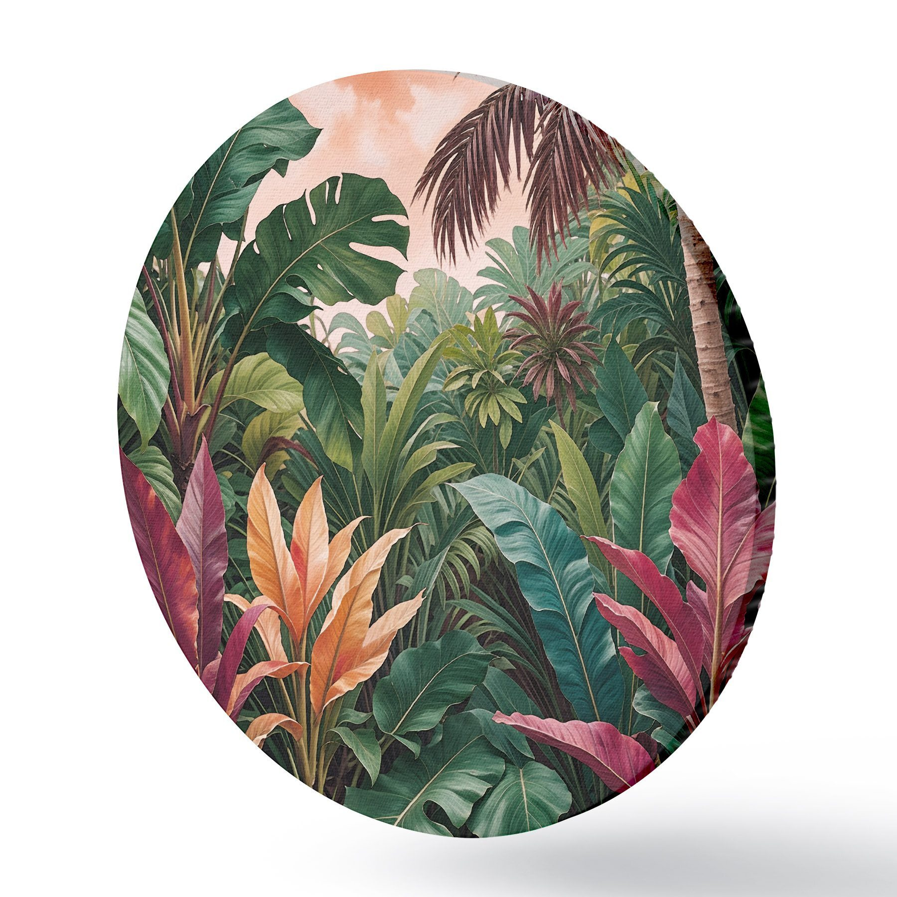 Apaļas gleznas Sulīgi, tropiski džungļi ar koši zaļām lapām, palmu lapiņām un krāsainiem ziediem r38817