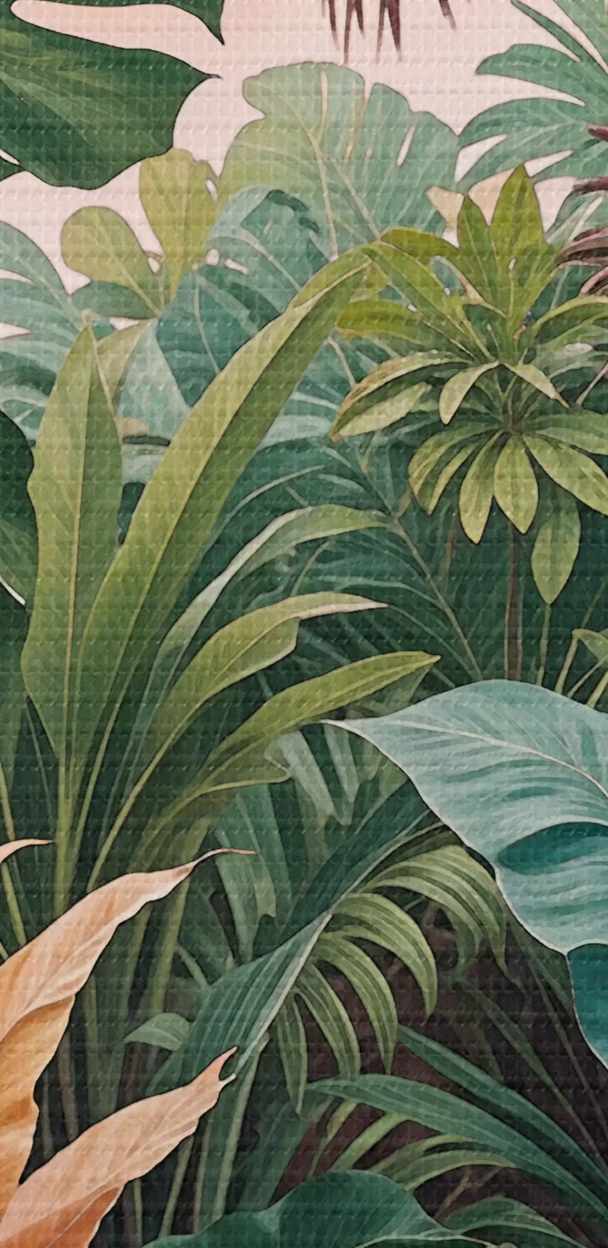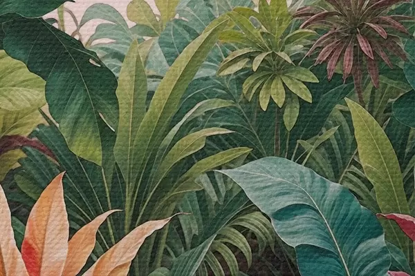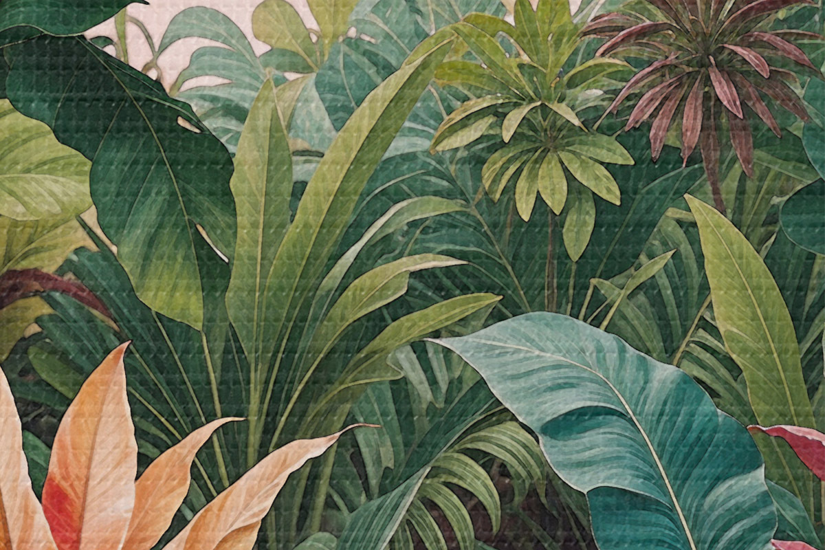 Attēls Sulīgi, tropiski džungļi ar koši zaļām lapām, palmu lapiņām un krāsainiem ziediem Nr r38817