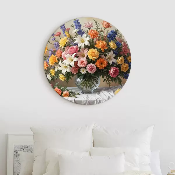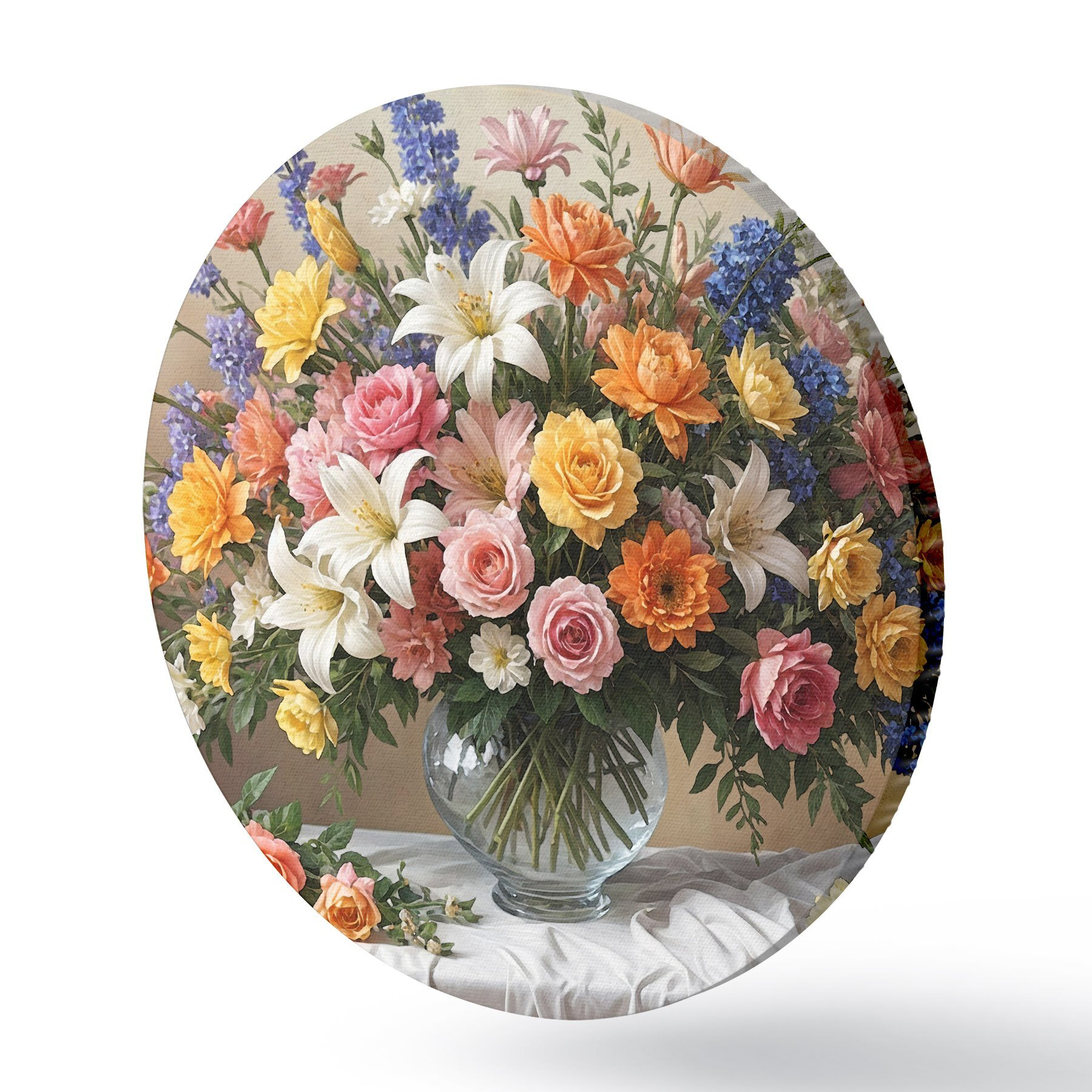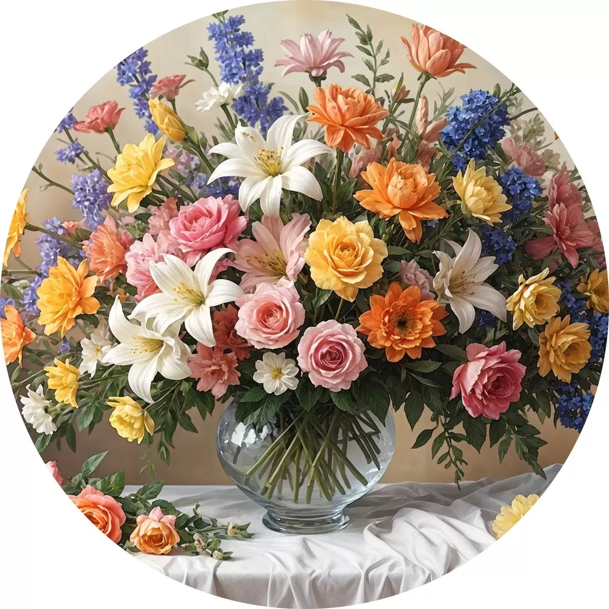 Apaļas gleznas Spilgts dažādu krāsainu ziedu pušķis stikla vāzē uz balta galdauta mākslas glezniecības vintage r38825