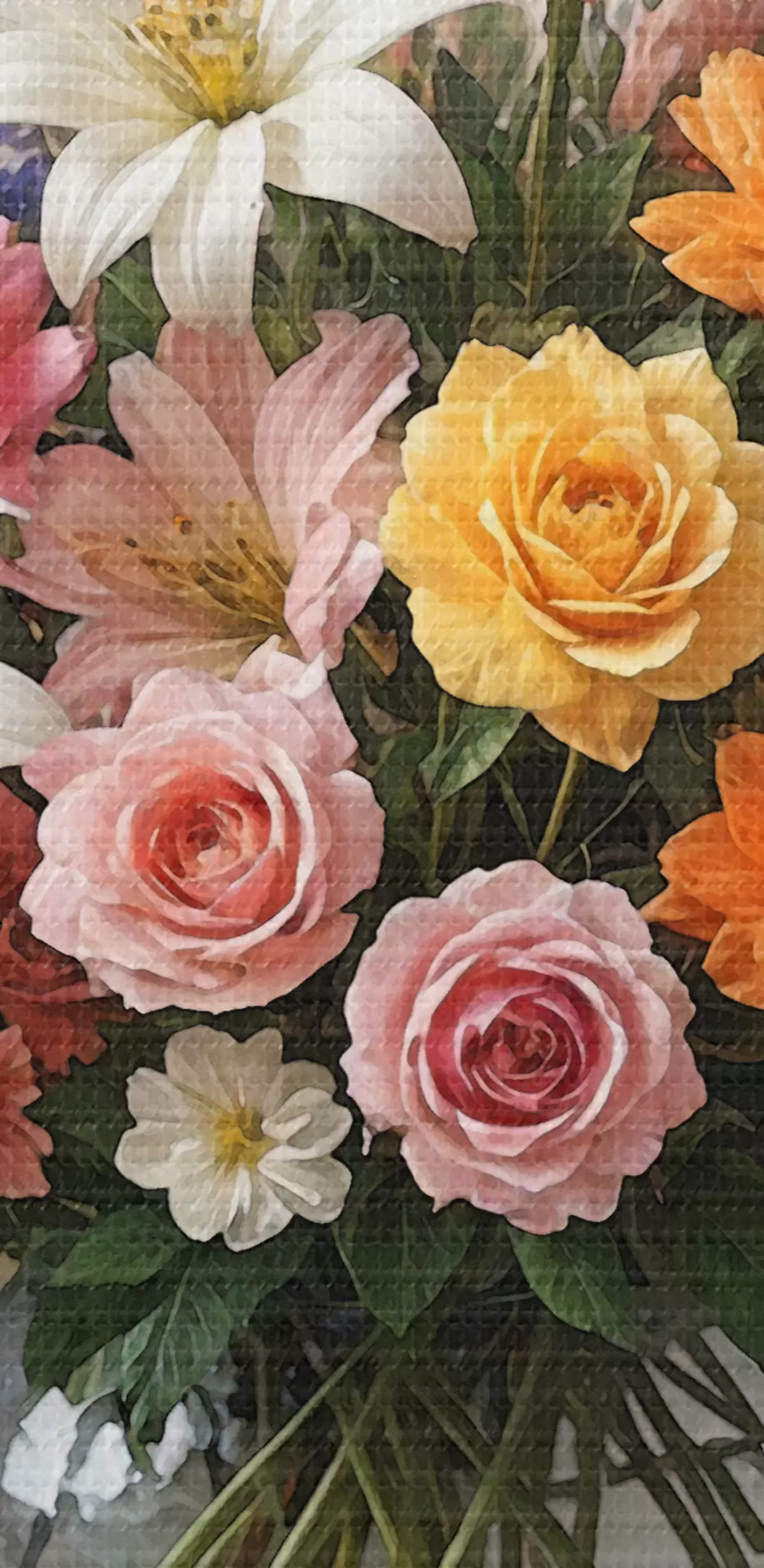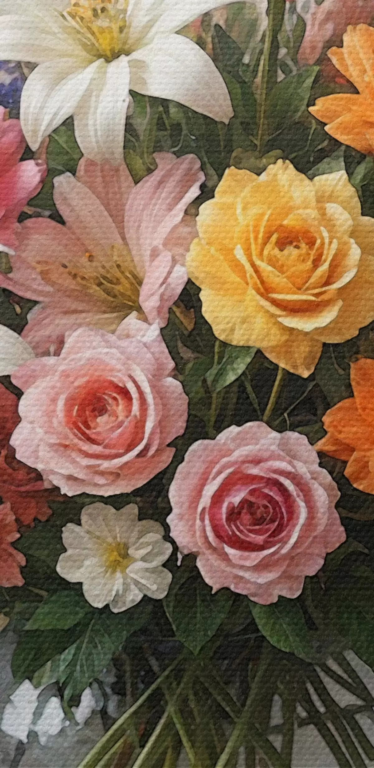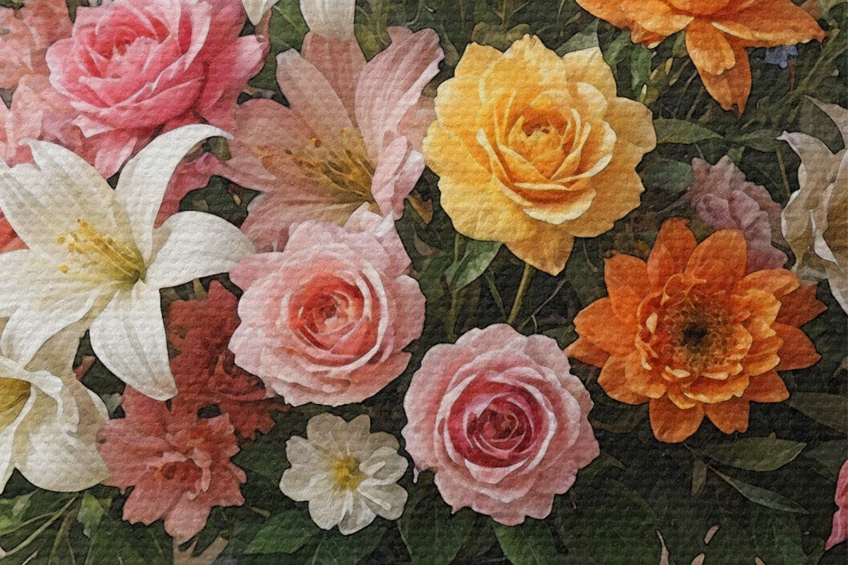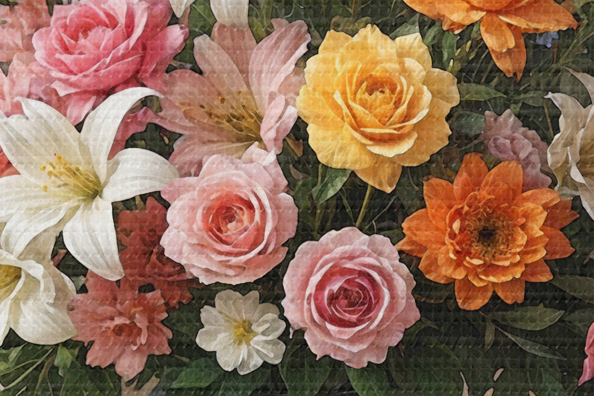 Attēls Spilgts dažādu krāsainu ziedu pušķis stikla vāzē uz balta galdauta mākslas glezniecības vintage Nr r38825