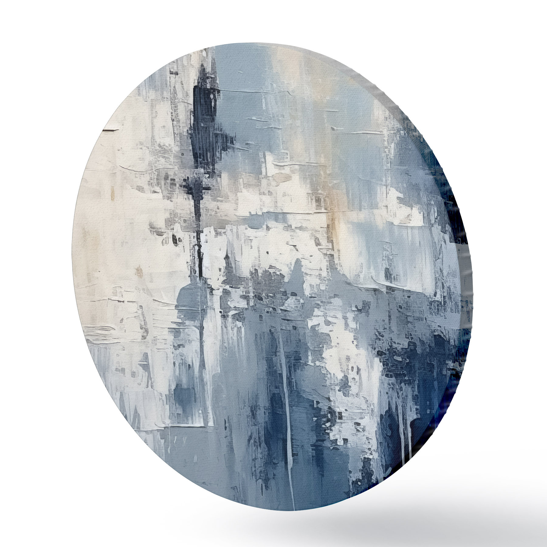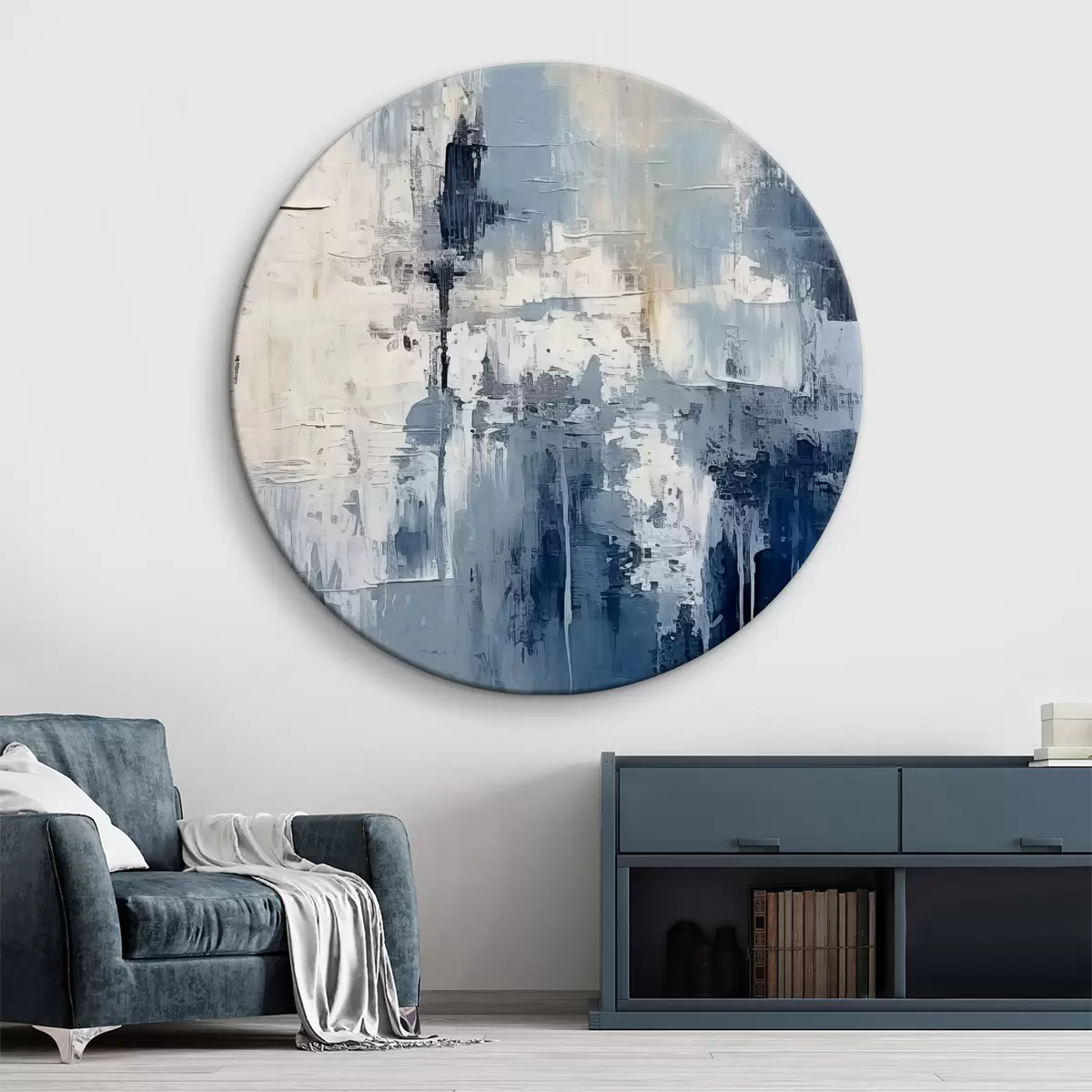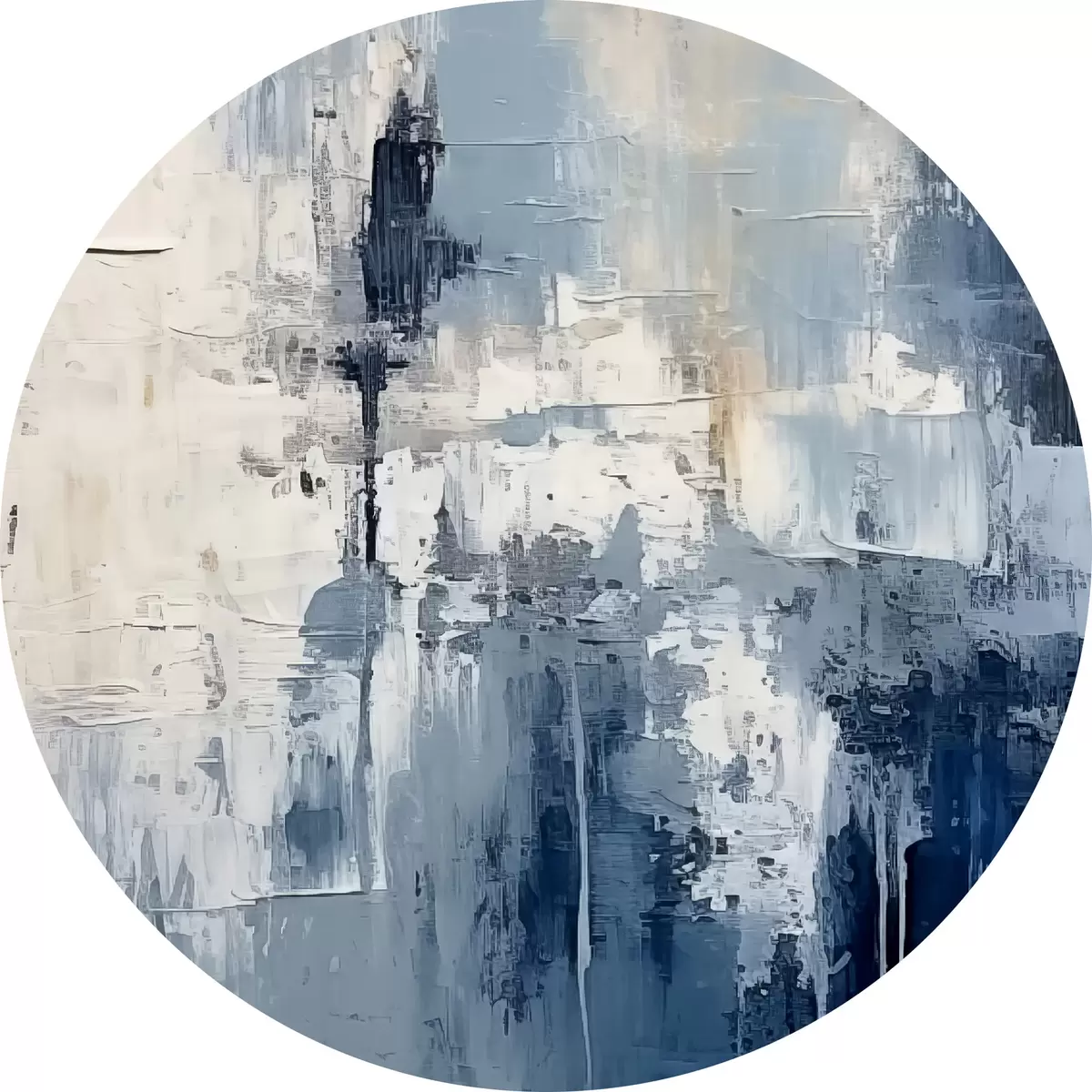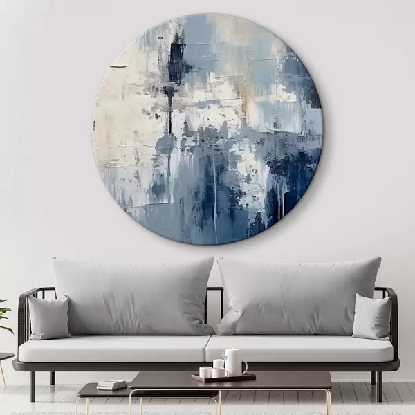 Apaļas gleznas Abstrakta minimālisma eļļas glezna, berzēta, ģeometriska, traipu, zilā un baltā krāsā r38906