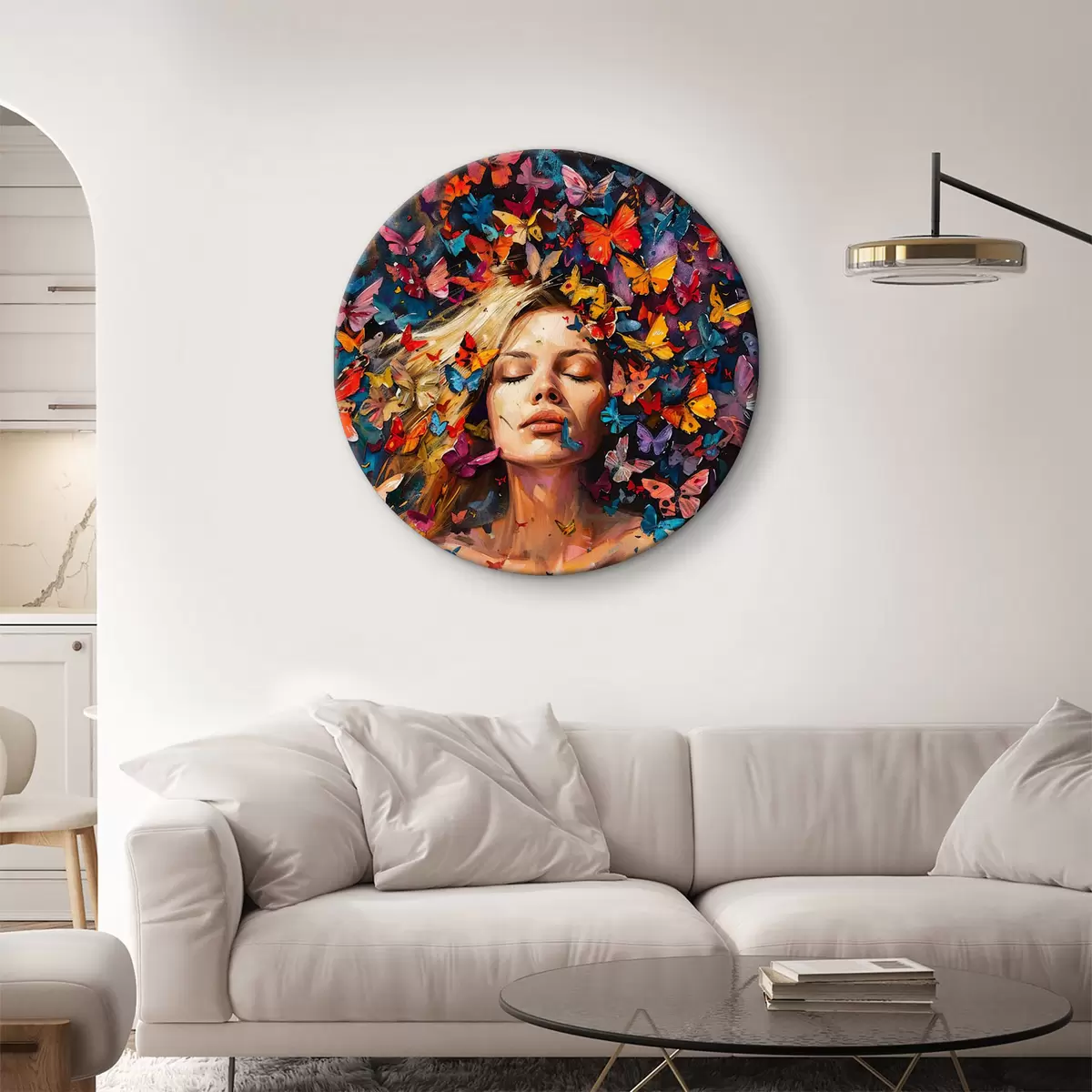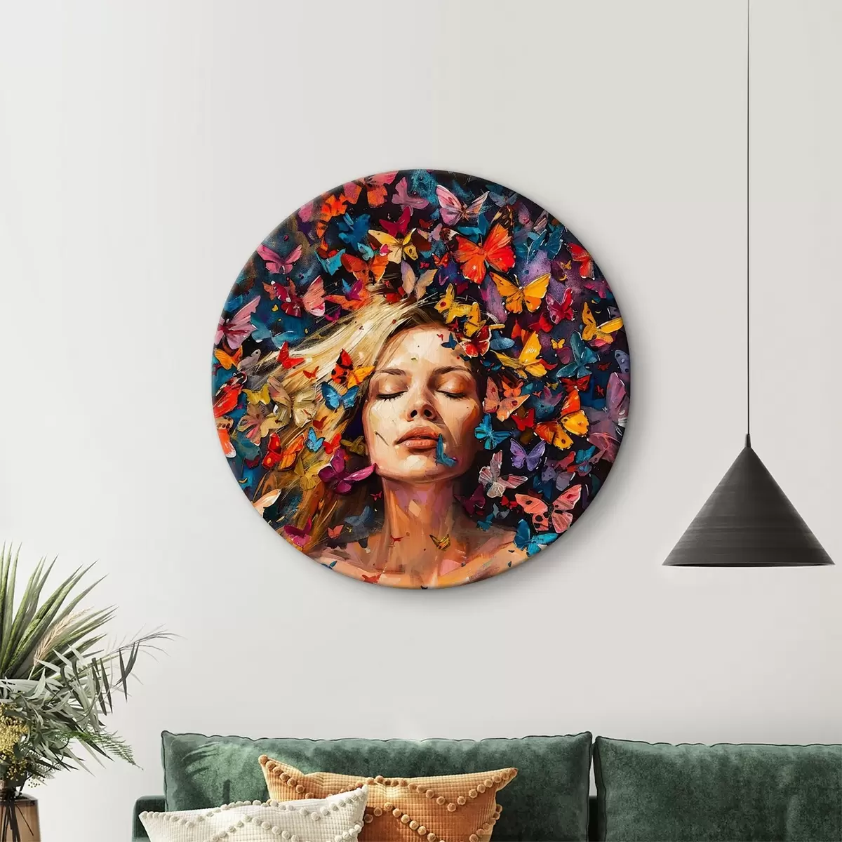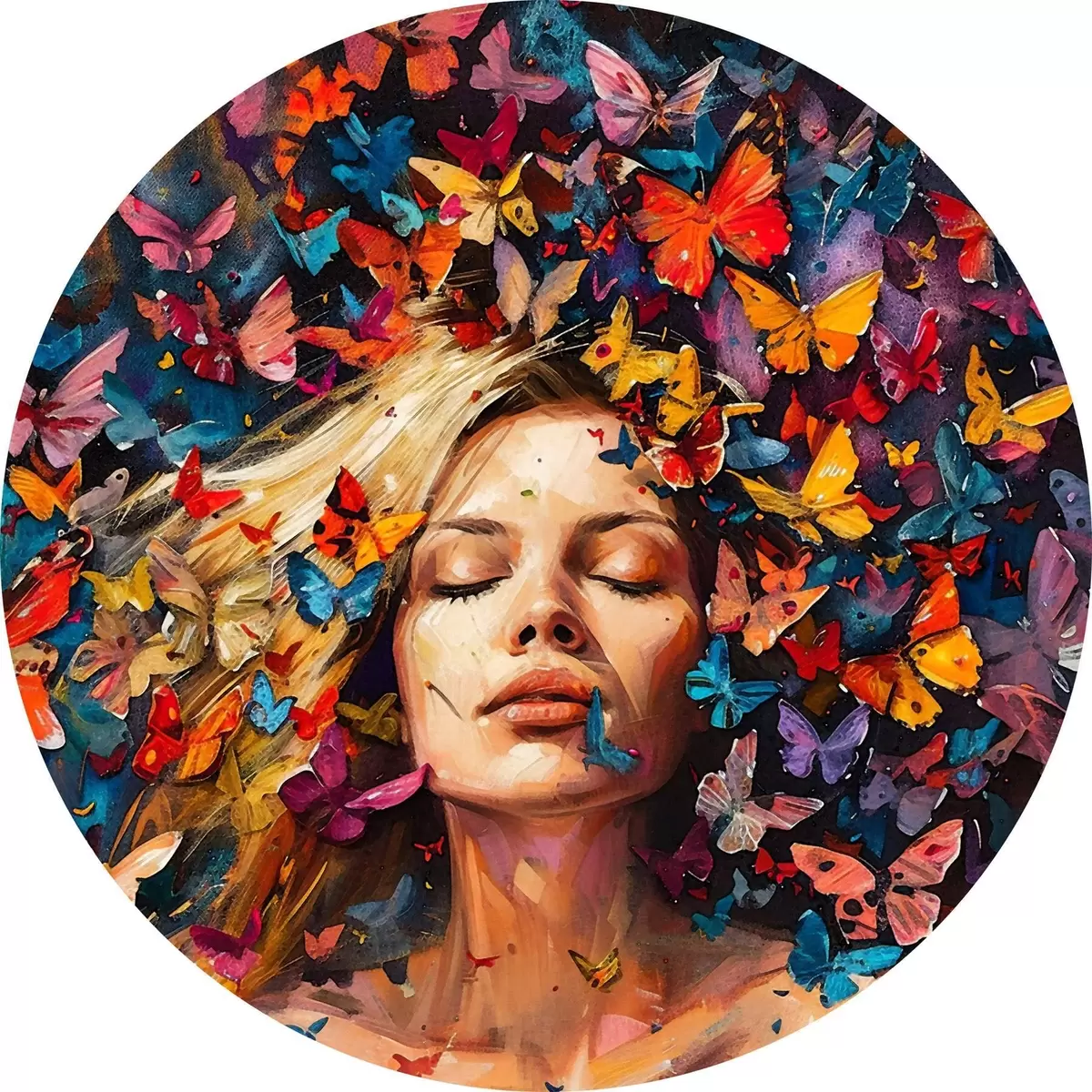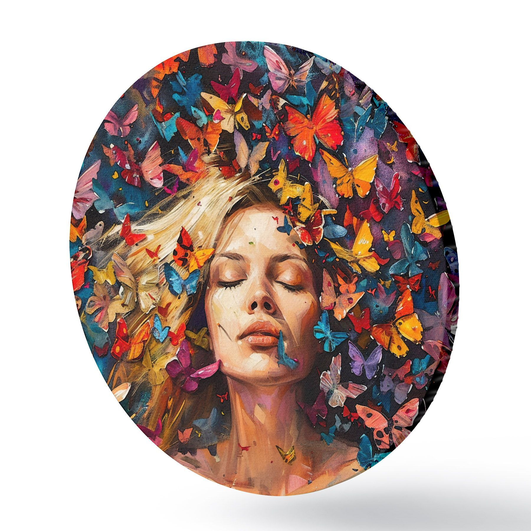 Apaļas gleznas Eļļas glezna ar jaunu sievieti, kuru ieskauj krāsainu tauriņu bars uz tumša fona r38972