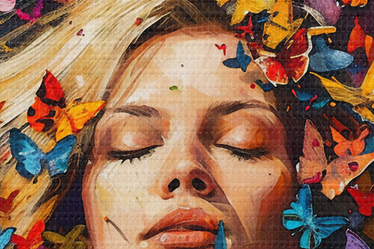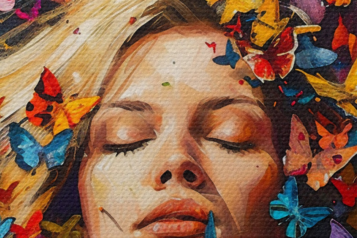Attēls Eļļas glezna ar jaunu sievieti, kuru ieskauj krāsainu tauriņu bars uz tumša fona Nr r38972