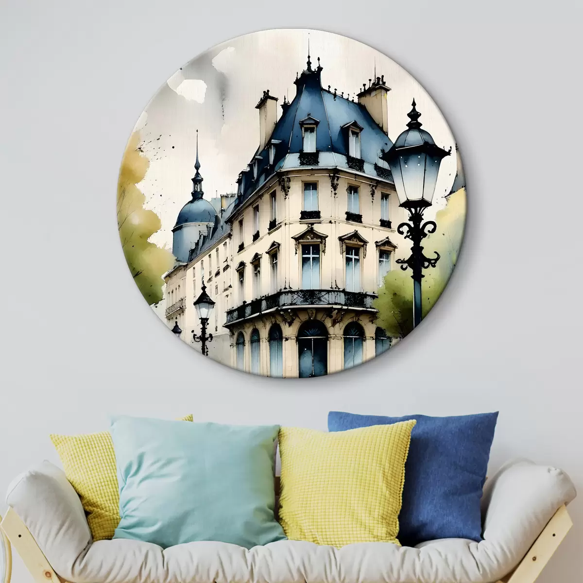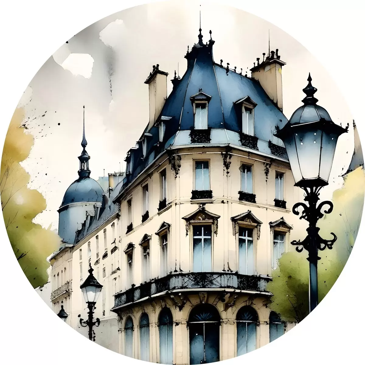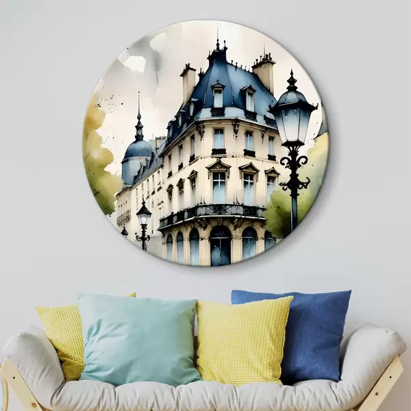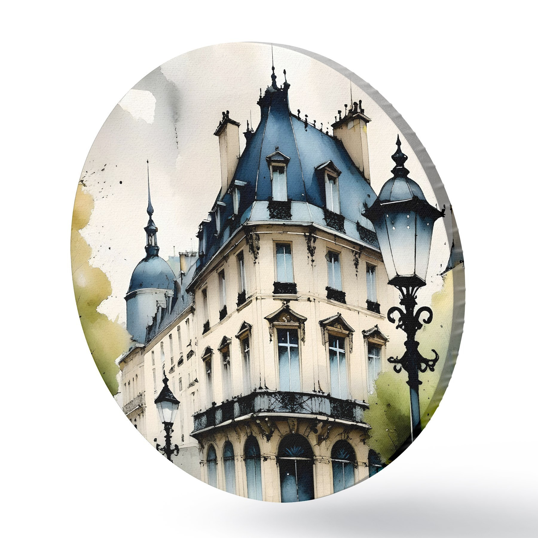 Apaļas gleznas Vēsturiskas ēkas akvareļglezna ar izliektu fasādi un dekoratīviem arhitektūras elementiem r38975