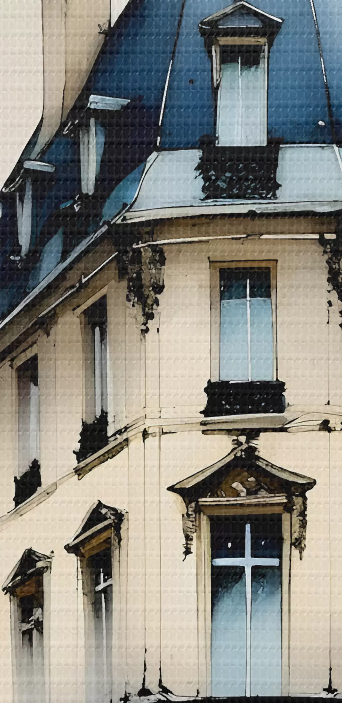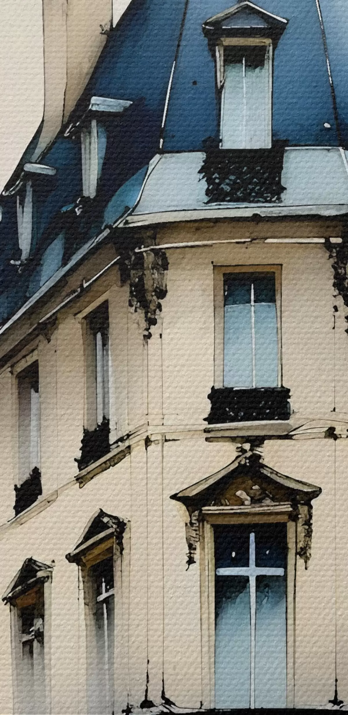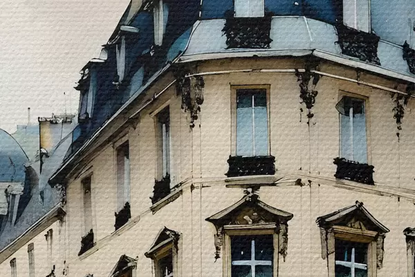 Attēls Vēsturiskas ēkas akvareļglezna ar izliektu fasādi un dekoratīviem arhitektūras elementiem Nr r38975