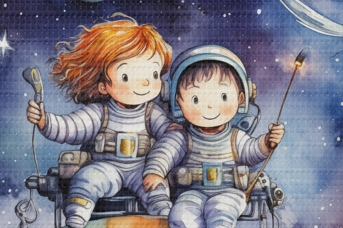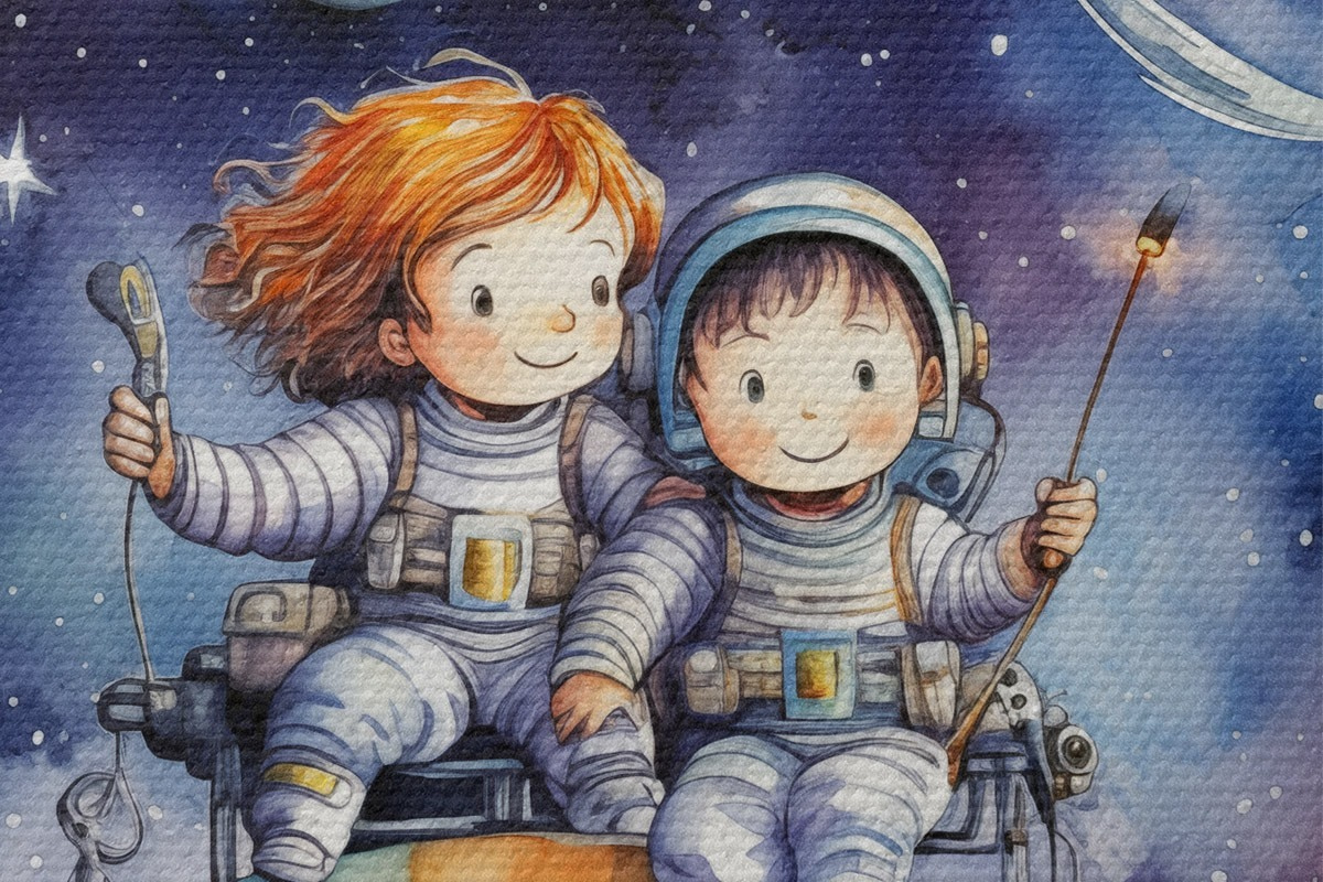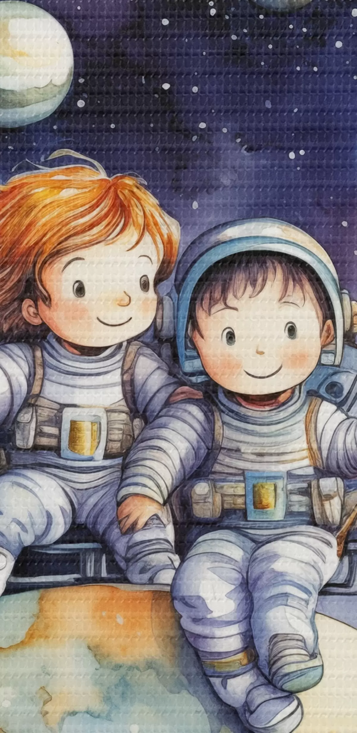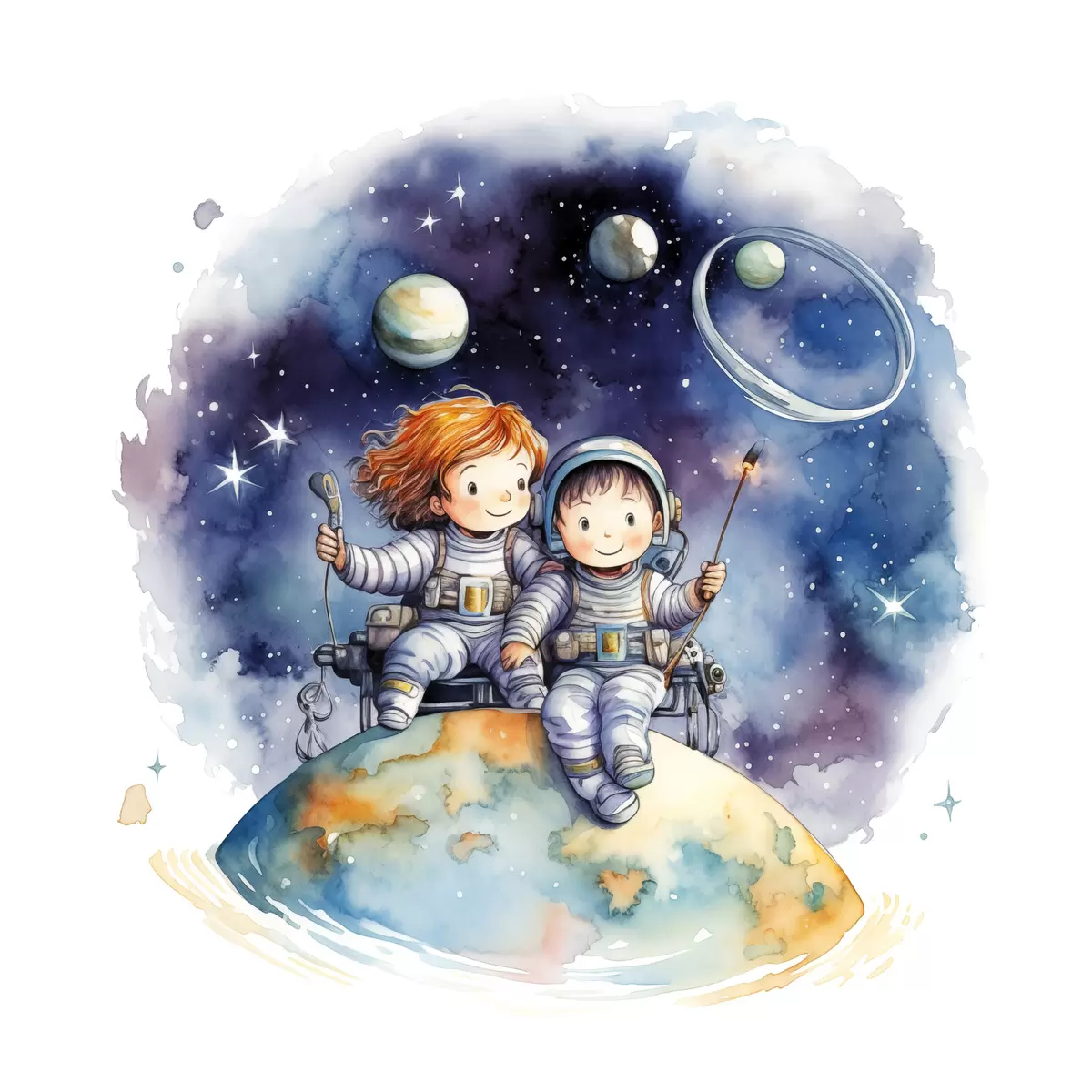 Attēls Bērni skafandros sēž uz planētas kosmosā, bērnu akvareļa ilustrācija Nr r39117