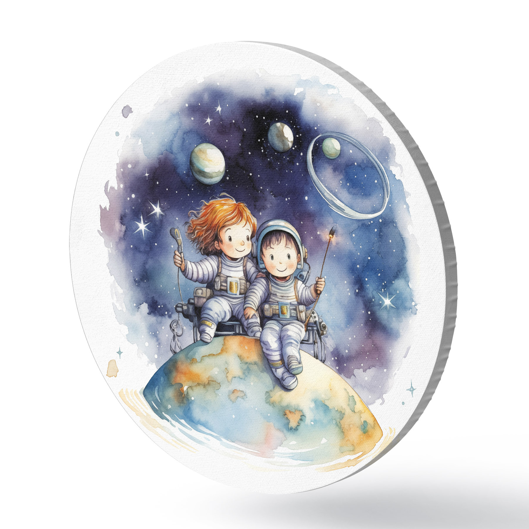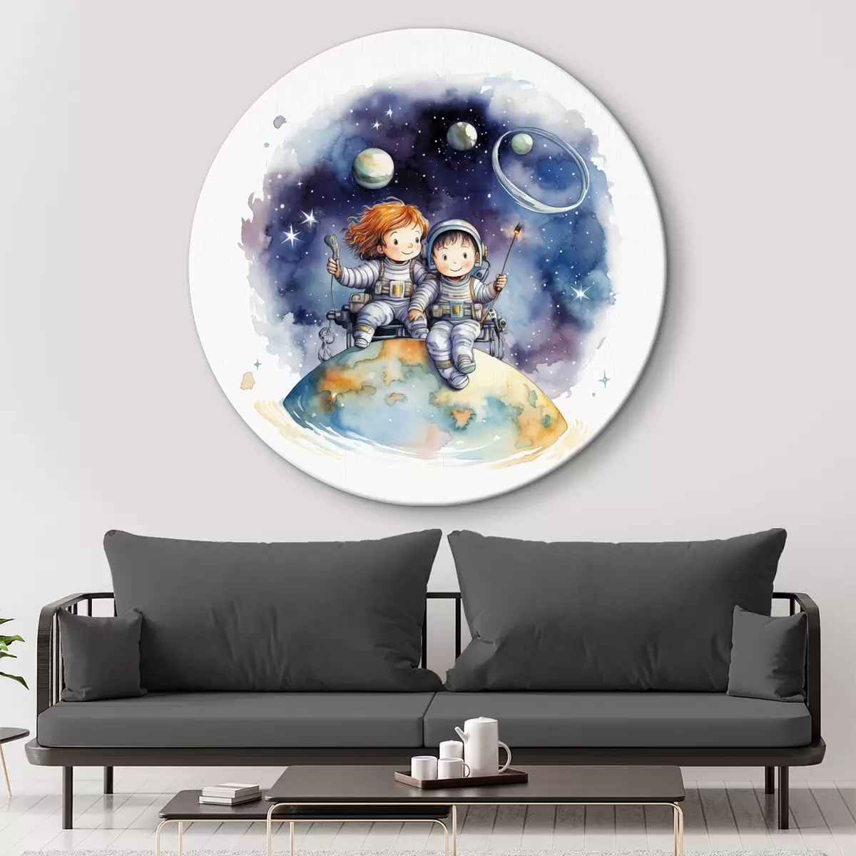 Apaļas gleznas Bērni skafandros sēž uz planētas kosmosā, bērnu akvareļa ilustrācija r39117