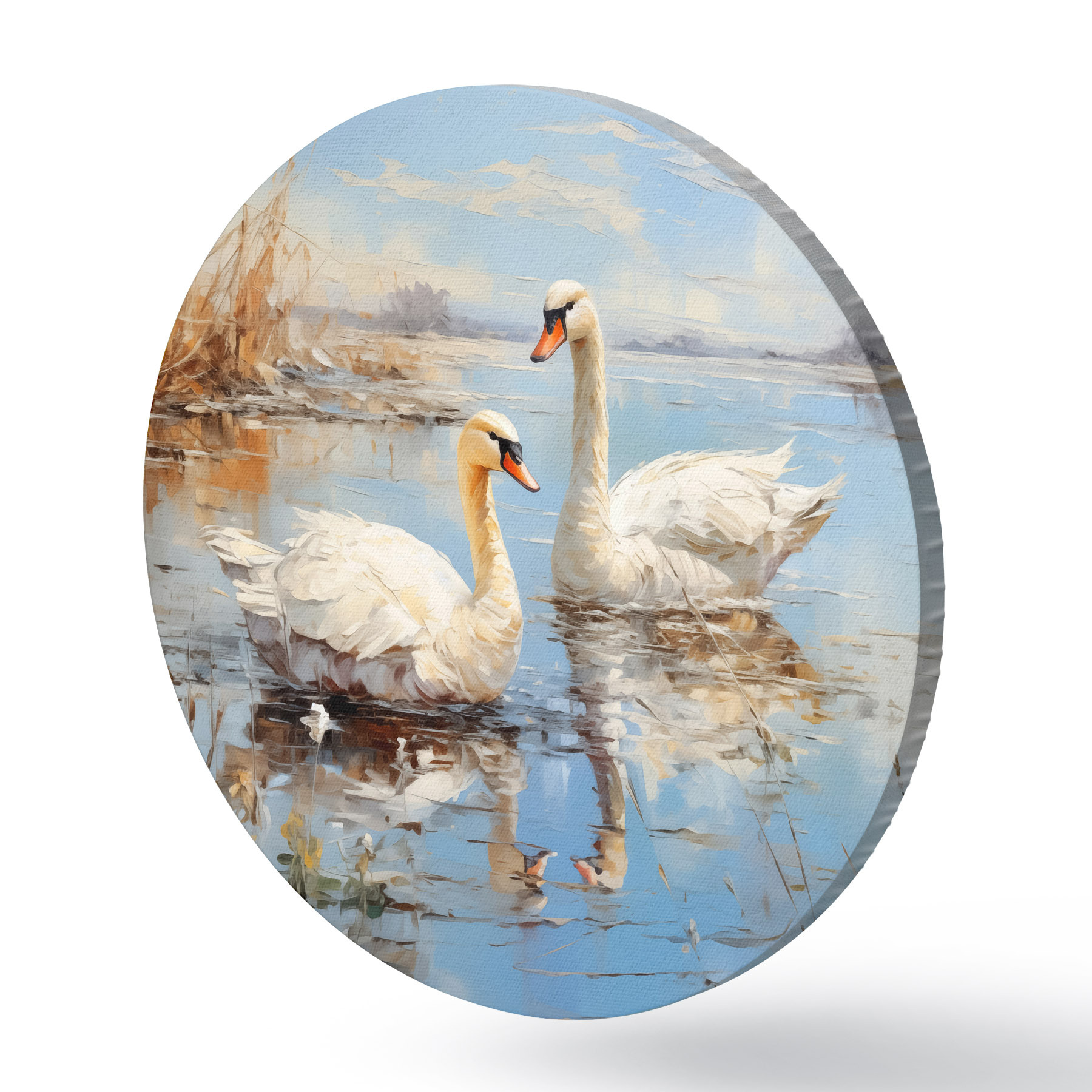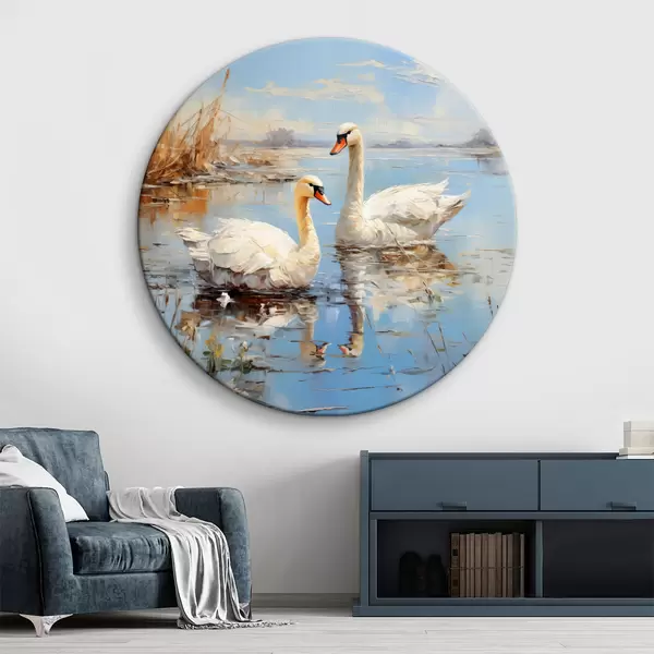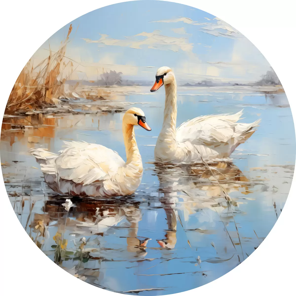 Apaļas gleznas Pa upi starp niedrēm peld baltās zosis, zilā, baltā, bēšā krāsā r39130