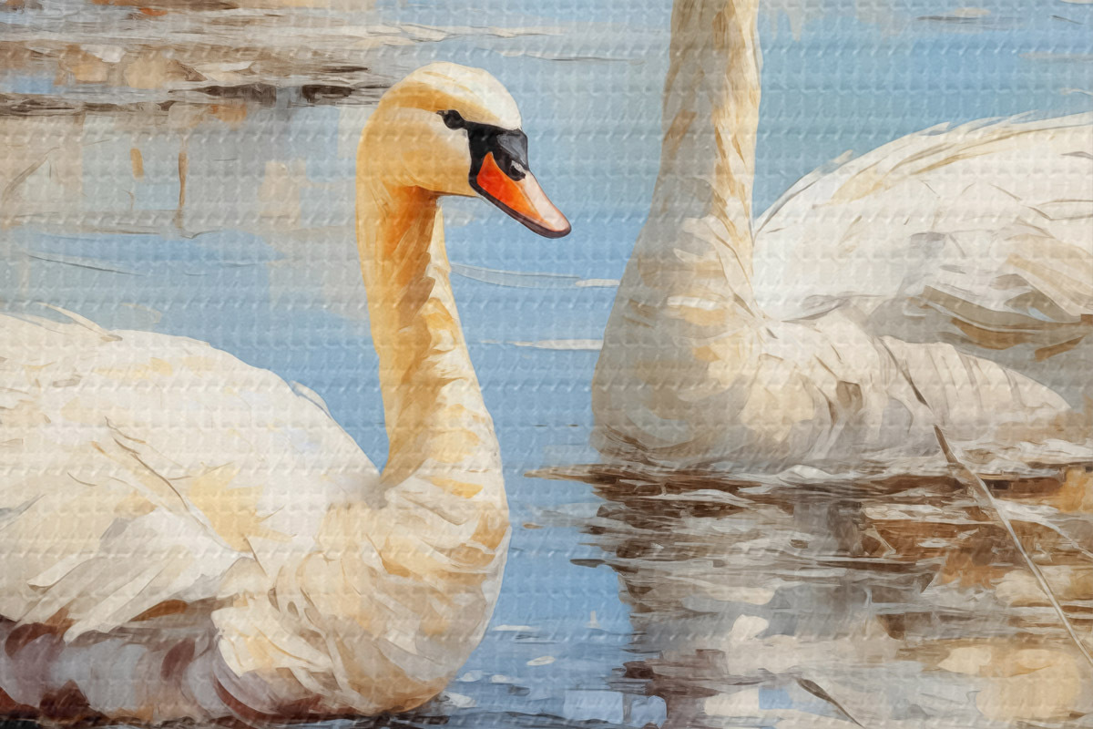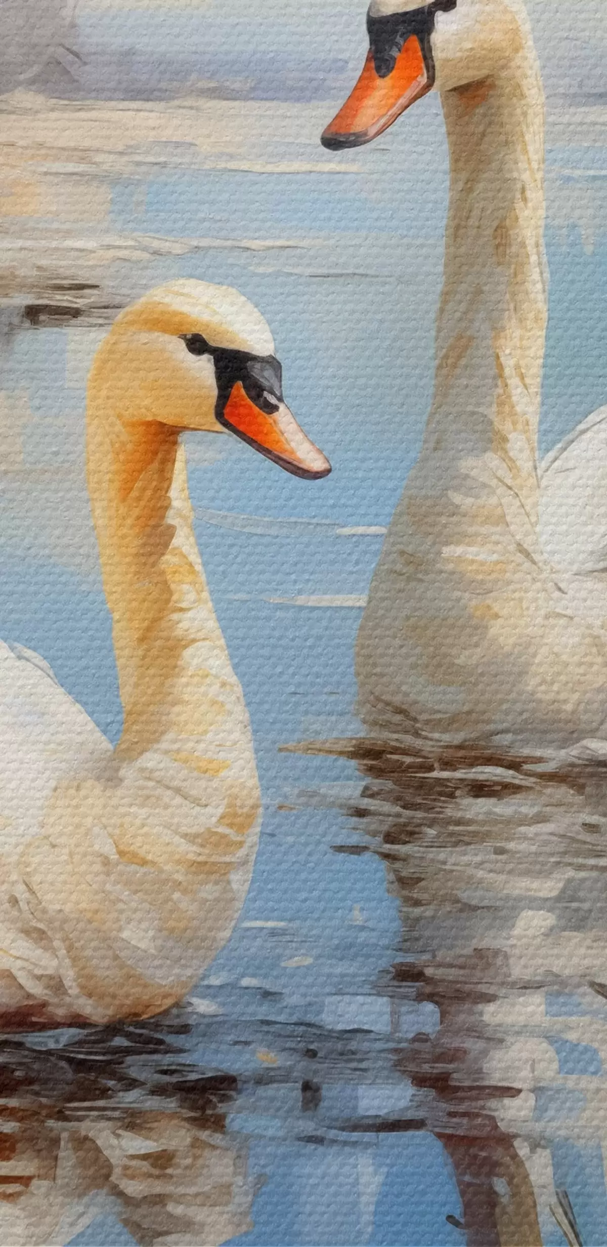 Attēls Pa upi starp niedrēm peld baltās zosis, zilā, baltā, bēšā krāsā Nr r39130