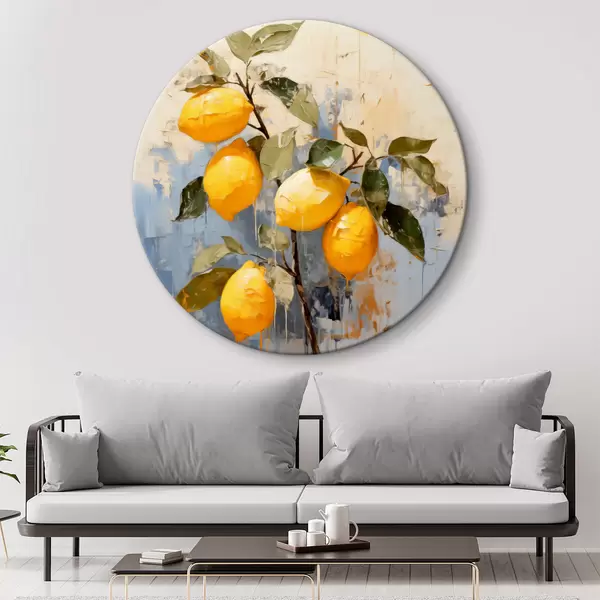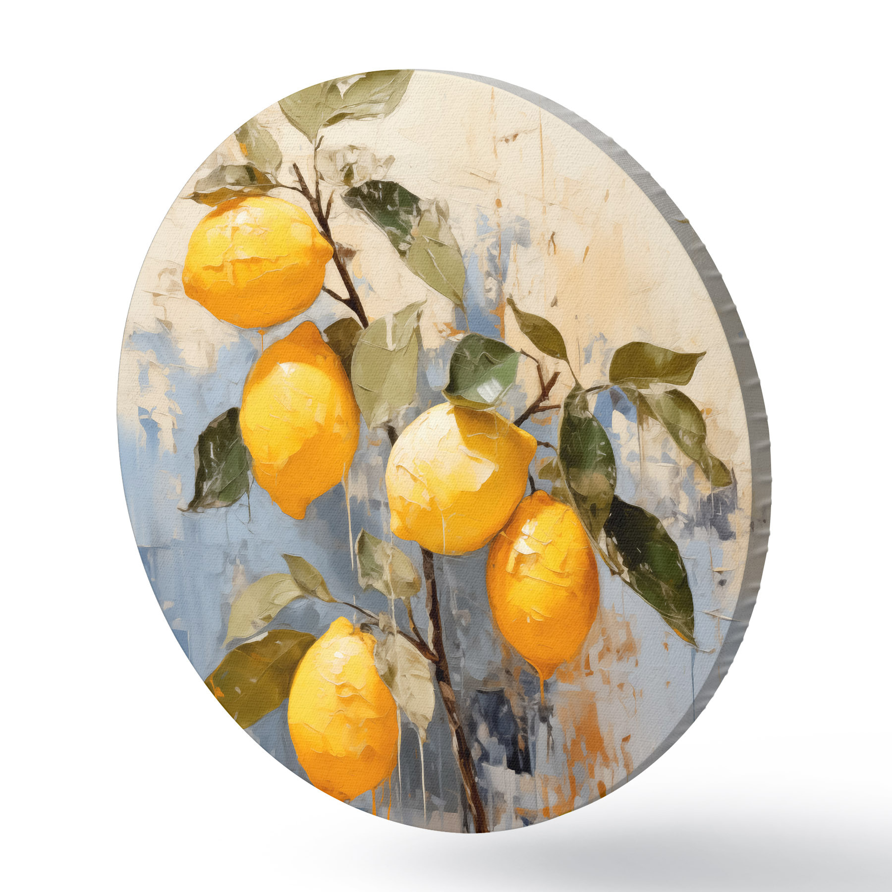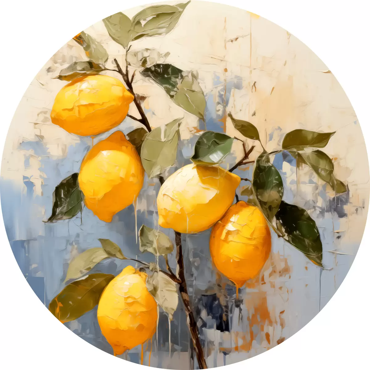Apaļas gleznas Zars ar nobriedušiem citroniem eļļas glezna abstraktā māksla, dzeltenā, zilā un zaļā krāsā r39186