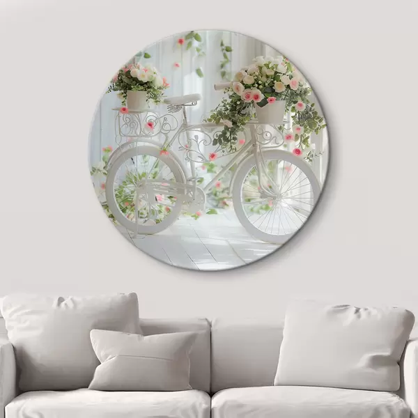 Apaļas gleznas Balts velosipēds ar ziedu grozu Provansas stilā r39243