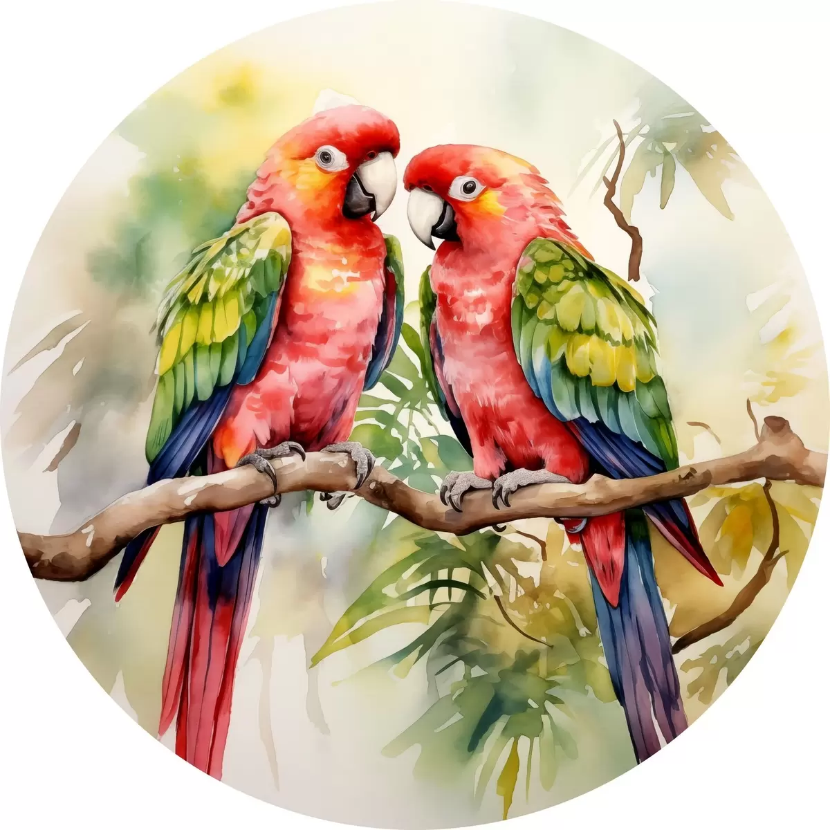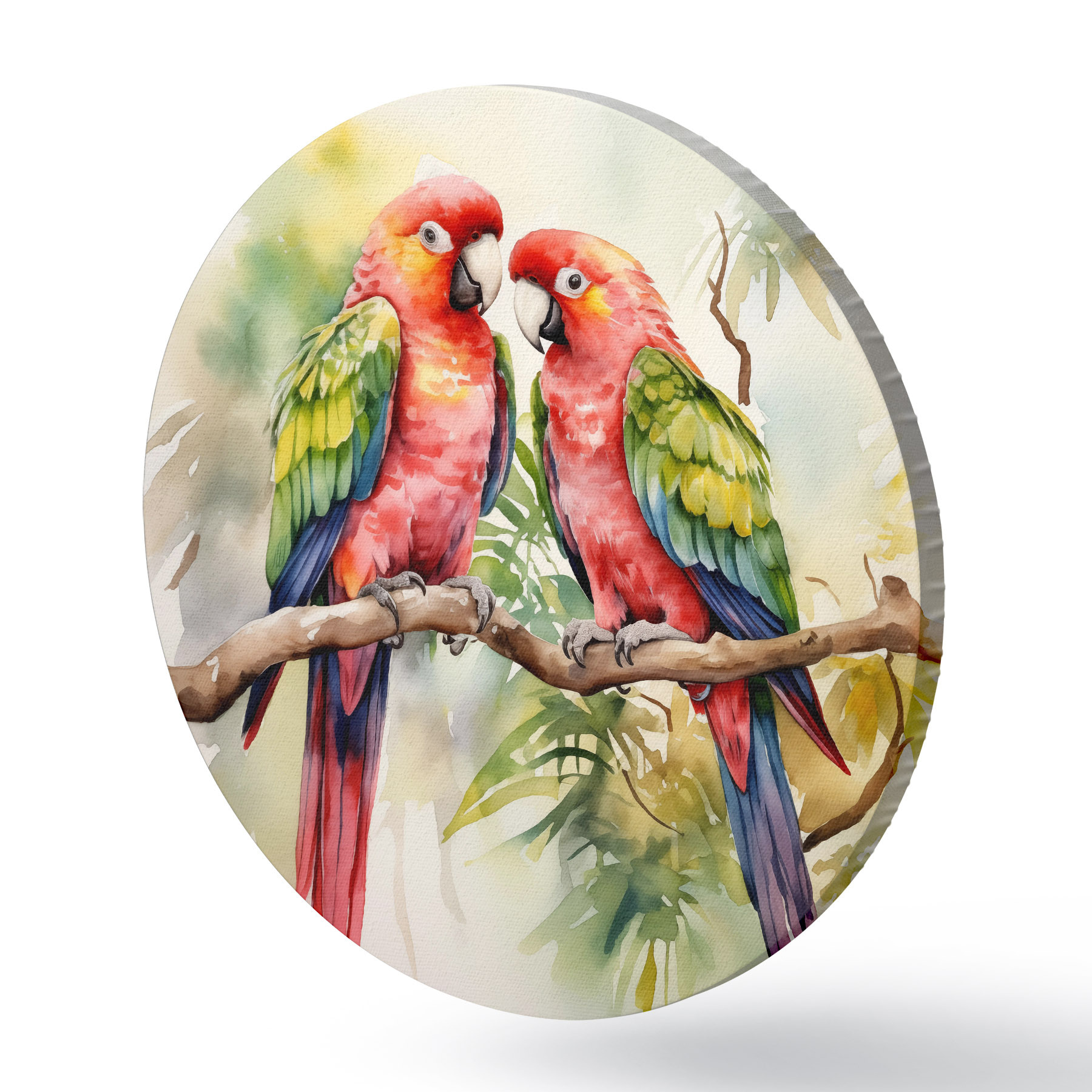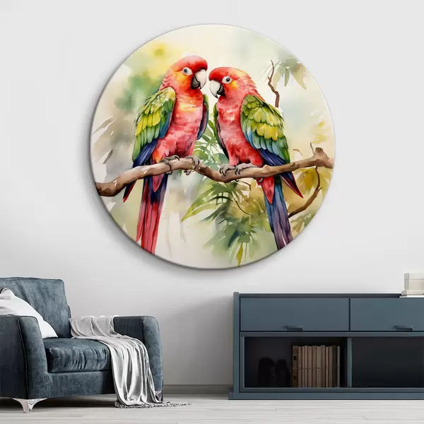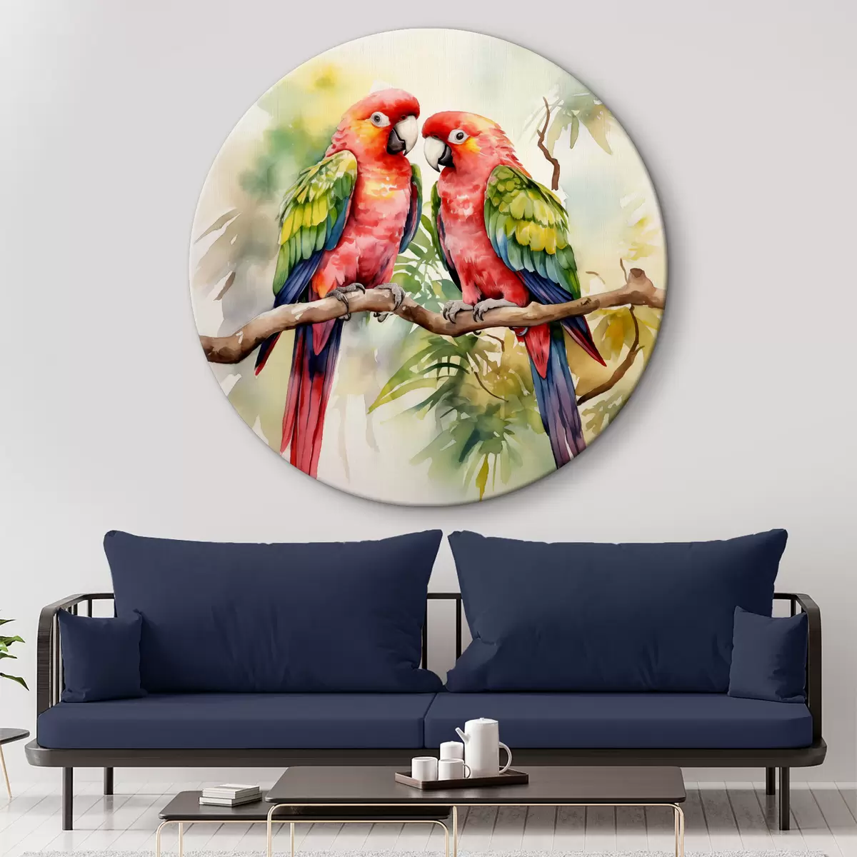 Apaļas gleznas Divi spilgti ara papagaiļi sēž uz viena zara akvarelis r39333