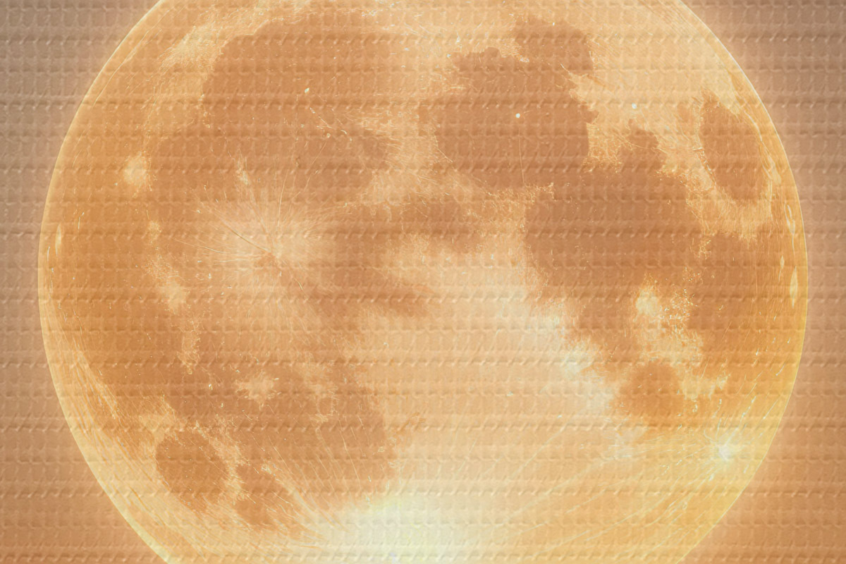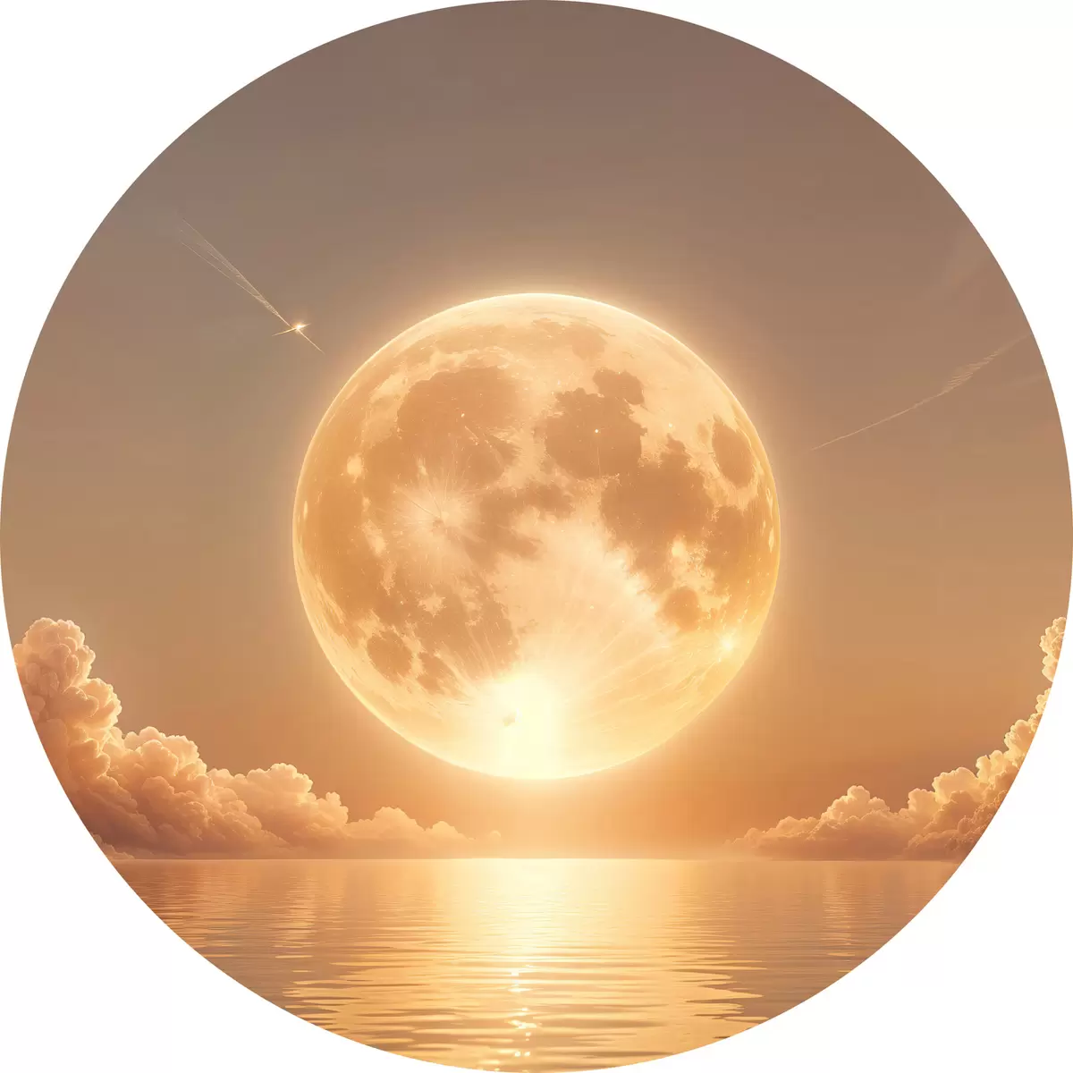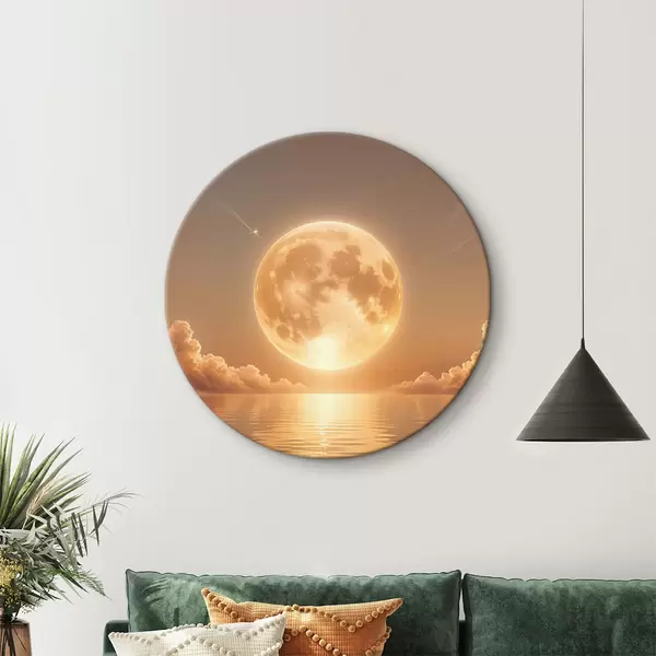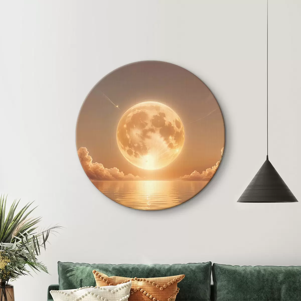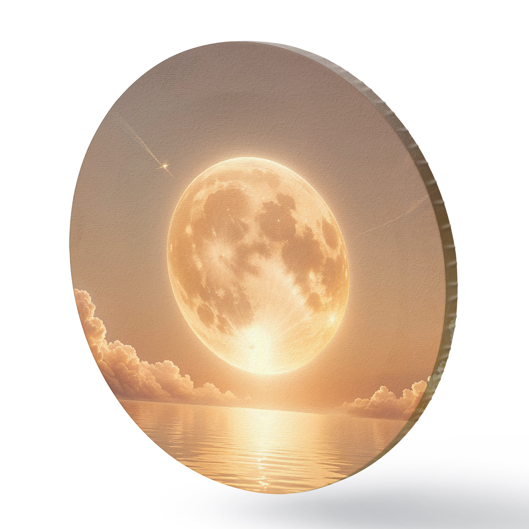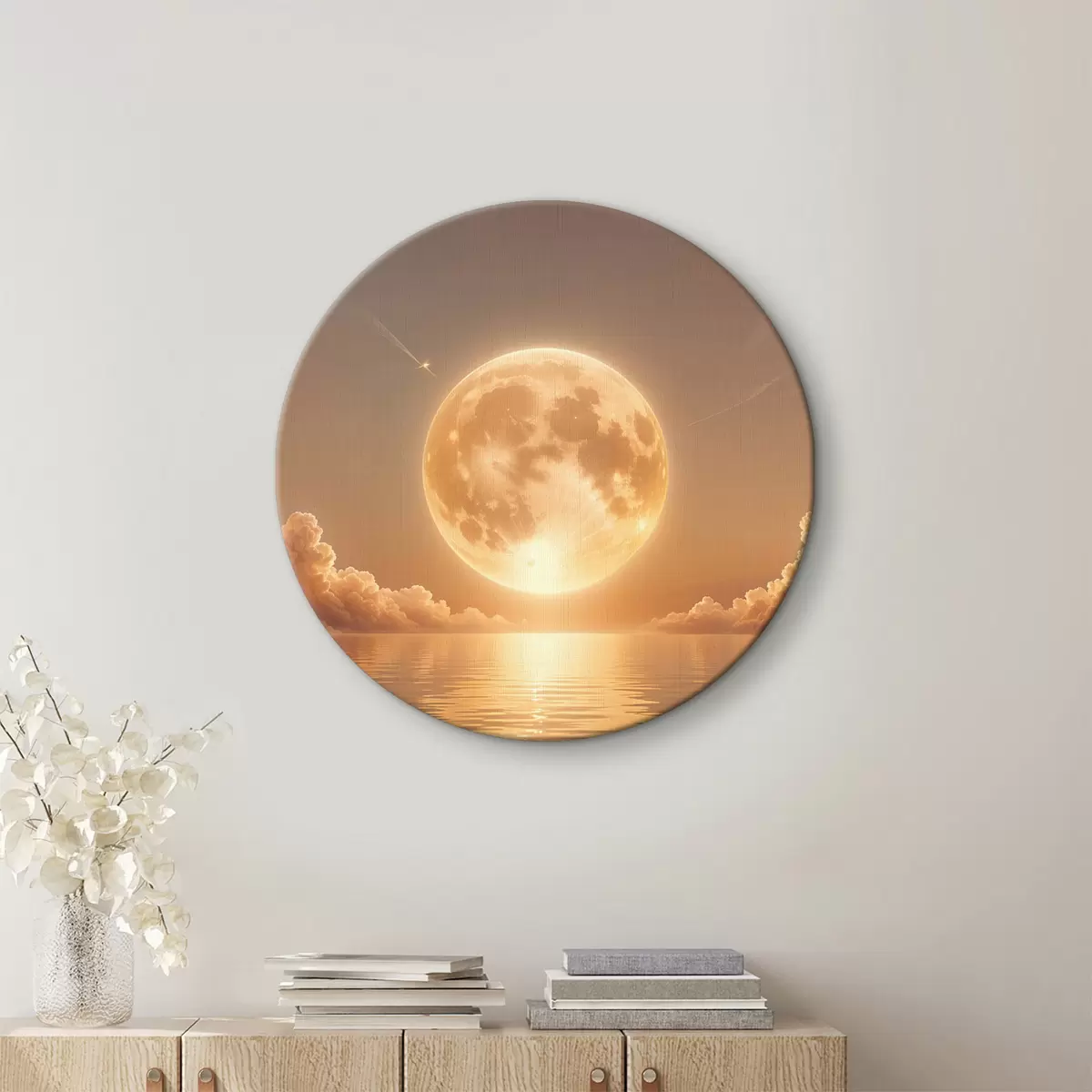 Apaļas gleznas Liels, spožs pilnmēness, kas saulrietā paceļas pār mierīgu, atstarojošu okeānu r39403