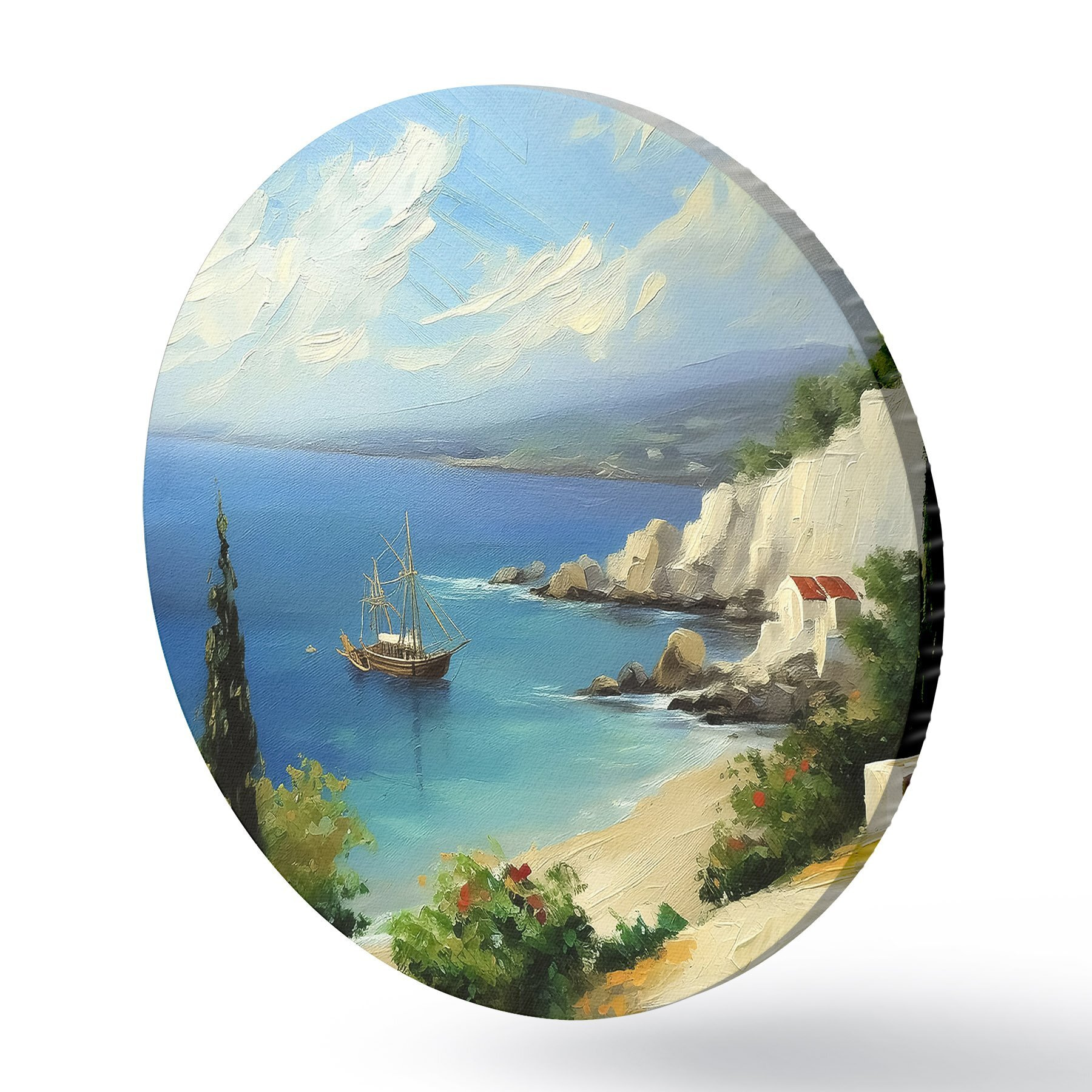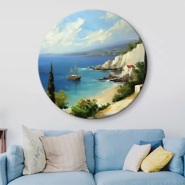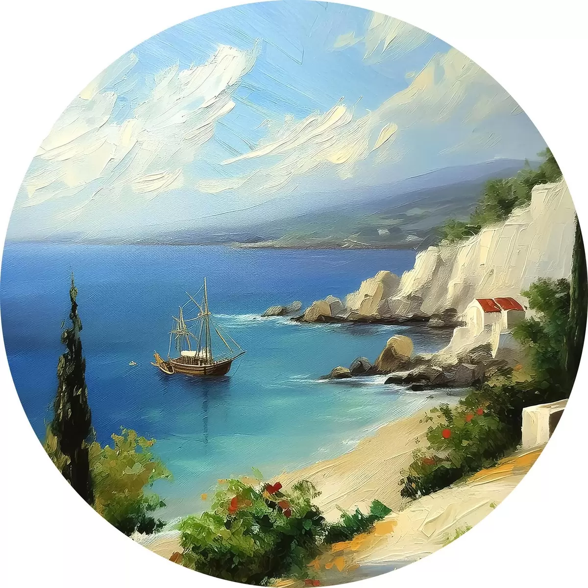 Apaļas gleznas Grieķijas jūras piekraste, kuģis, zils ūdens, eļļas glezna, vasaras daba, akmeņi, spilgti otas triepieni r39425