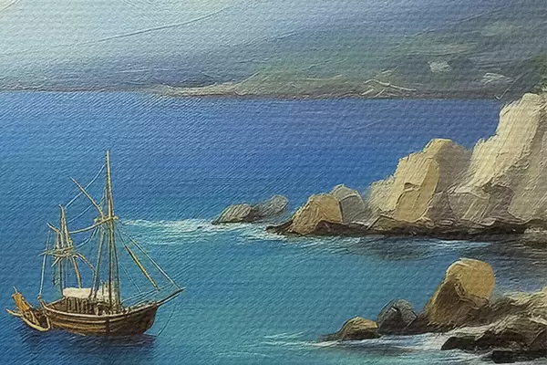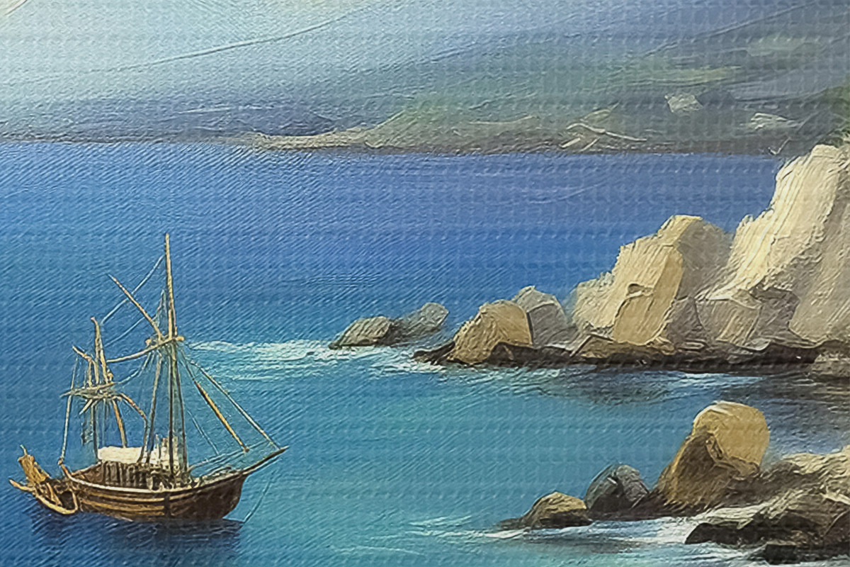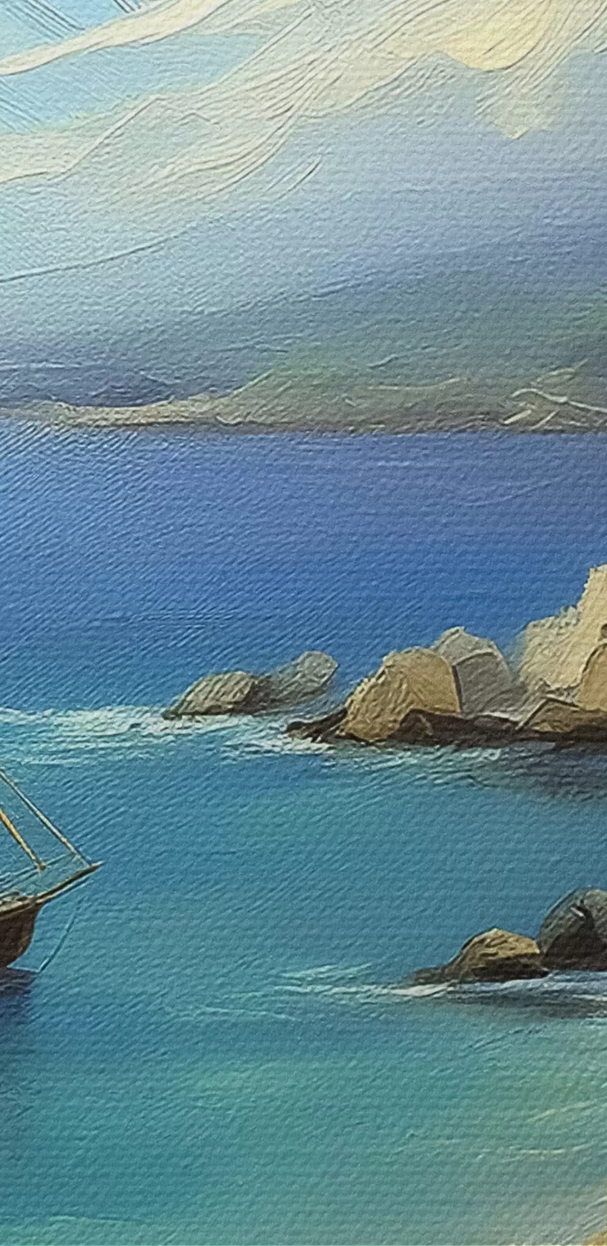 Attēls Grieķijas jūras piekraste, kuģis, zils ūdens, eļļas glezna, vasaras daba, akmeņi, spilgti otas triepieni Nr r39425