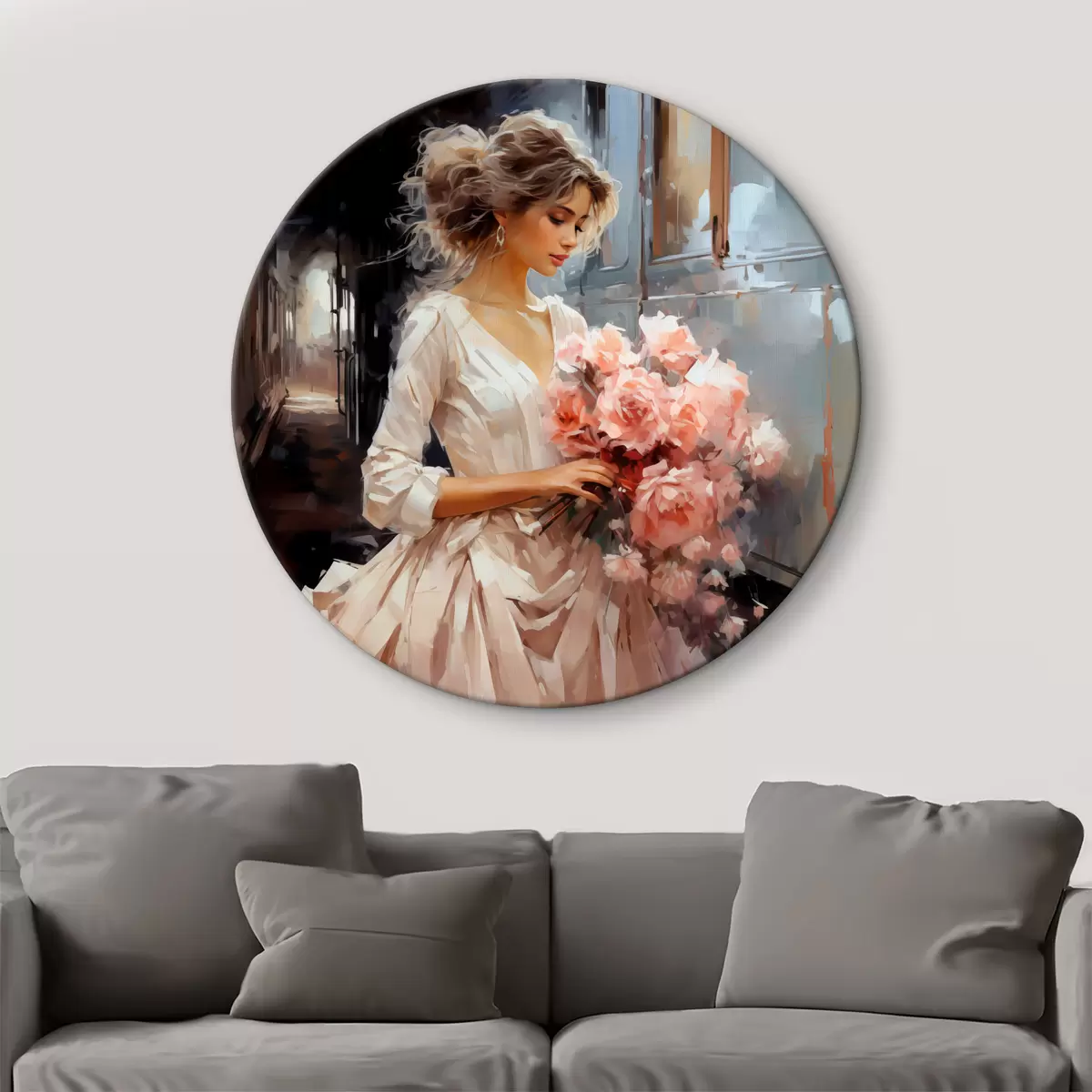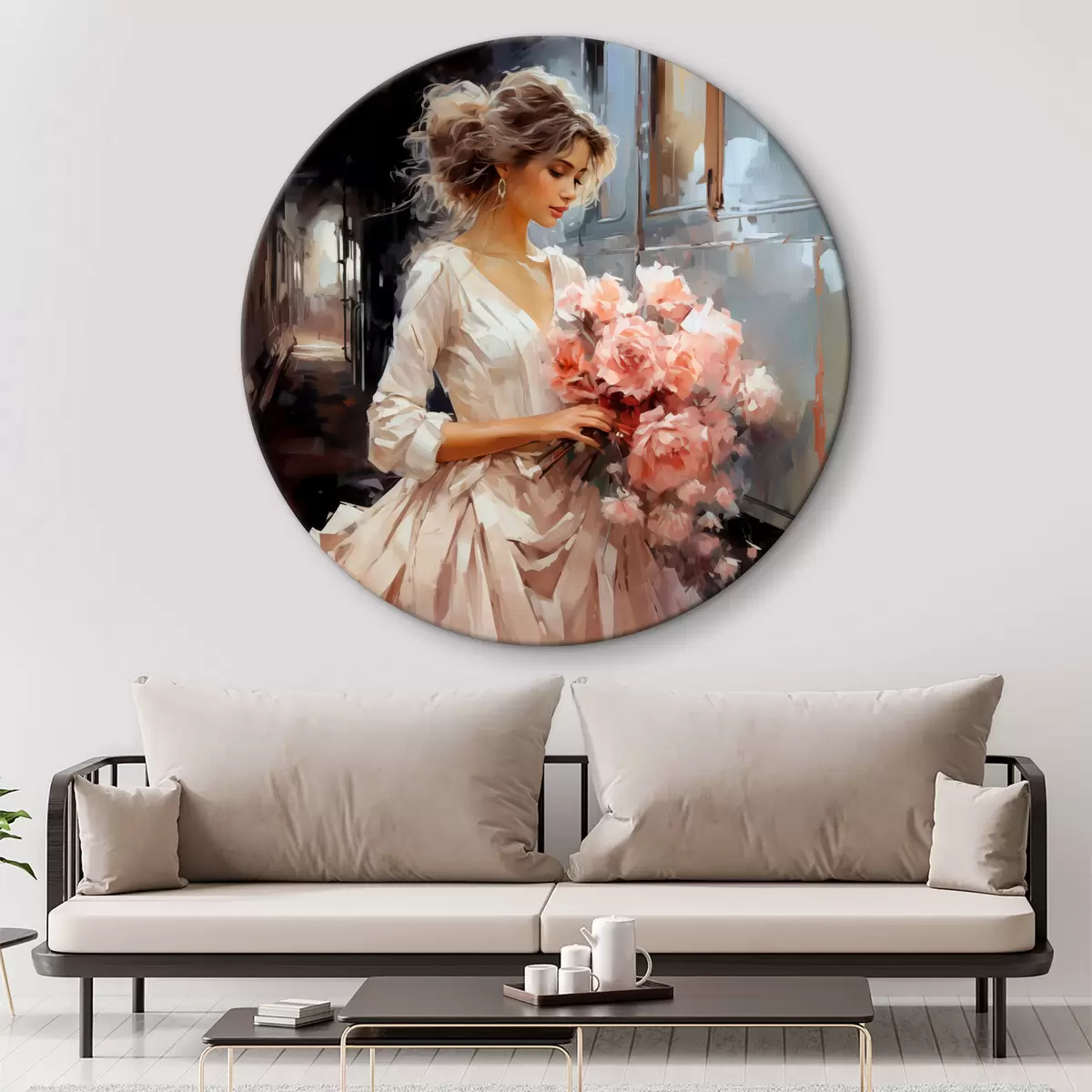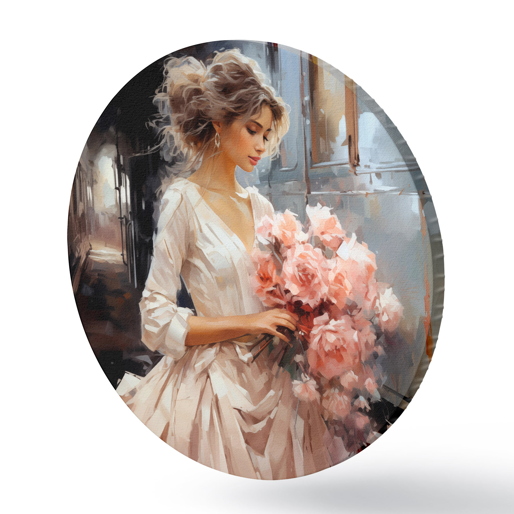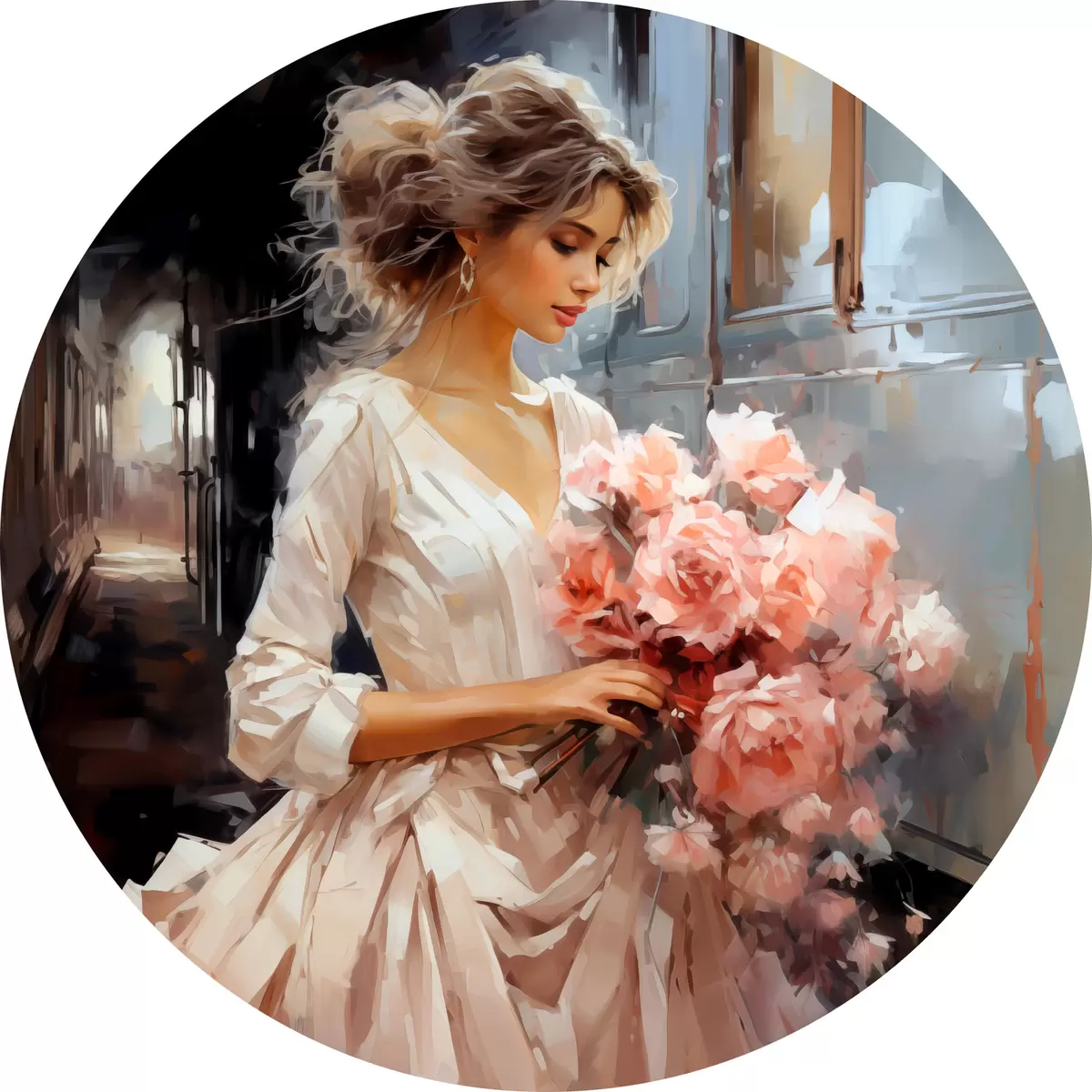 Apaļas gleznas Meitene baltā kleitā stacijā tur rokās rozā rožu pušķi, eļļas glezna r39438
