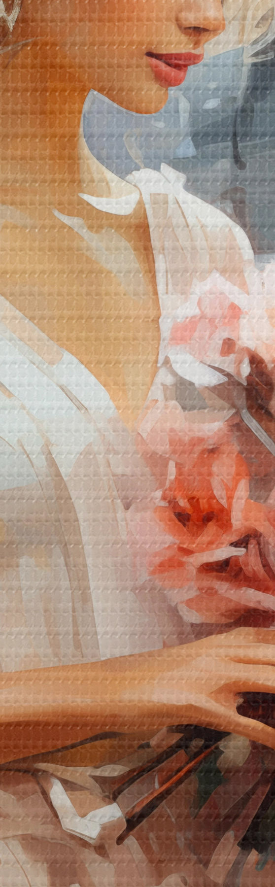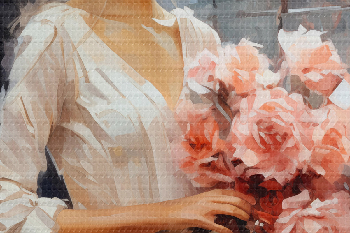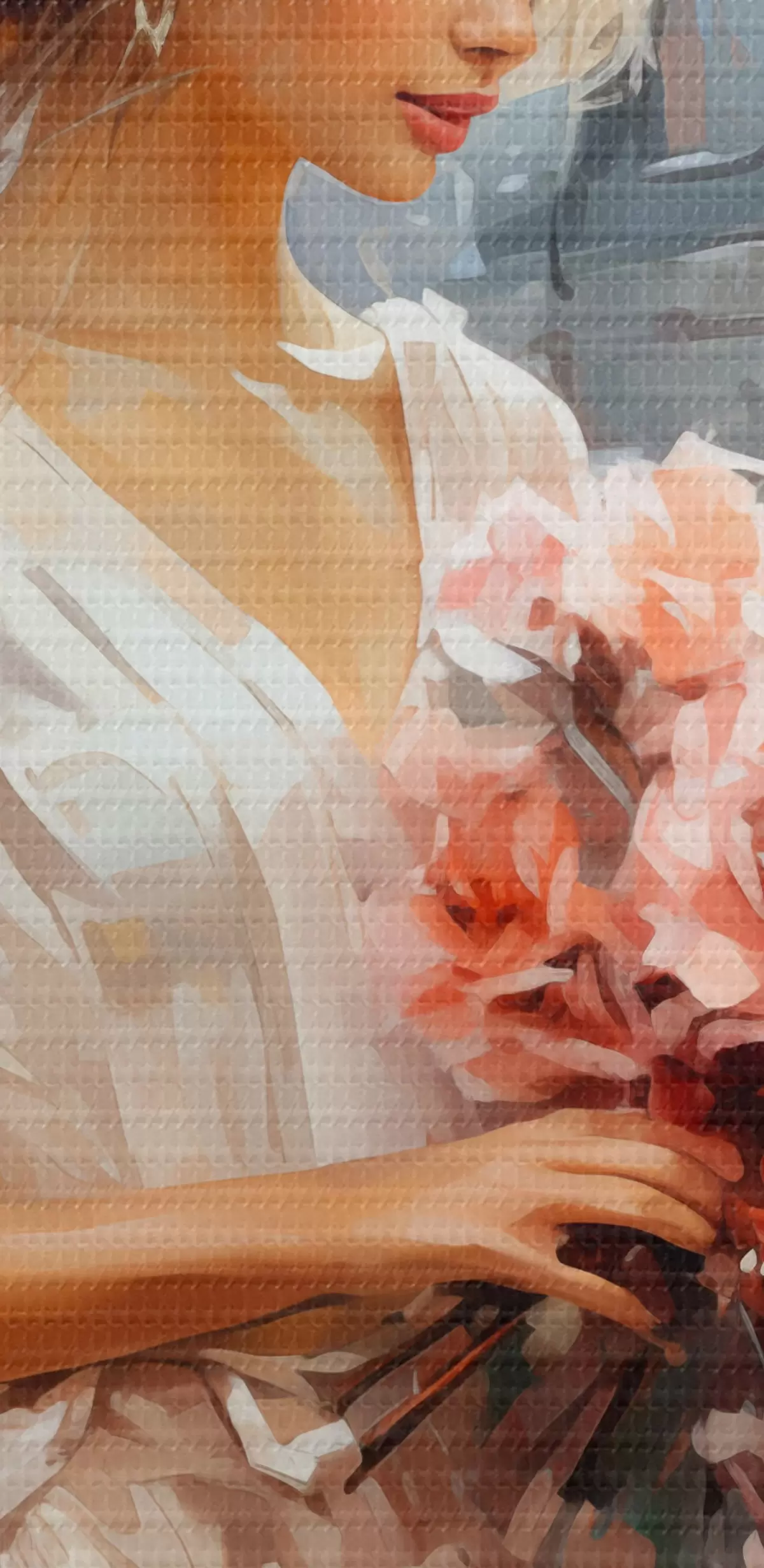 Attēls Meitene baltā kleitā stacijā tur rokās rozā rožu pušķi, eļļas glezna Nr r39438
