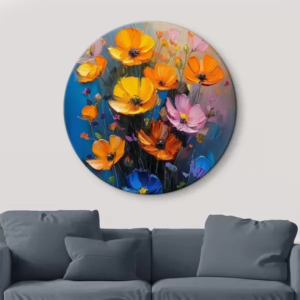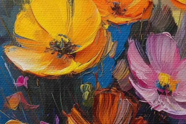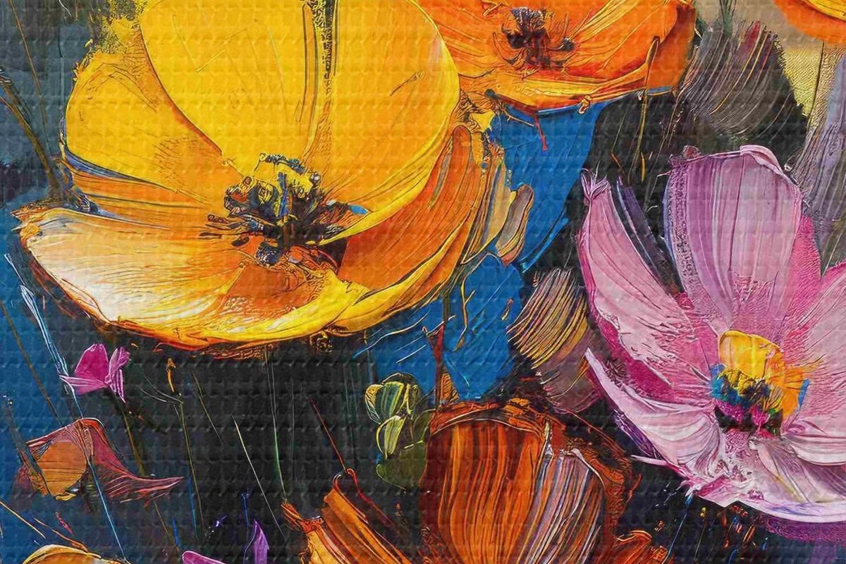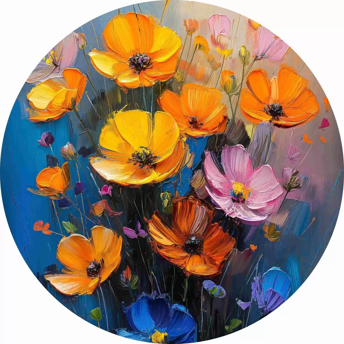 Attēls Gleznota simfonija: gaiši dzeltenas, oranžas, rozā un zilas magones ar otu Nr r39454