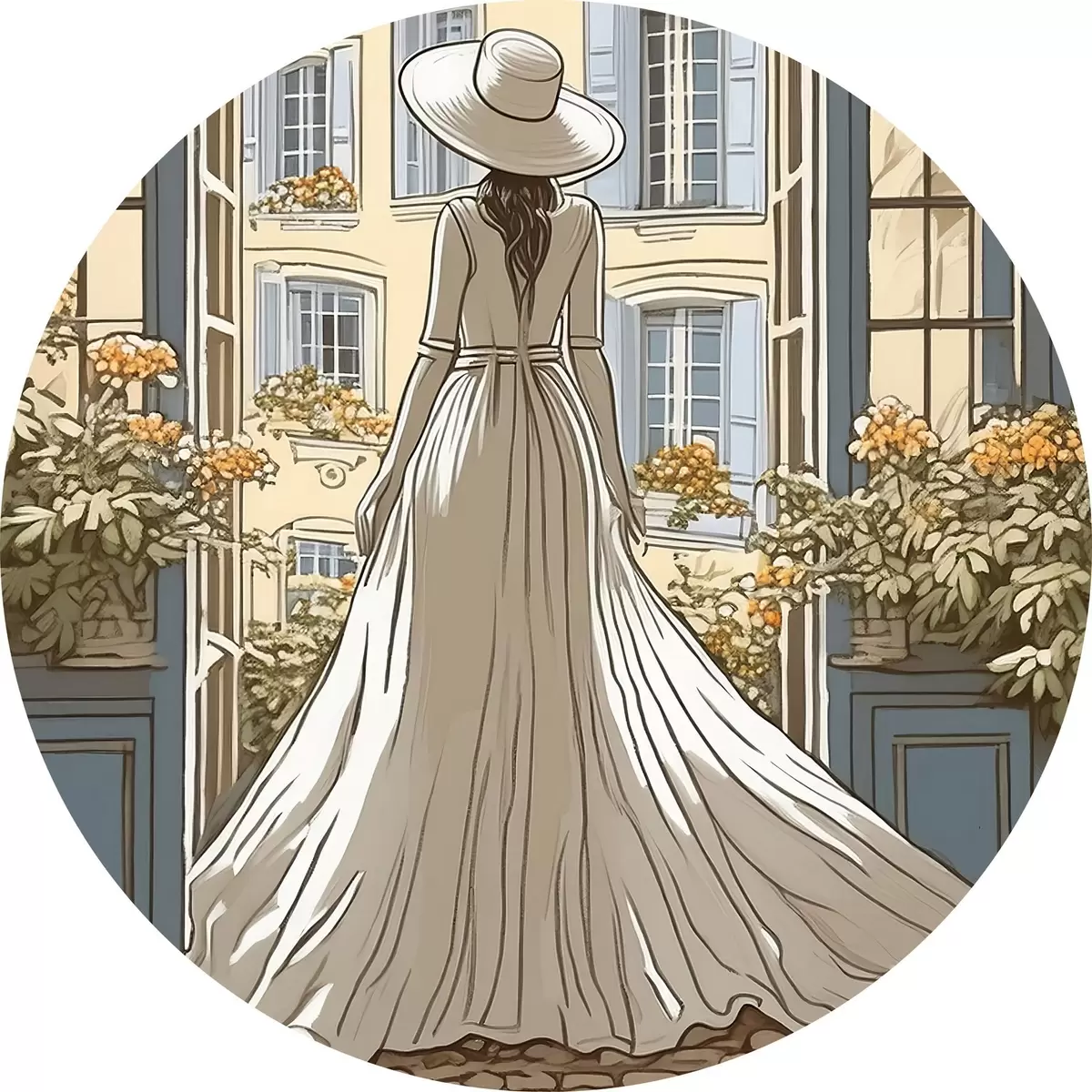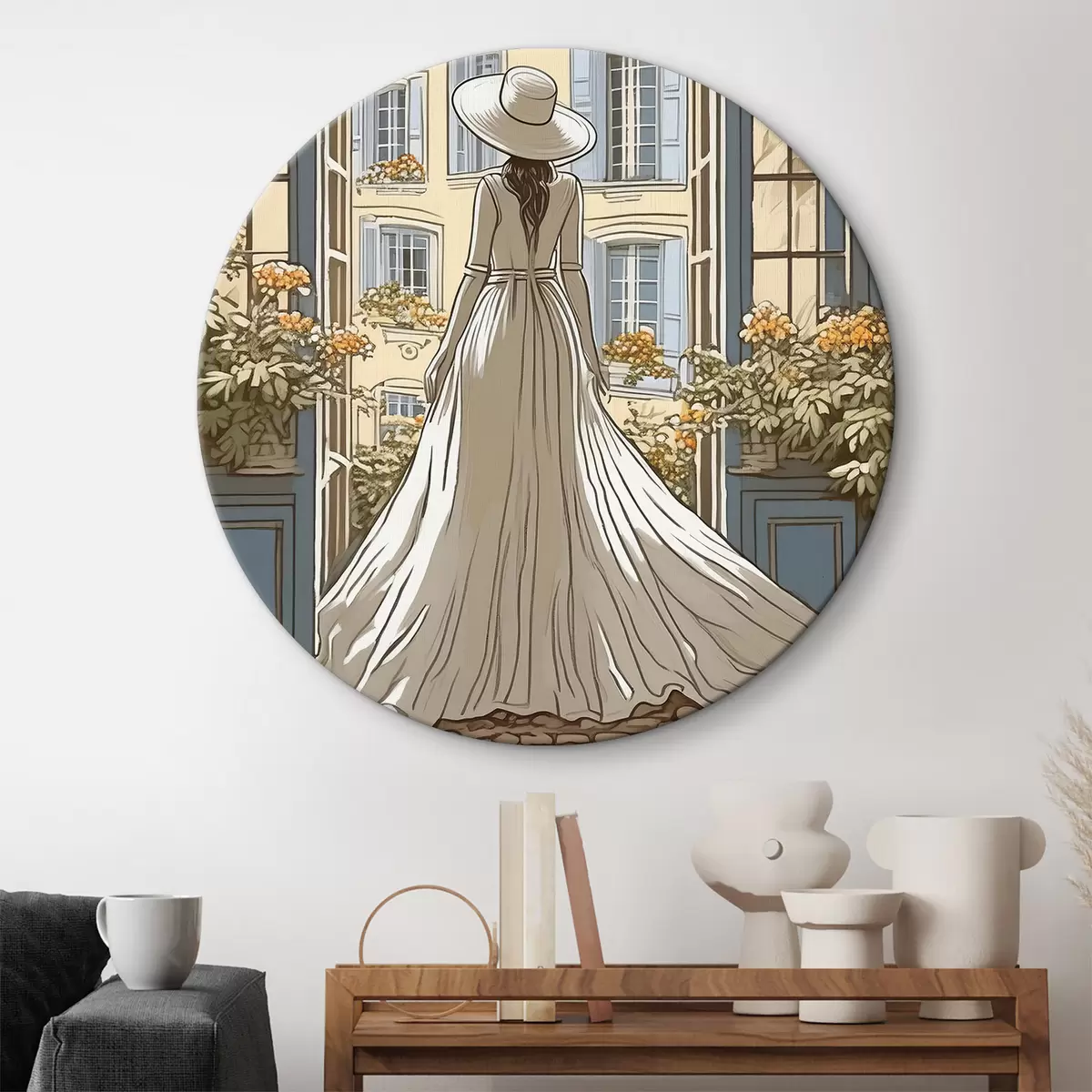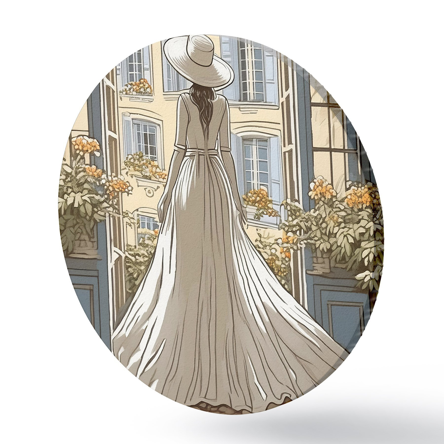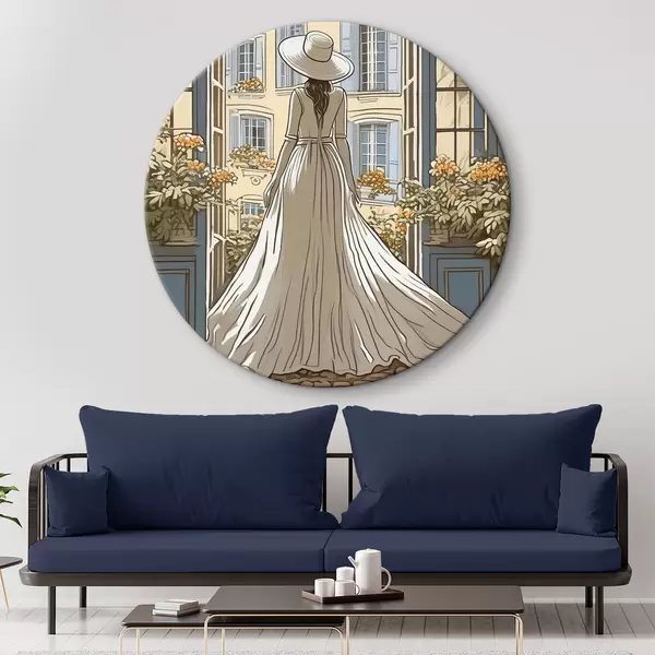 Apaļas gleznas meitenes siluets baltā kleitā pie loga r39479