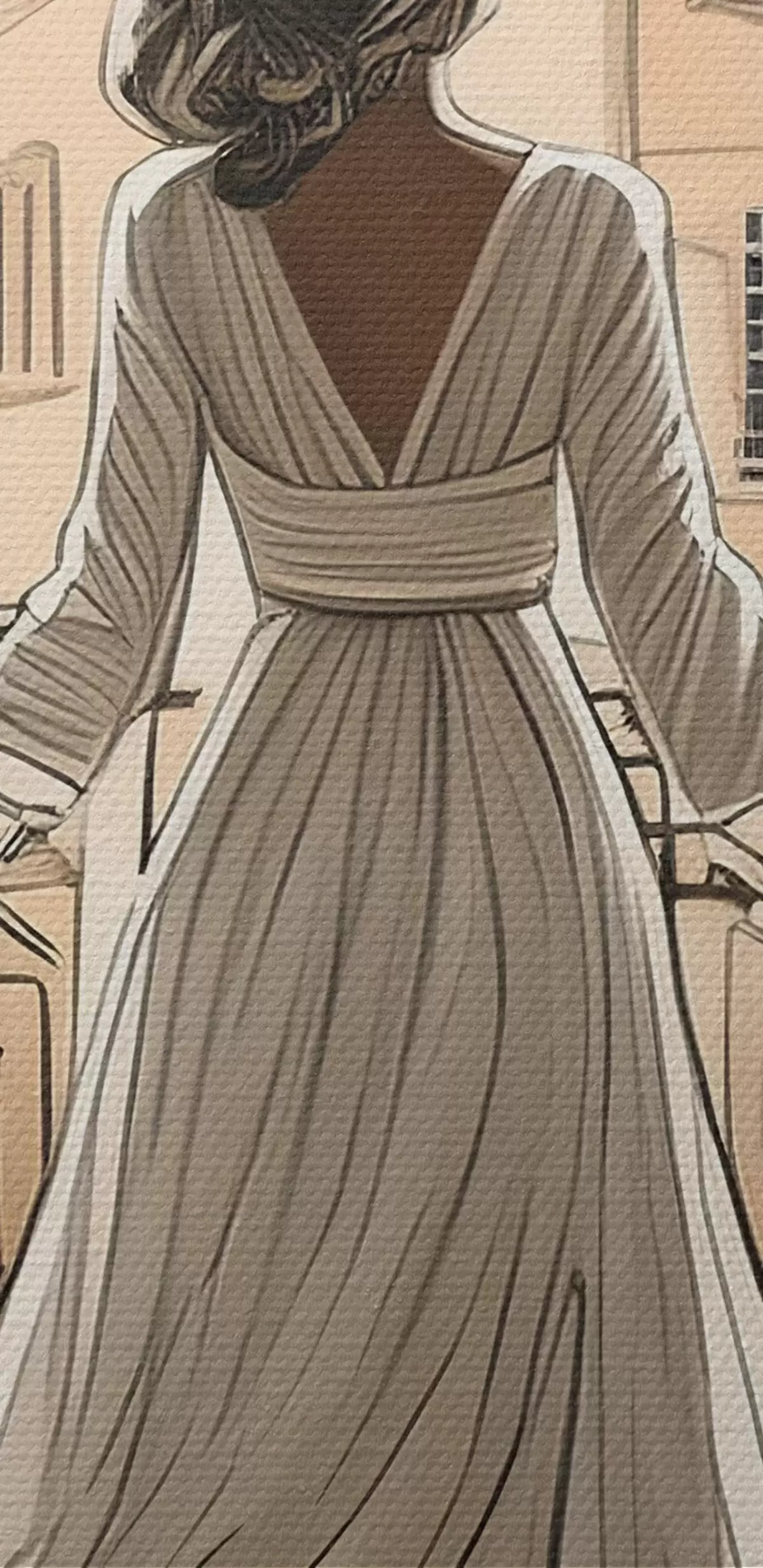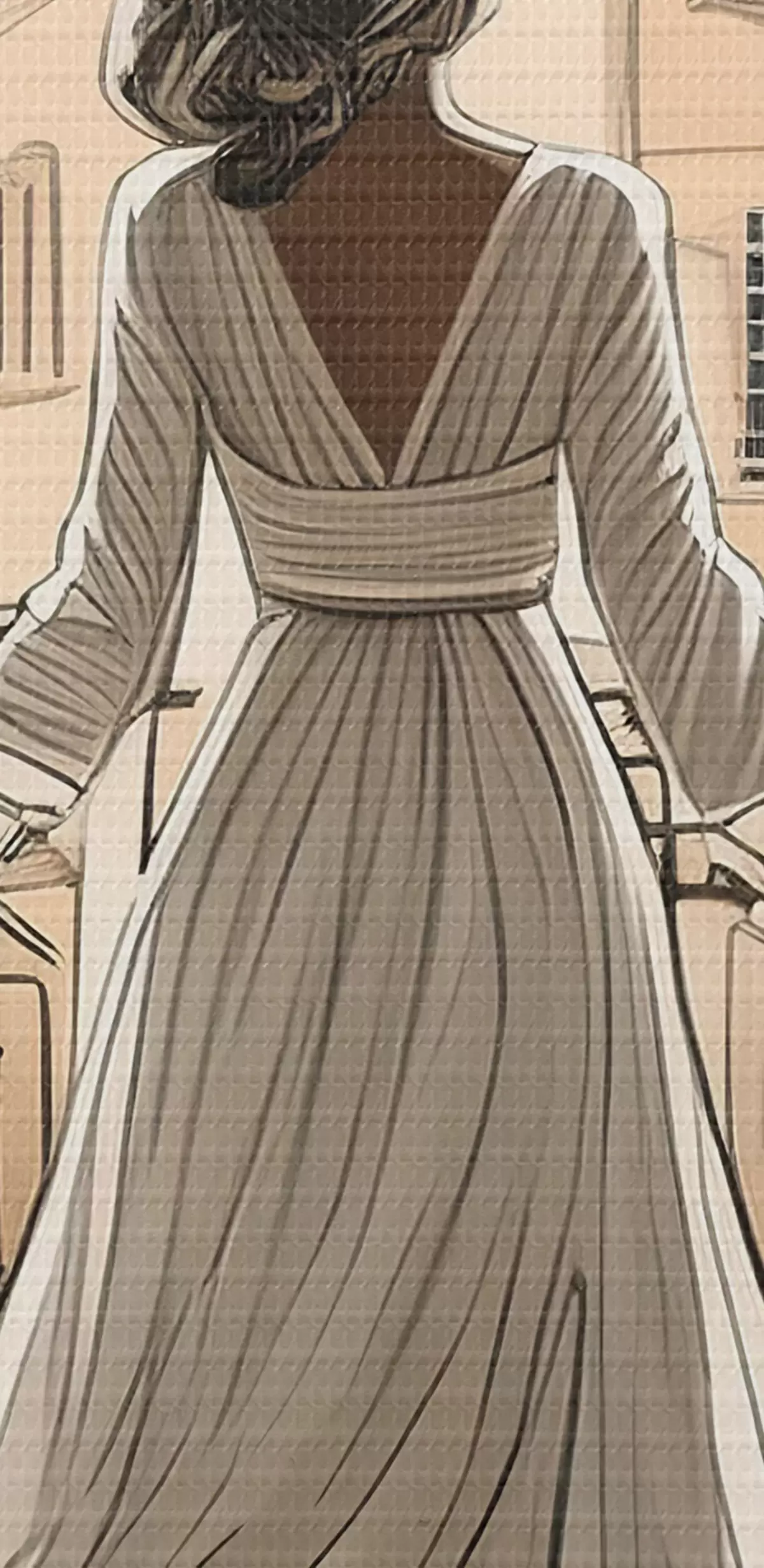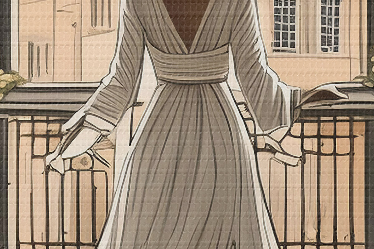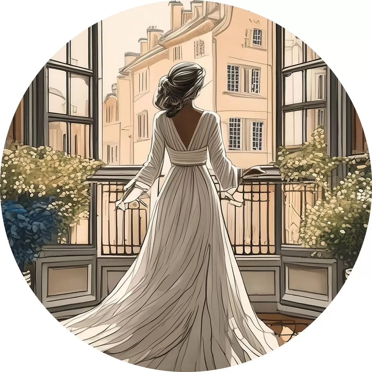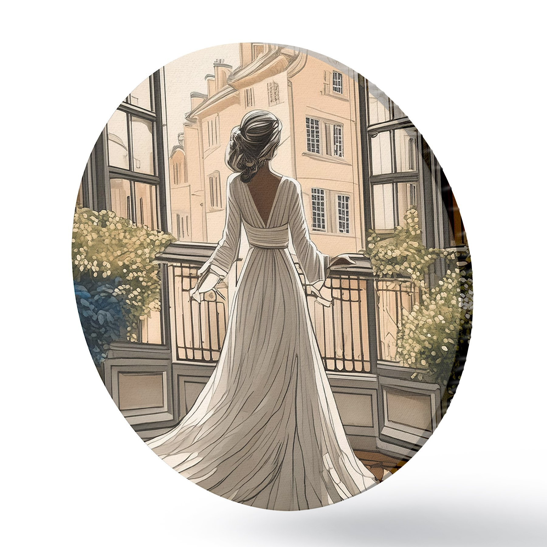 Apaļas gleznas meitenes siluets baltā kleitā pie liela loga r39480