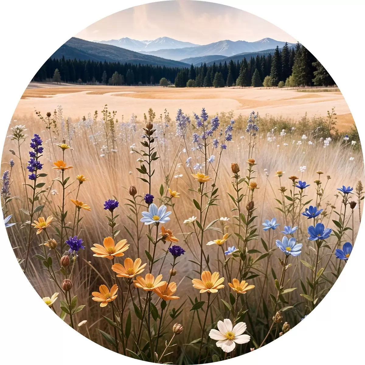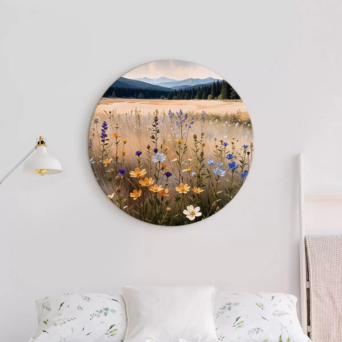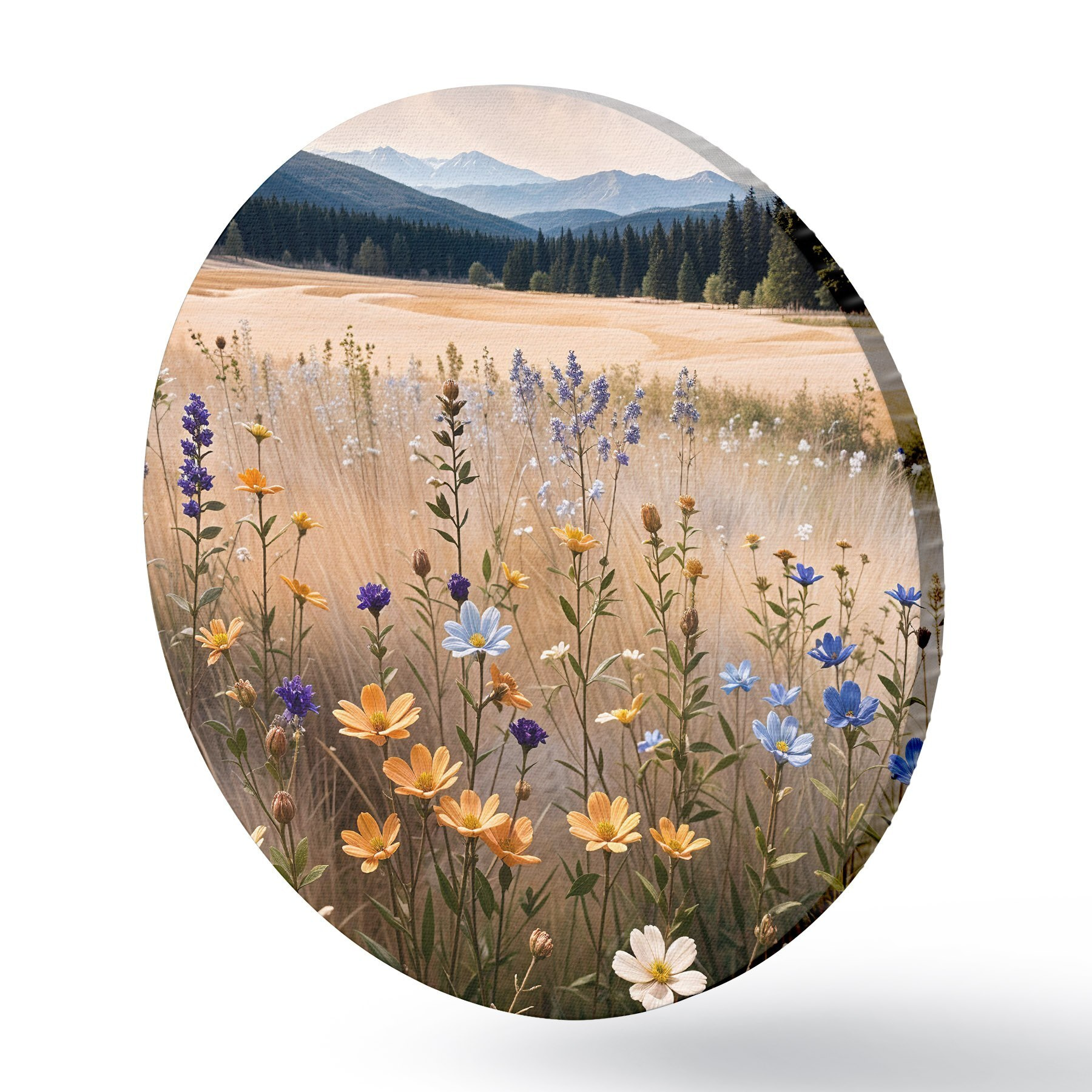 Apaļas gleznas Priekšplānā krāsainu savvaļas ziedu lauks ar ezeru un kalniem fonā r39502