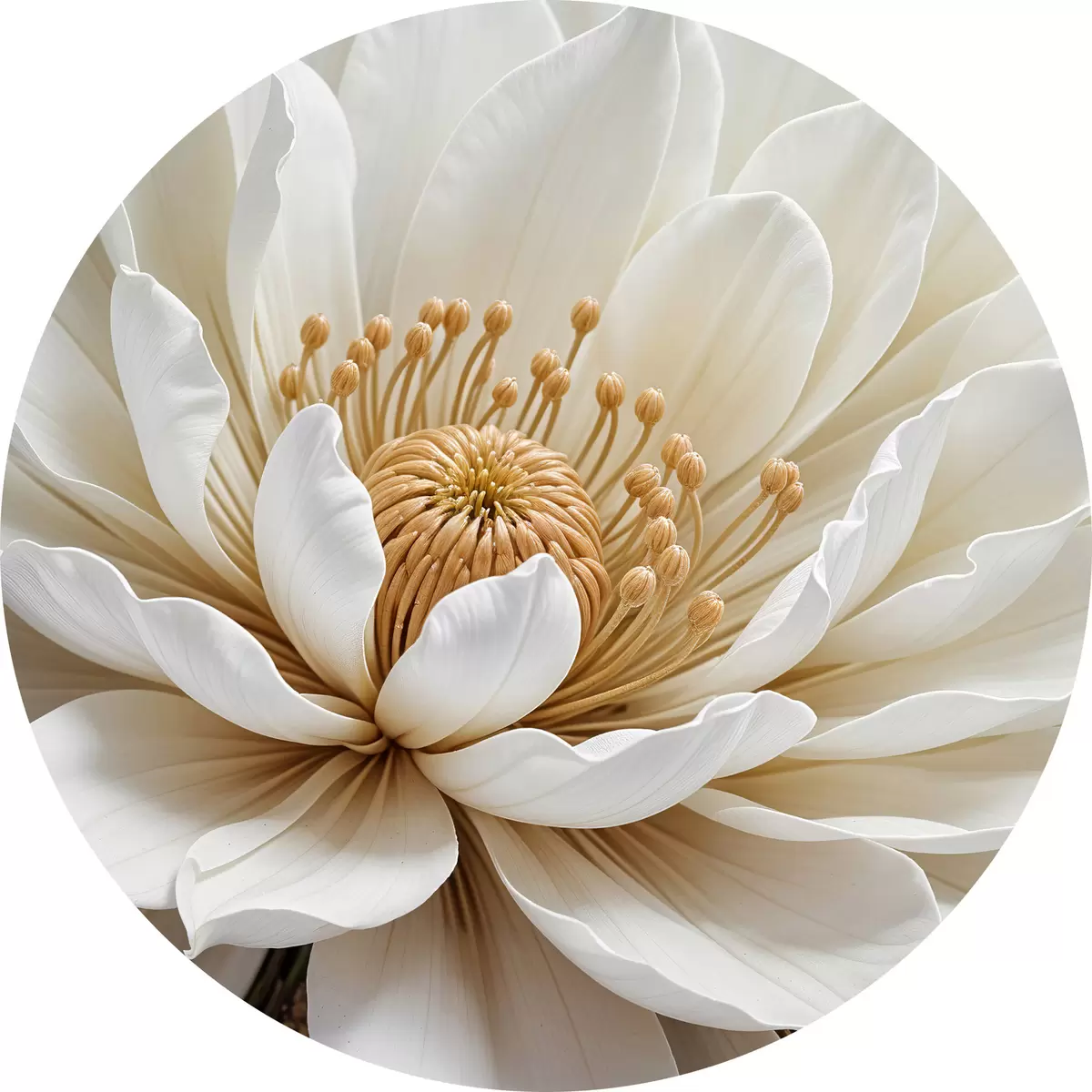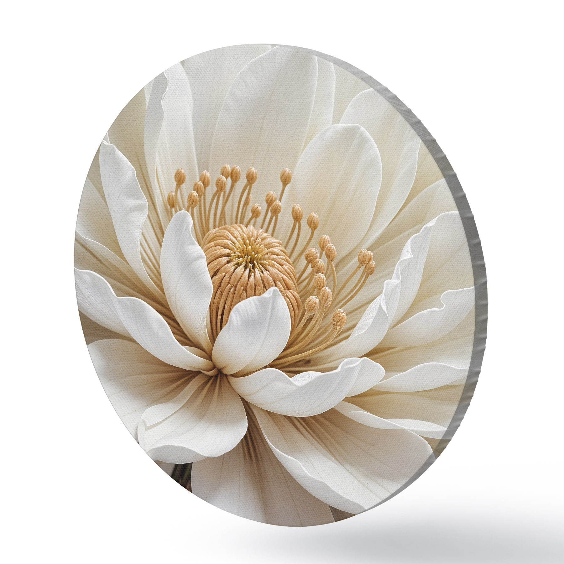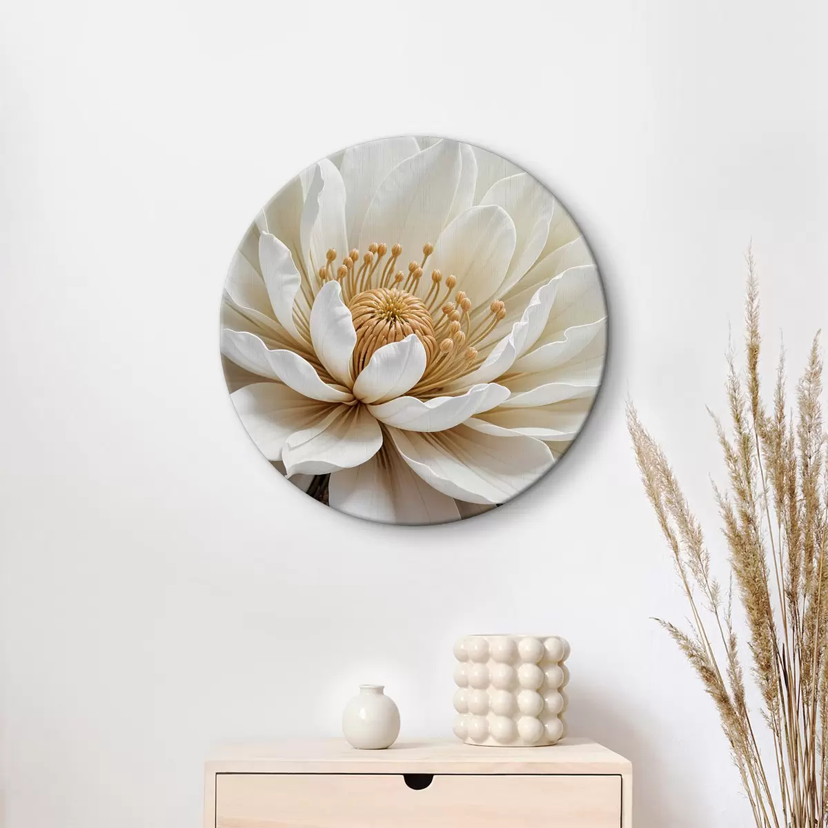 Apaļas gleznas Liela, balta dālijas zieda tuvplāns ar smalkām ziedlapiņām un koši dzeltenu centru r39508