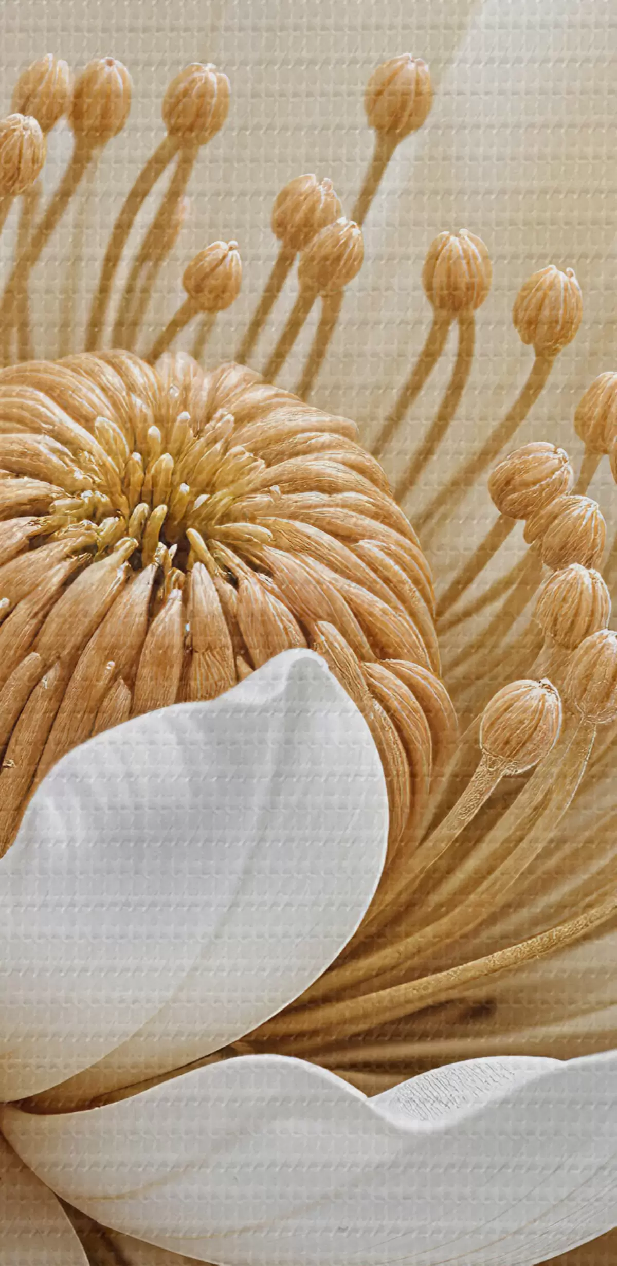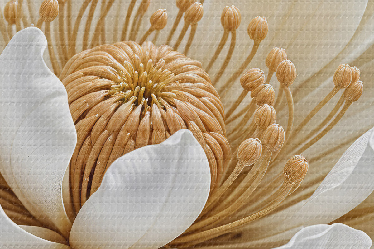 Attēls Liela, balta dālijas zieda tuvplāns ar smalkām ziedlapiņām un koši dzeltenu centru Nr r39508