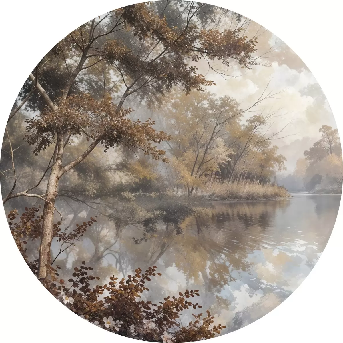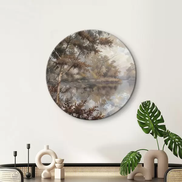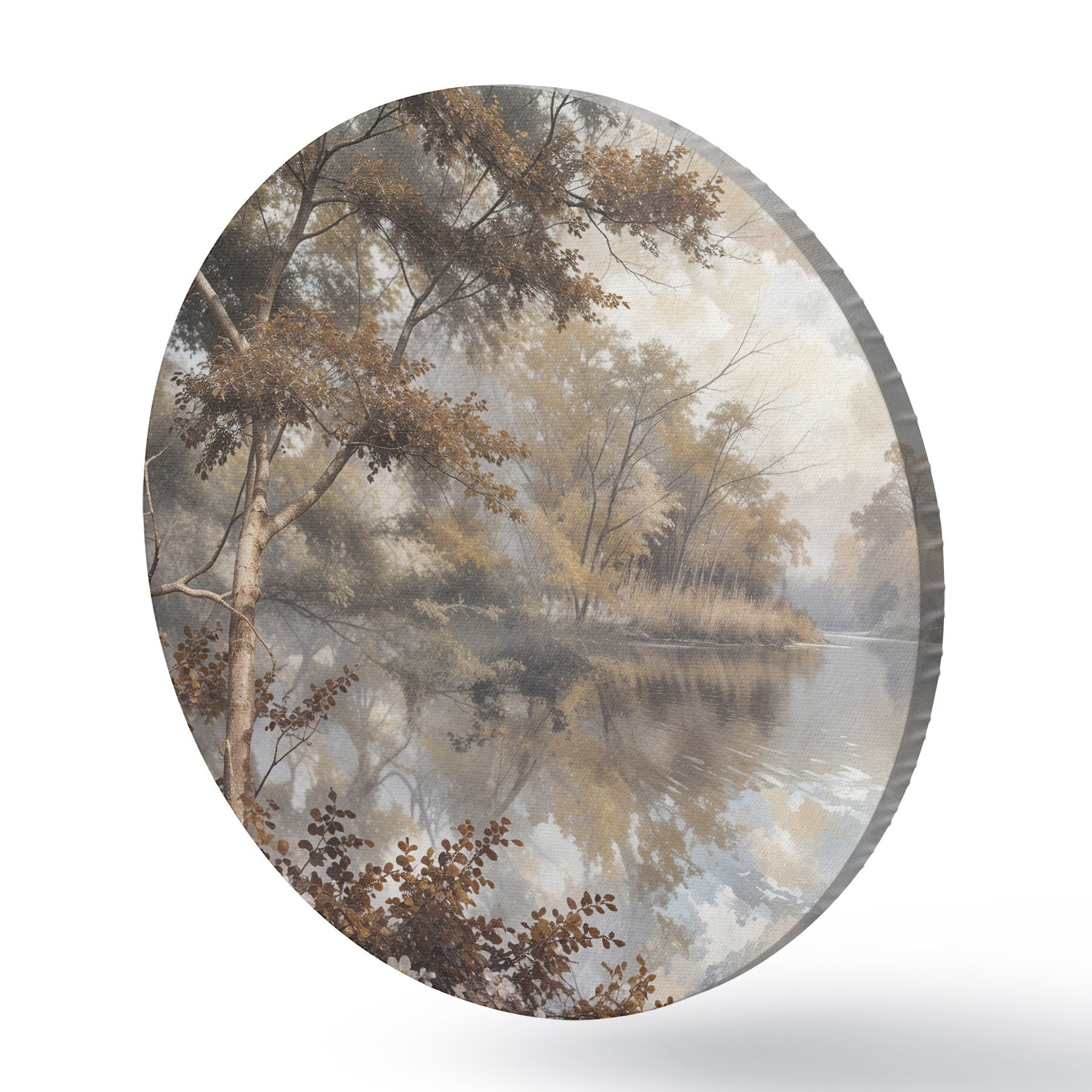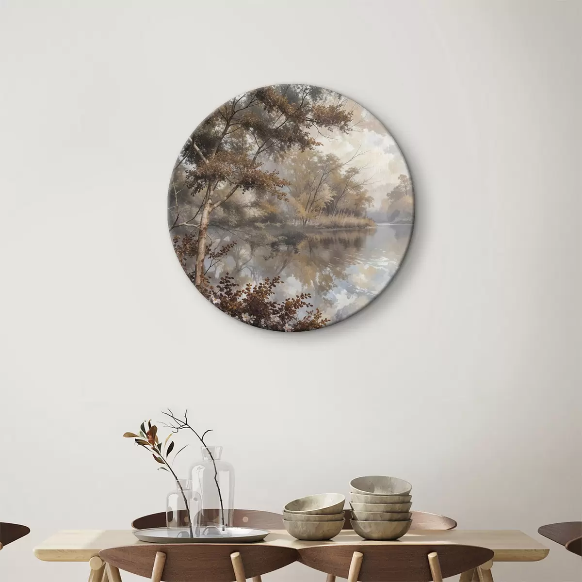 Apaļas gleznas Rudens ainava ar mierīgu ezeru, ko ieskauj koki ar košiem oranžiem un dzelteniem zaļumiem r39511