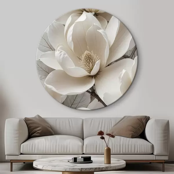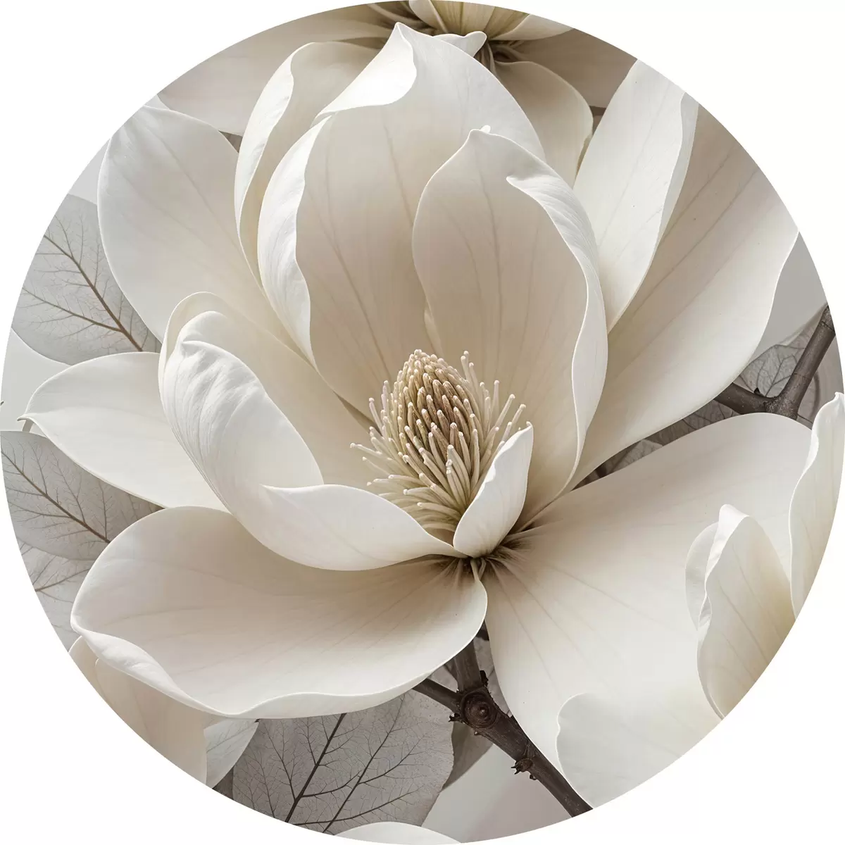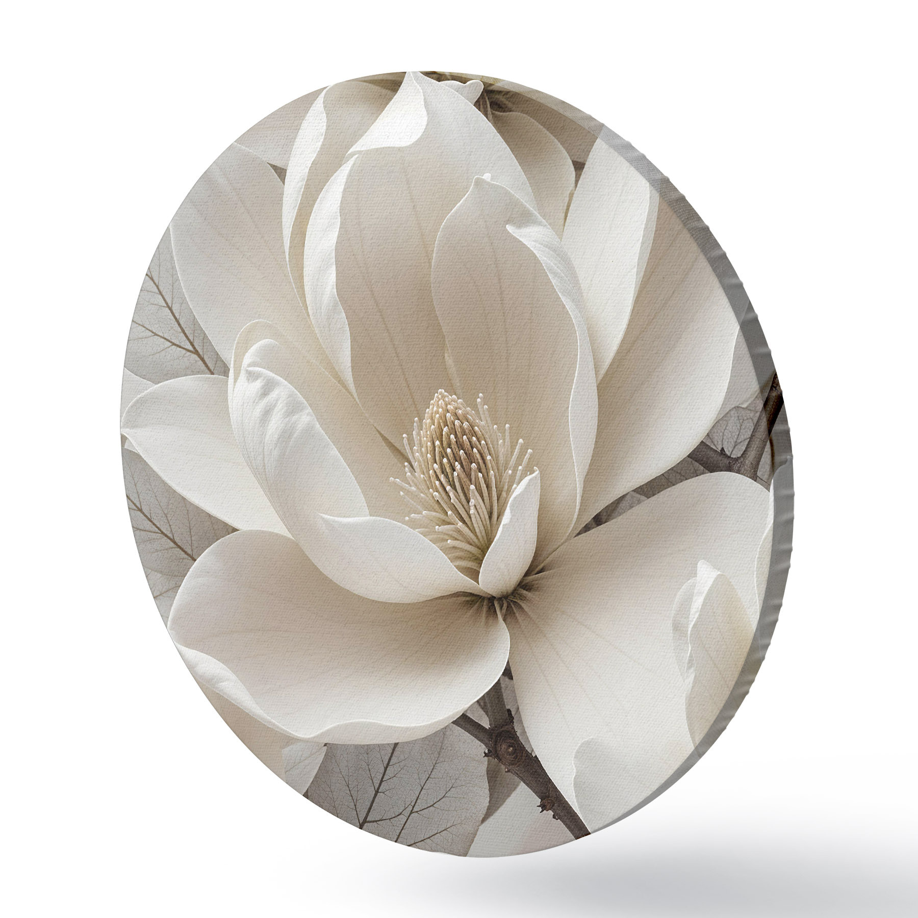 Apaļas gleznas Balts magnolijas zieds ar maigiem ziedlapiņām, ko ieskauj zaļas lapas uz gaiša fona r39527