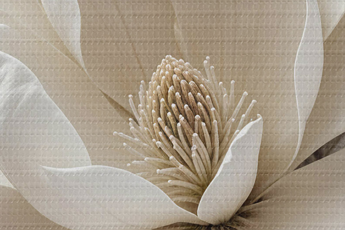 Attēls Balts magnolijas zieds ar maigiem ziedlapiņām, ko ieskauj zaļas lapas uz gaiša fona Nr r39527