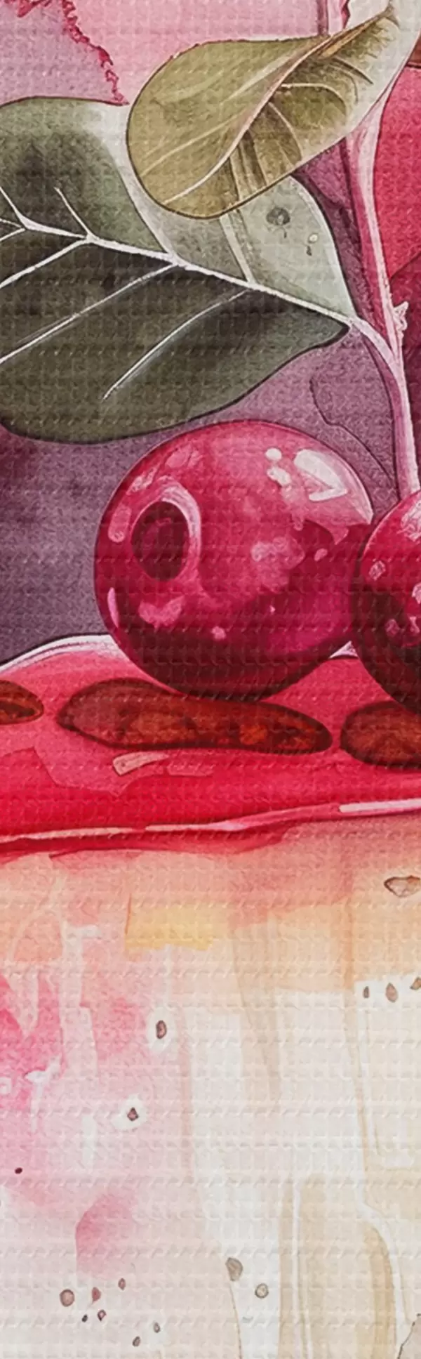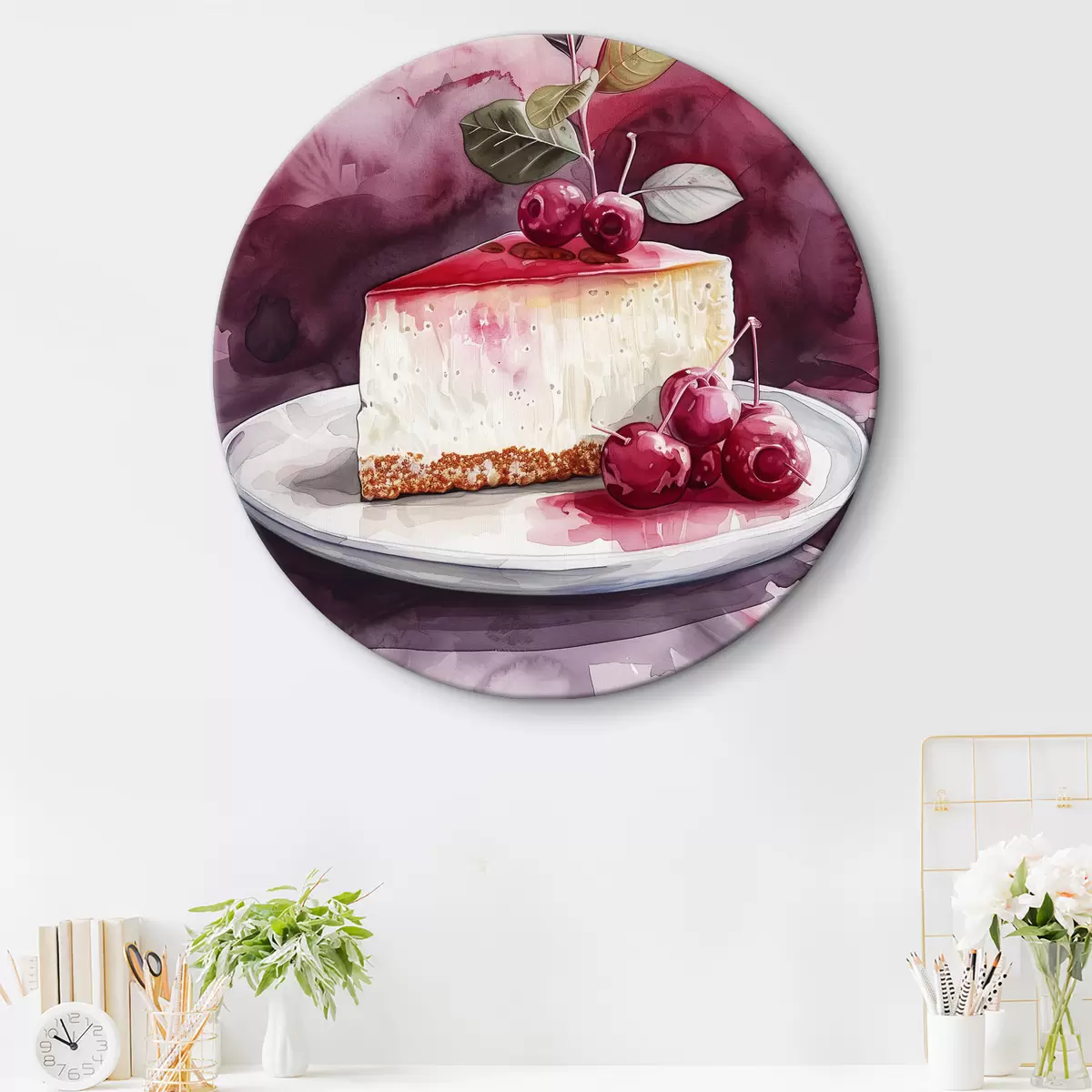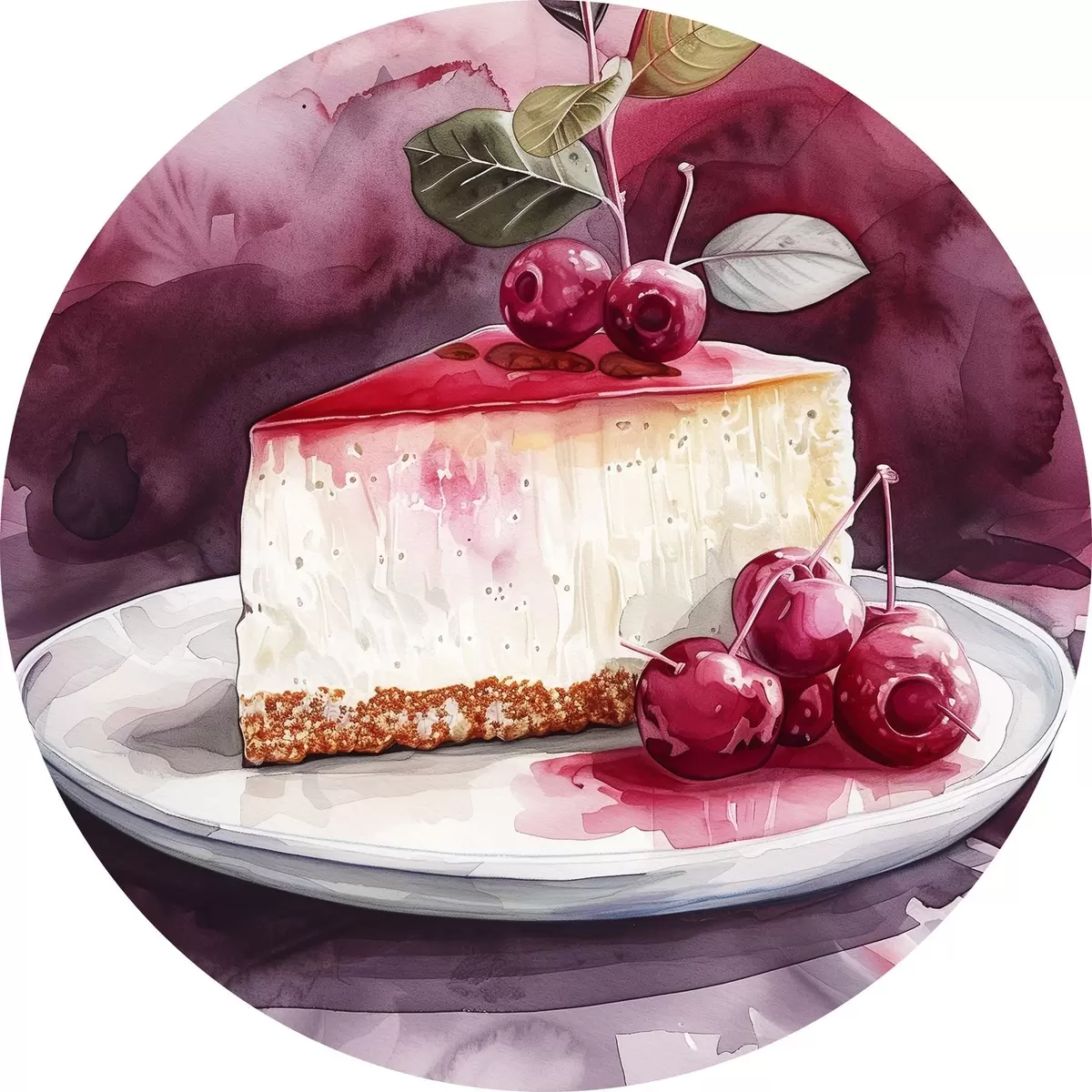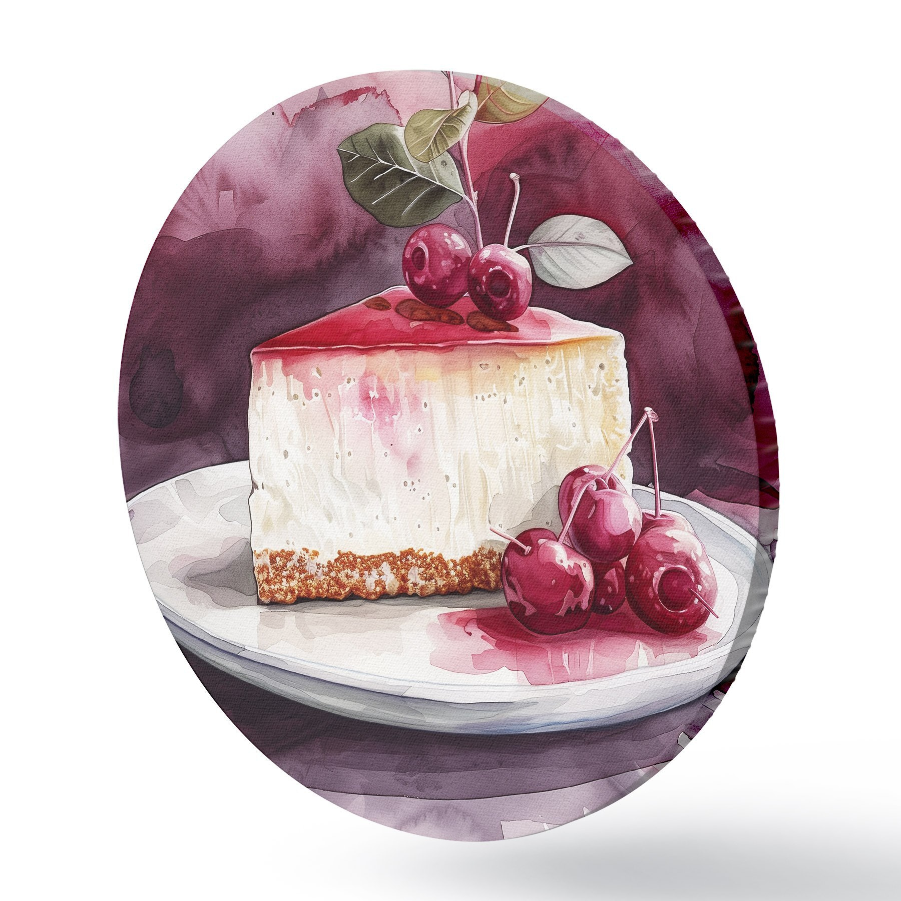 Apaļas gleznas Akvareļu siera kūka ar ķiršiem, elegantu ēdienu mākslu, sarkanā un purpursarkanā krāsā r39700
